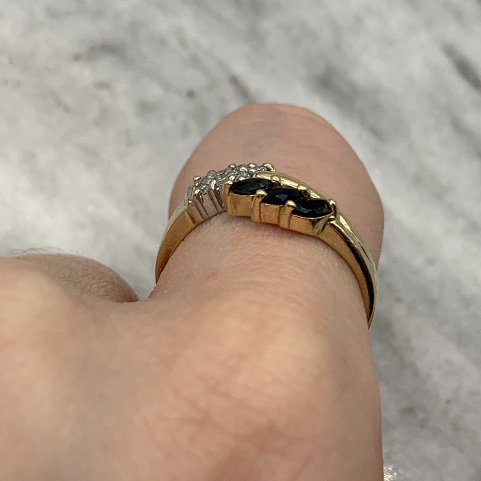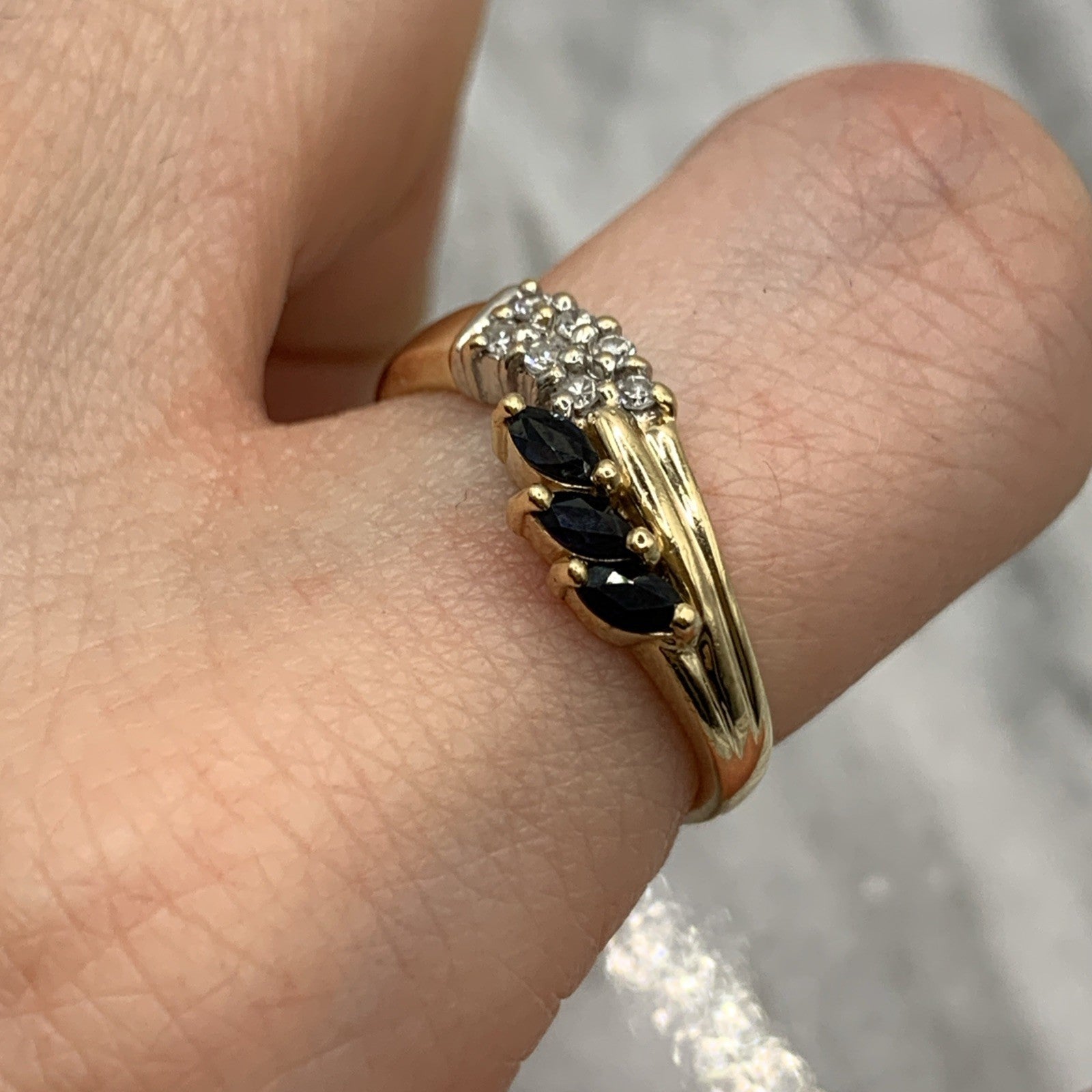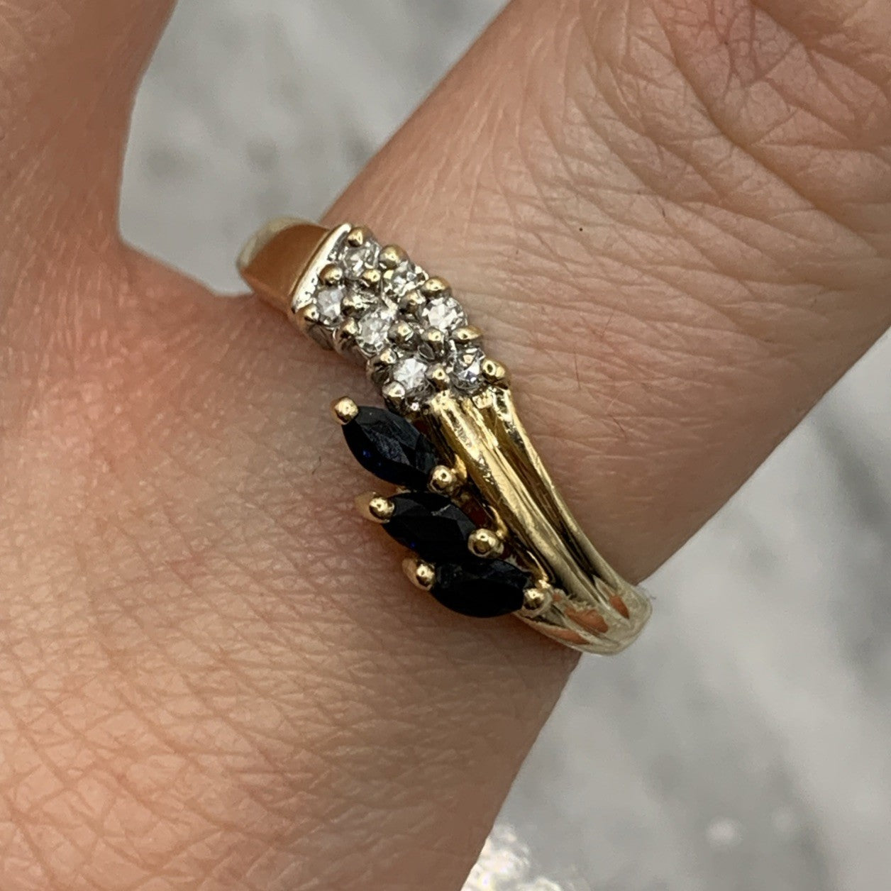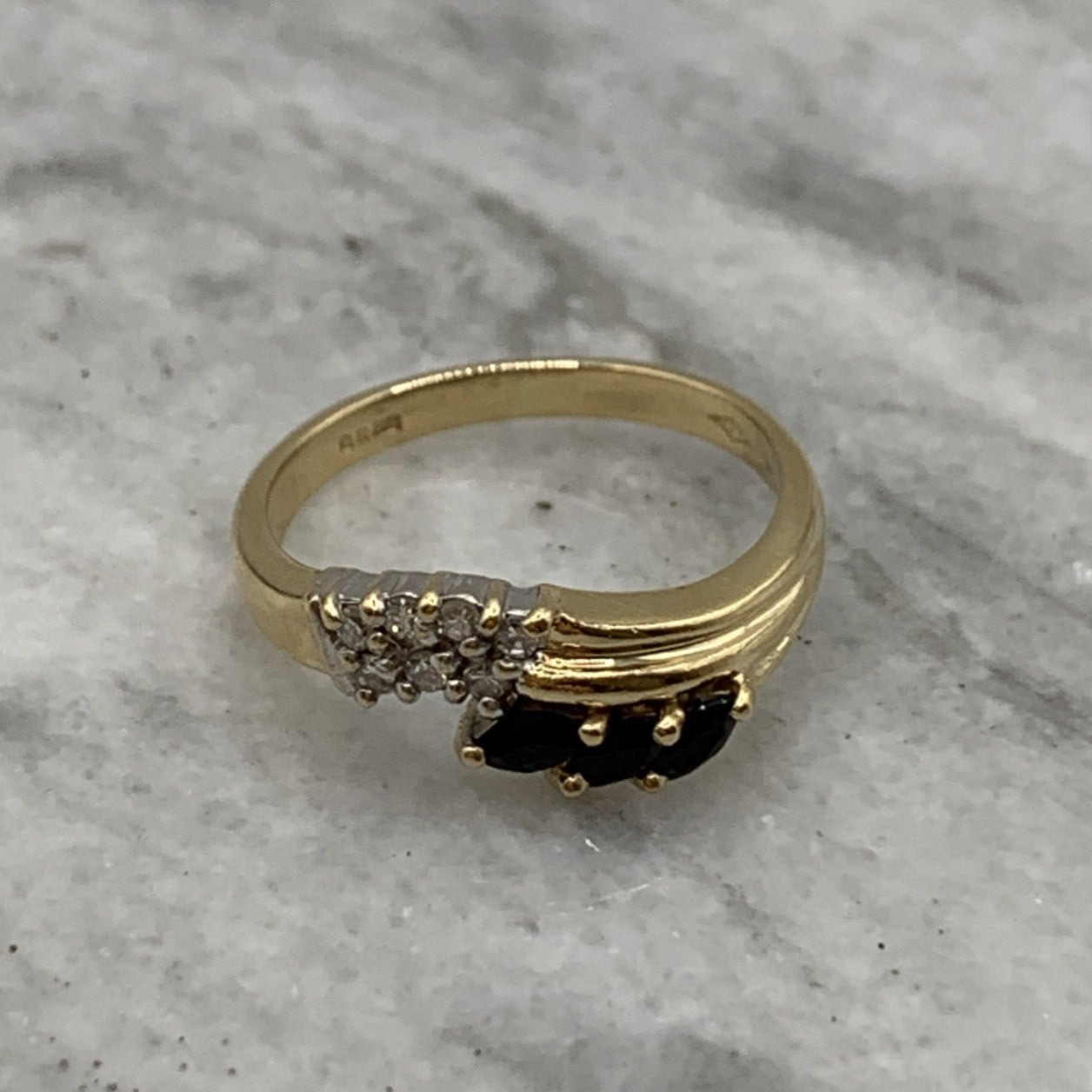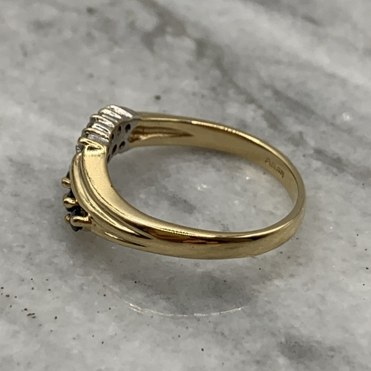 - A charming gold wave band ring featuring a trilogy of marquise cut sapphires, accented by pave set diamonds. Hallmarked.