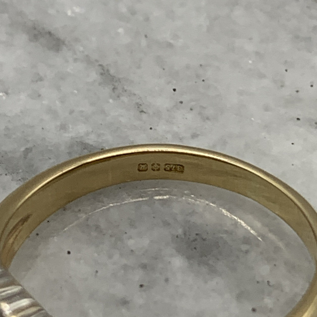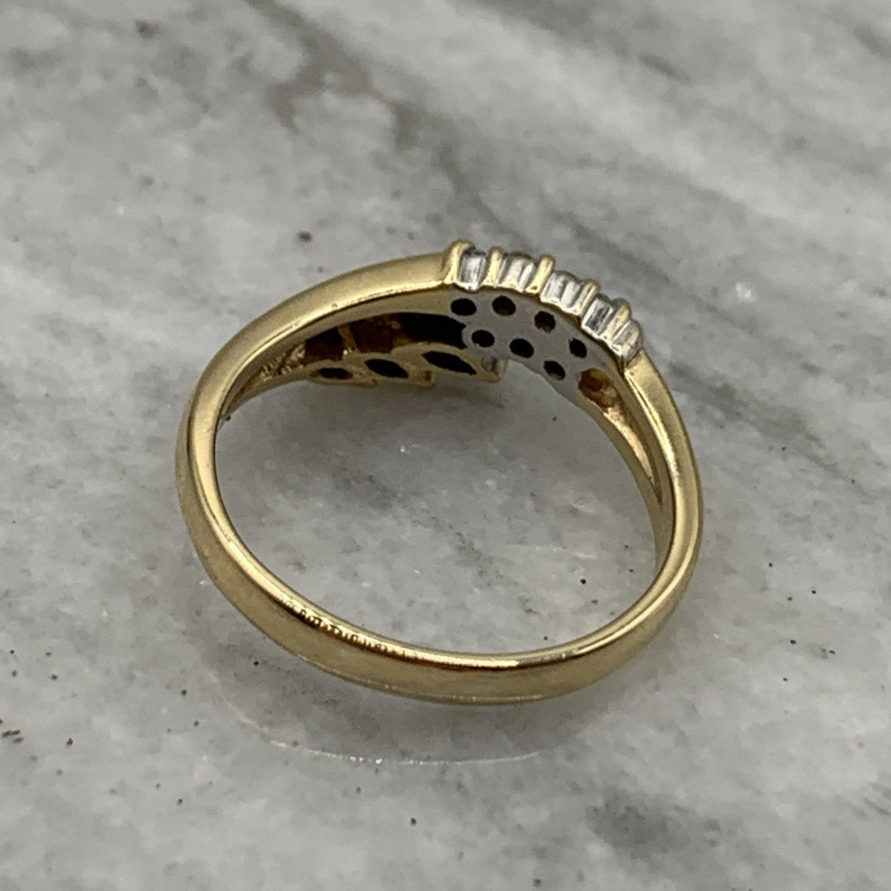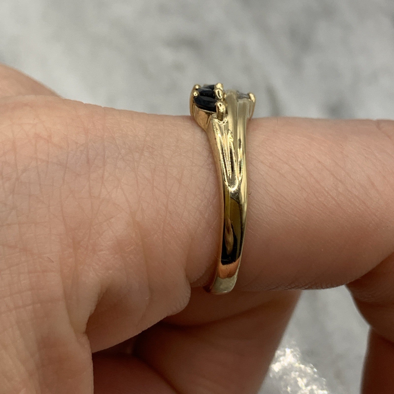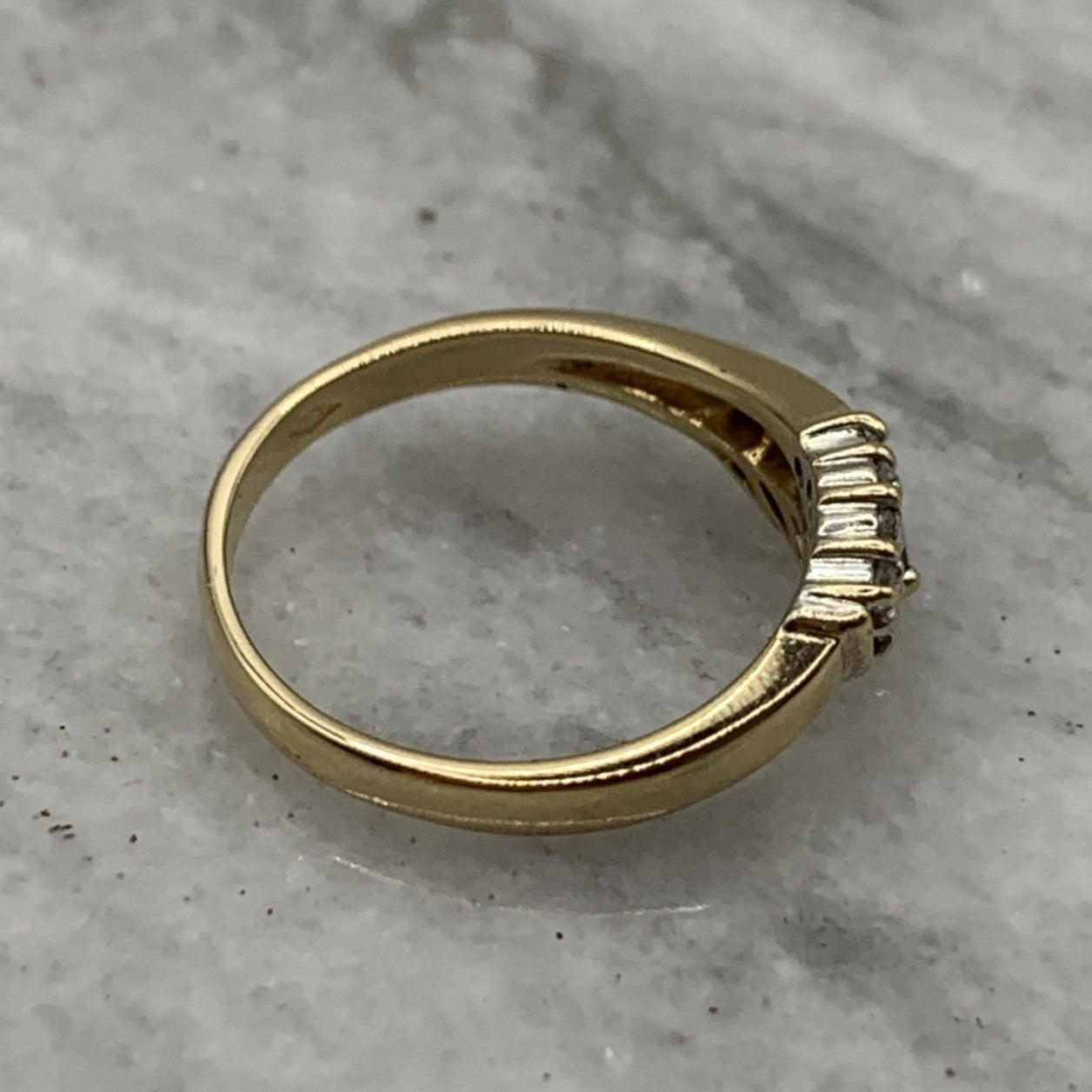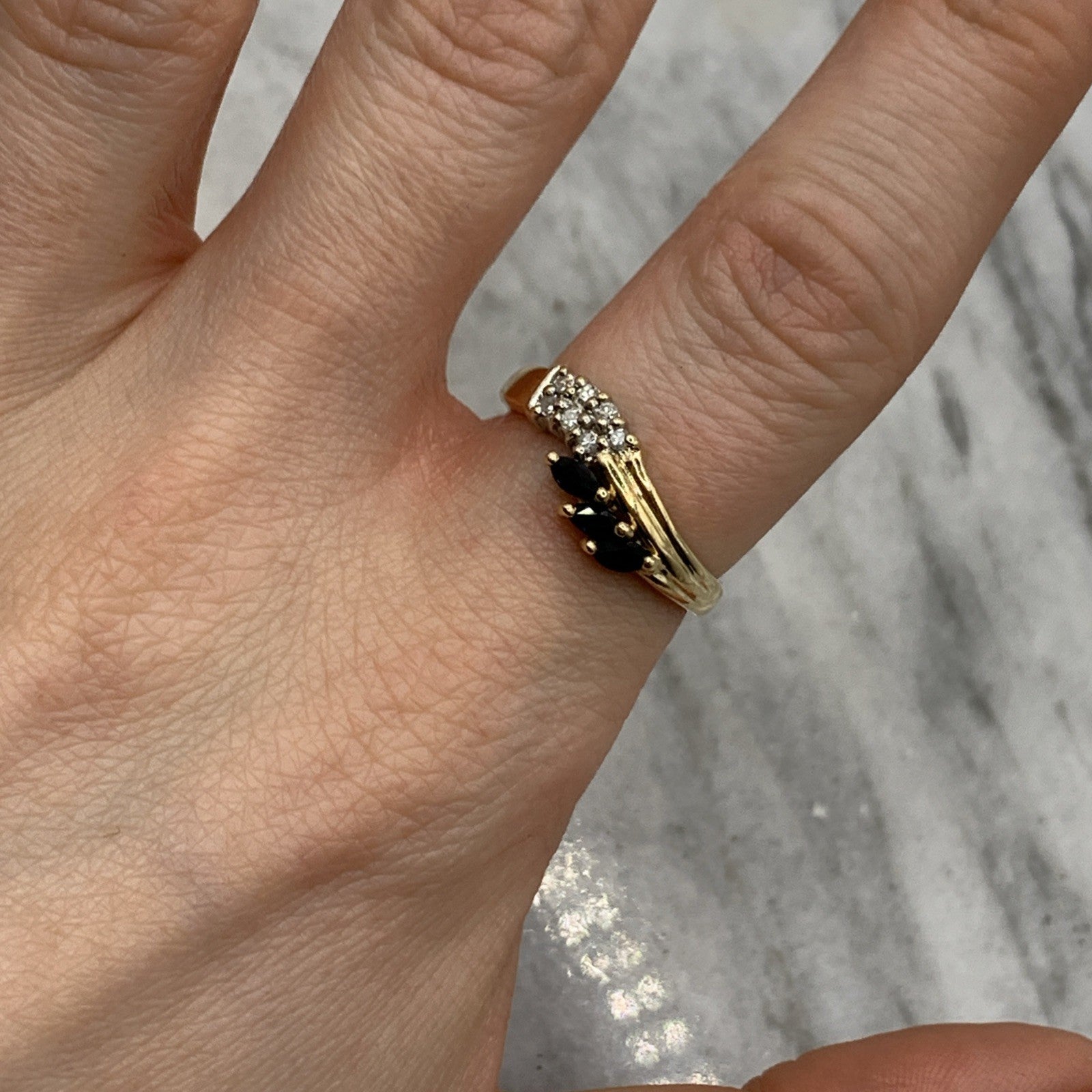 - A charming gold wave band ring featuring a trilogy of marquise cut sapphires, accented by pave set diamonds. Hallmarked.