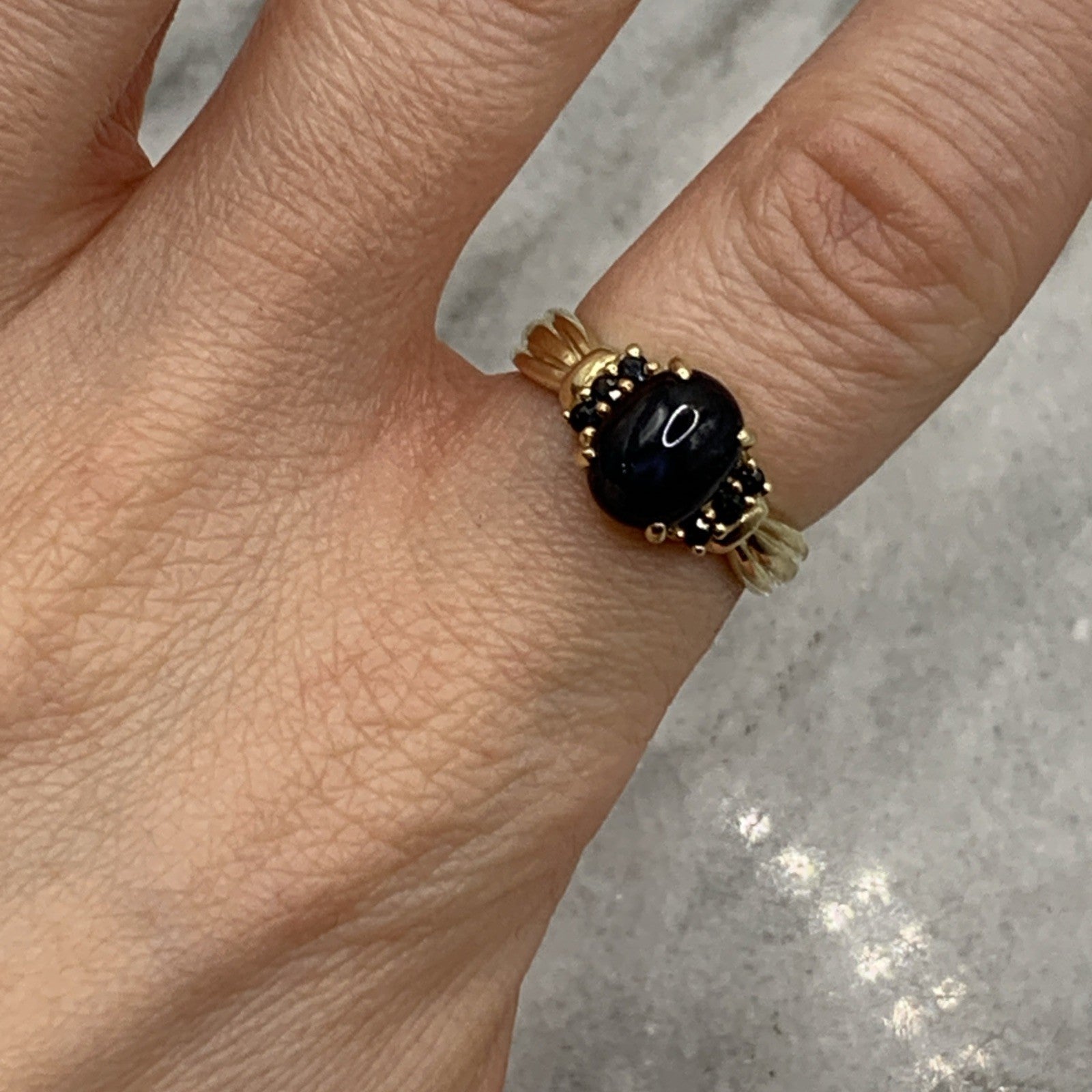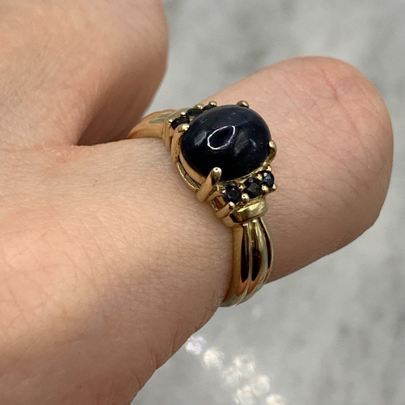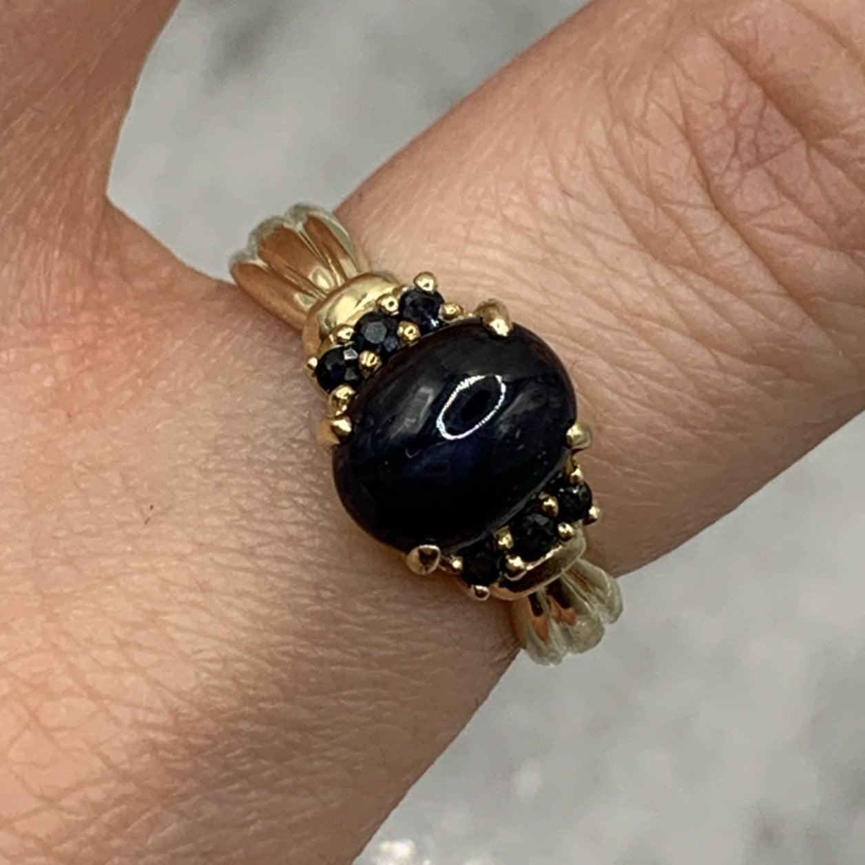 - A beautiful gold ring showcasing a star sapphire cabochon accented by additional petite sapphires. Hallmarked.