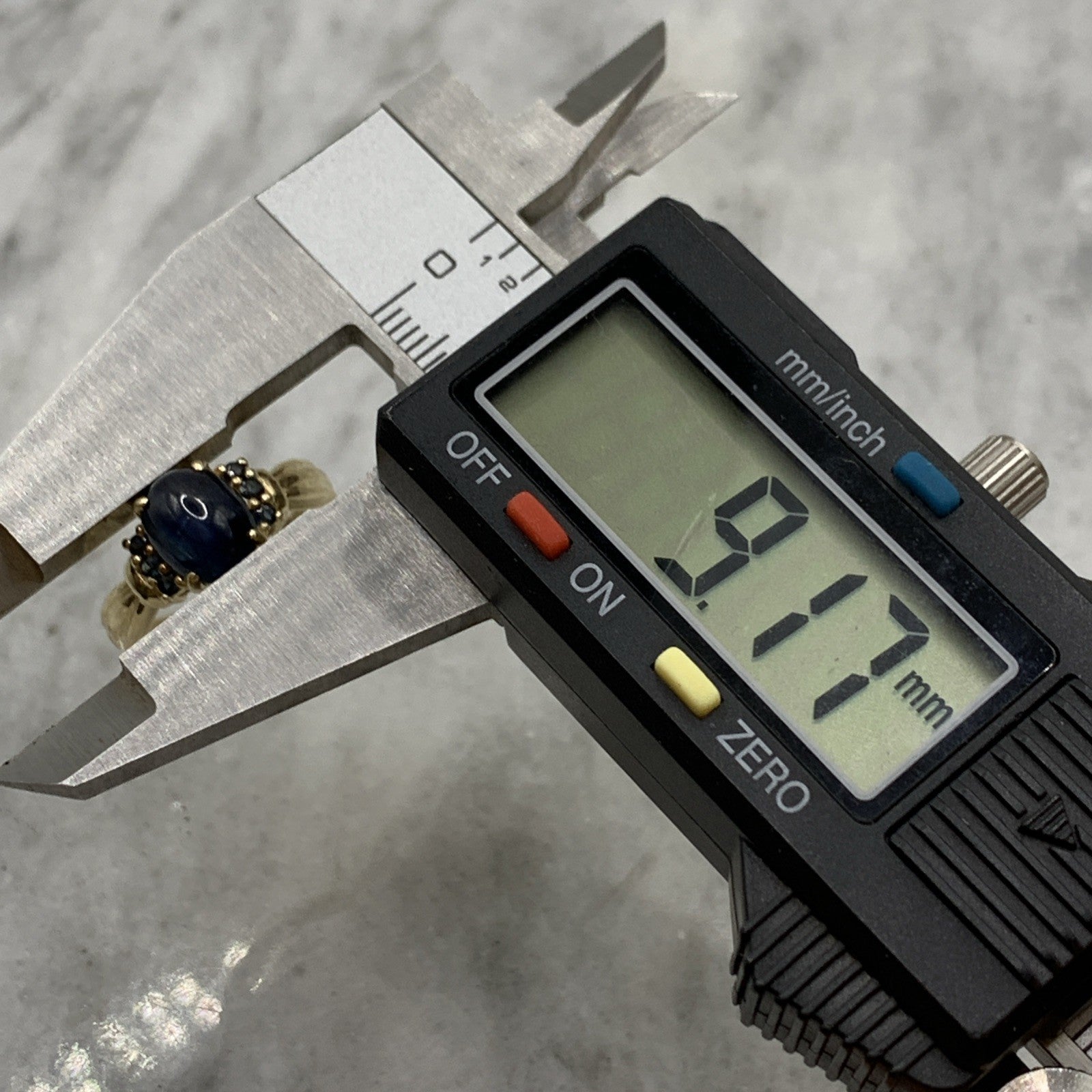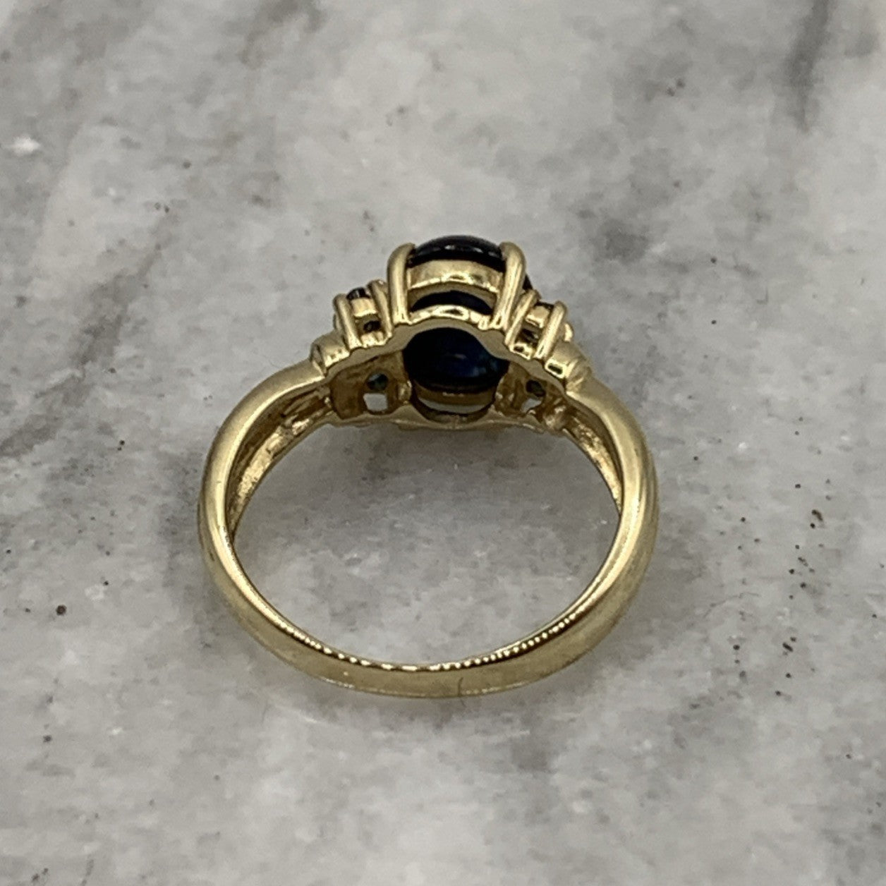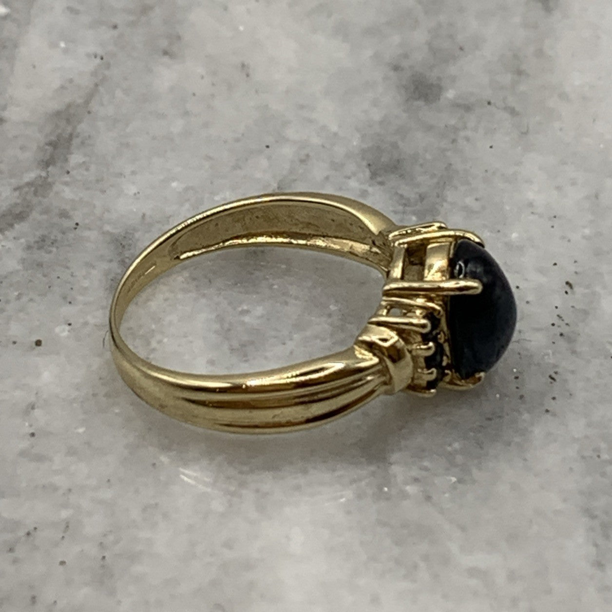 - A beautiful gold ring showcasing a star sapphire cabochon accented by additional petite sapphires. Hallmarked.