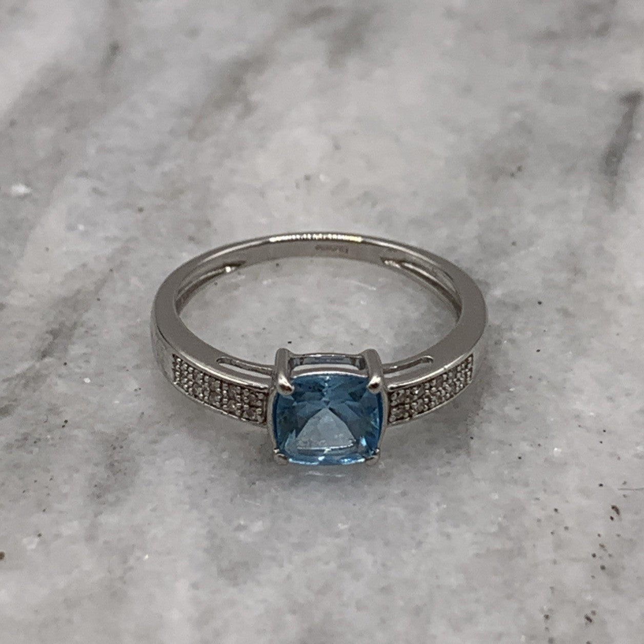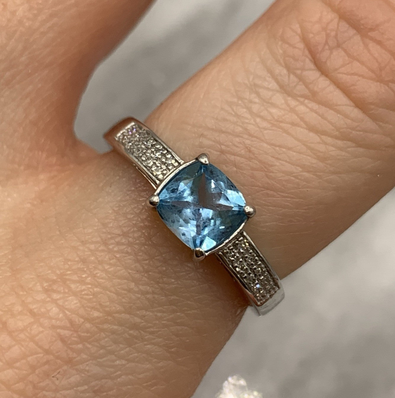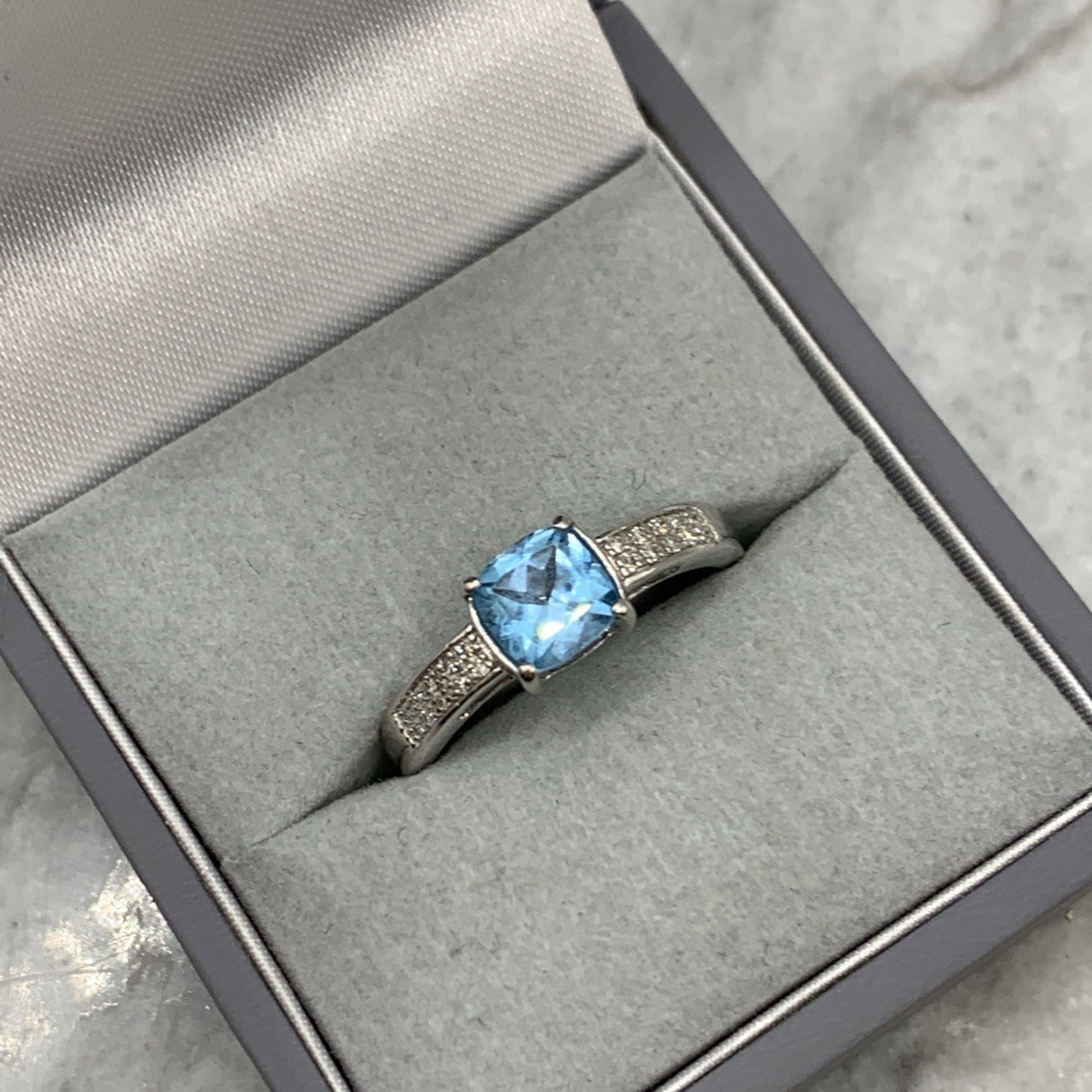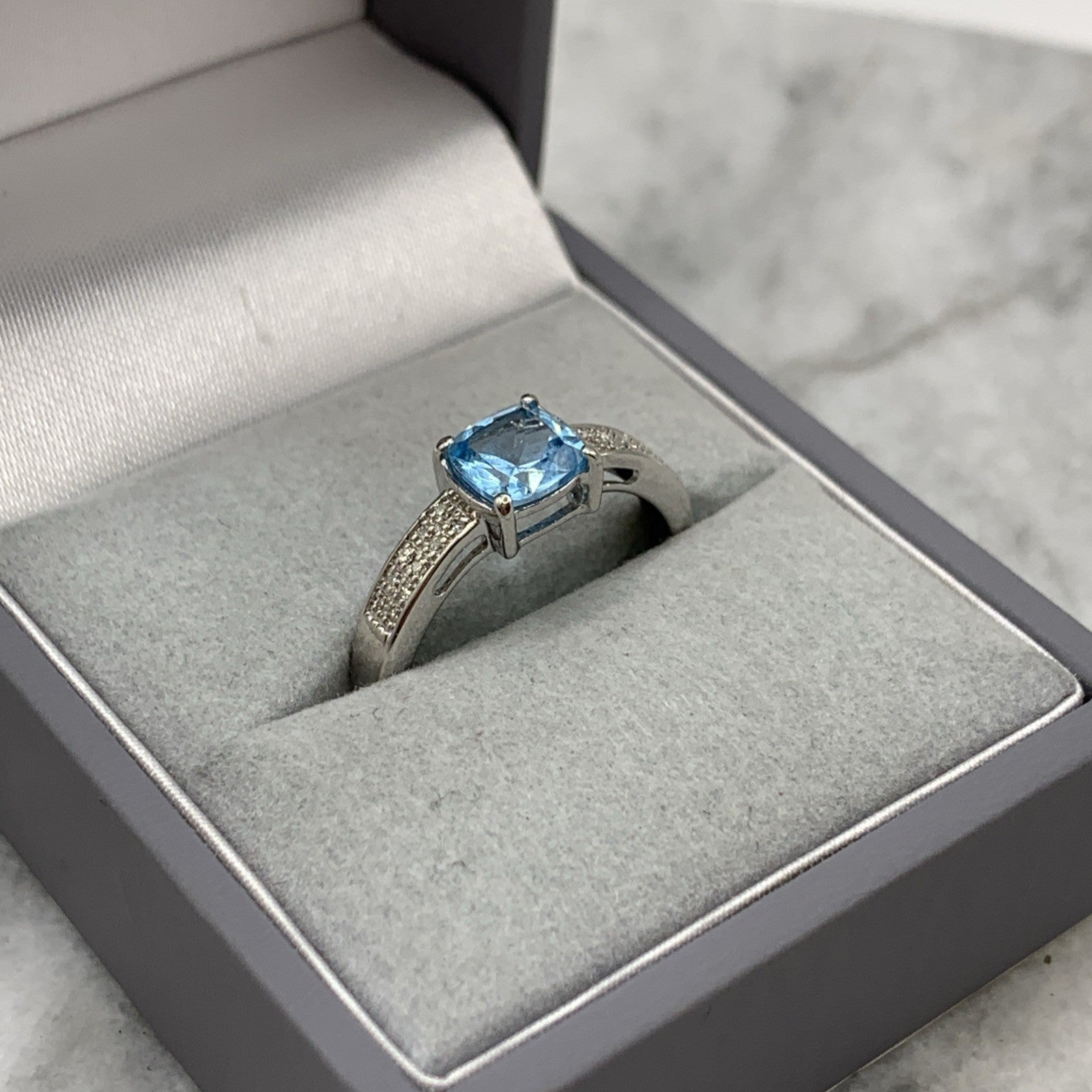 9 ct Gold Ring Swiss Blue Topaz Cushion Diamond in 375 White Gold - Size N 1/2
