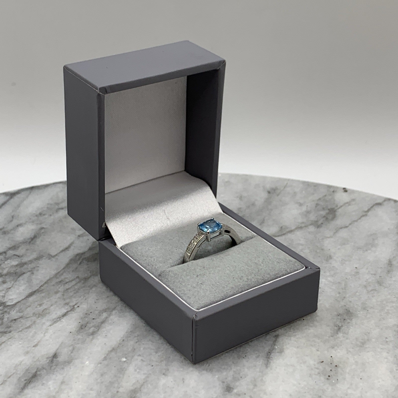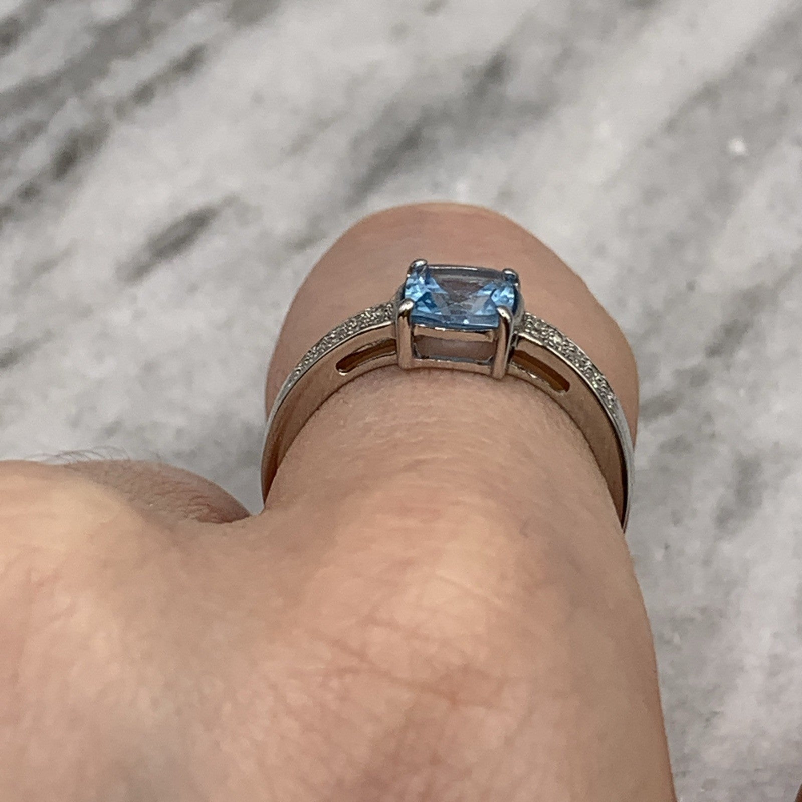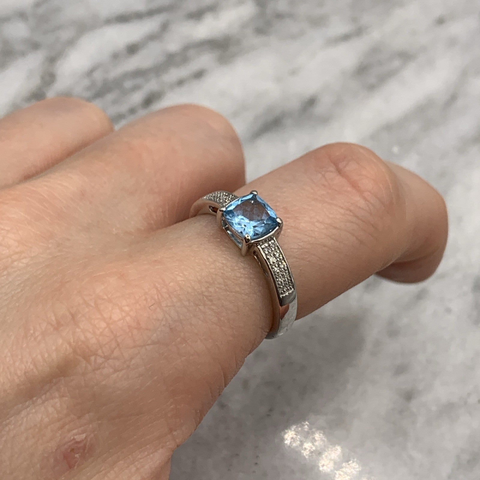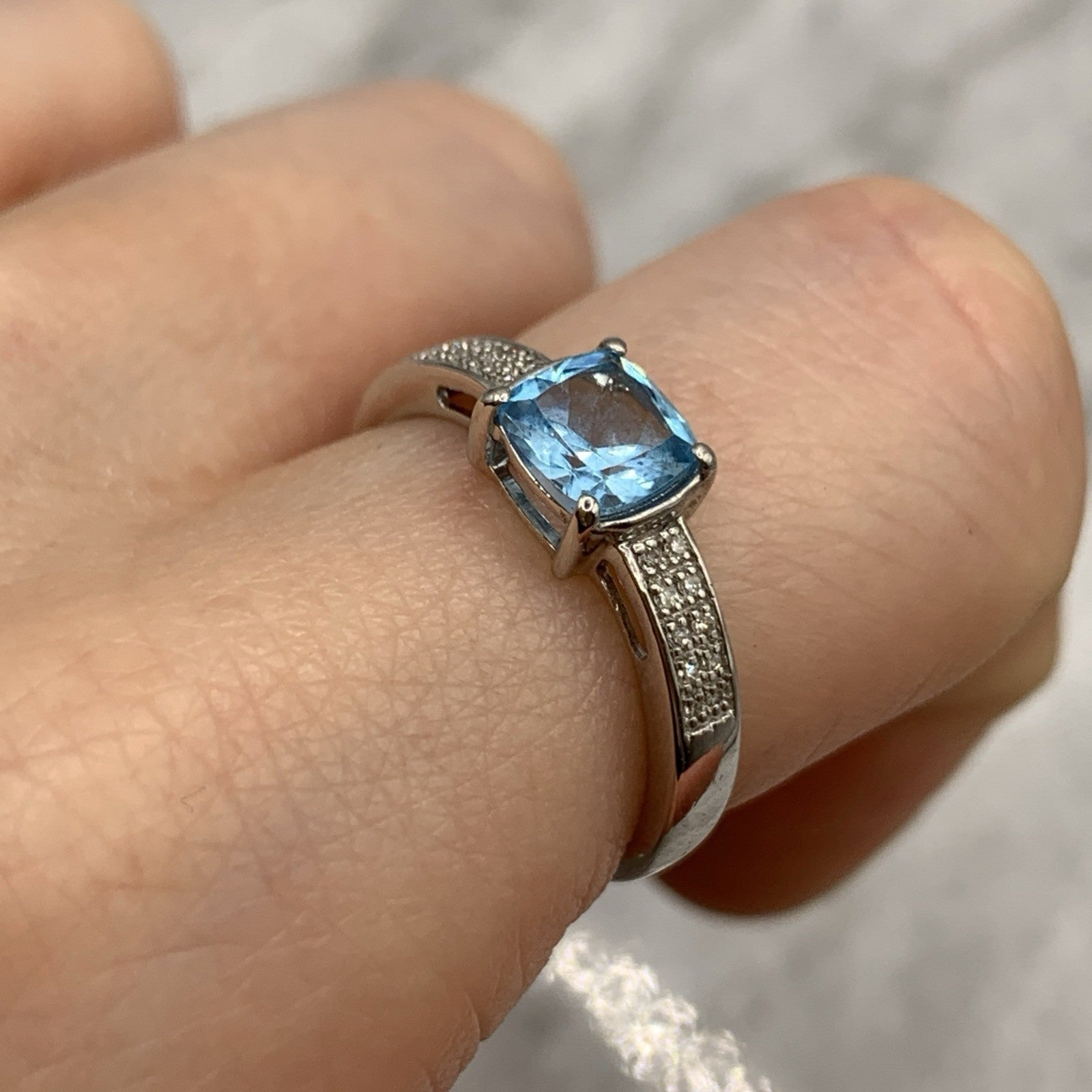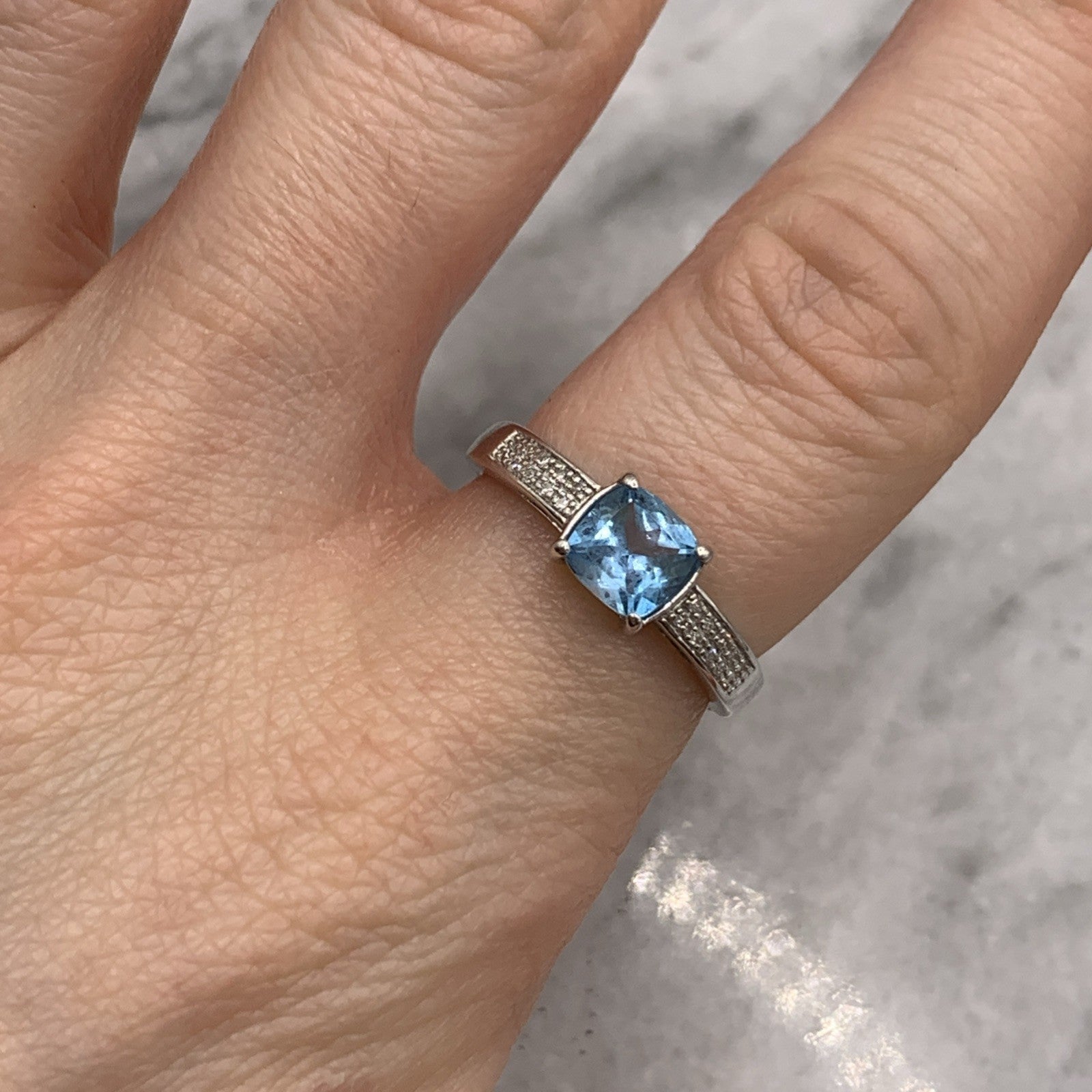 9 ct Gold Ring Swiss Blue Topaz Cushion Diamond in 375 White Gold - Size N 1/2