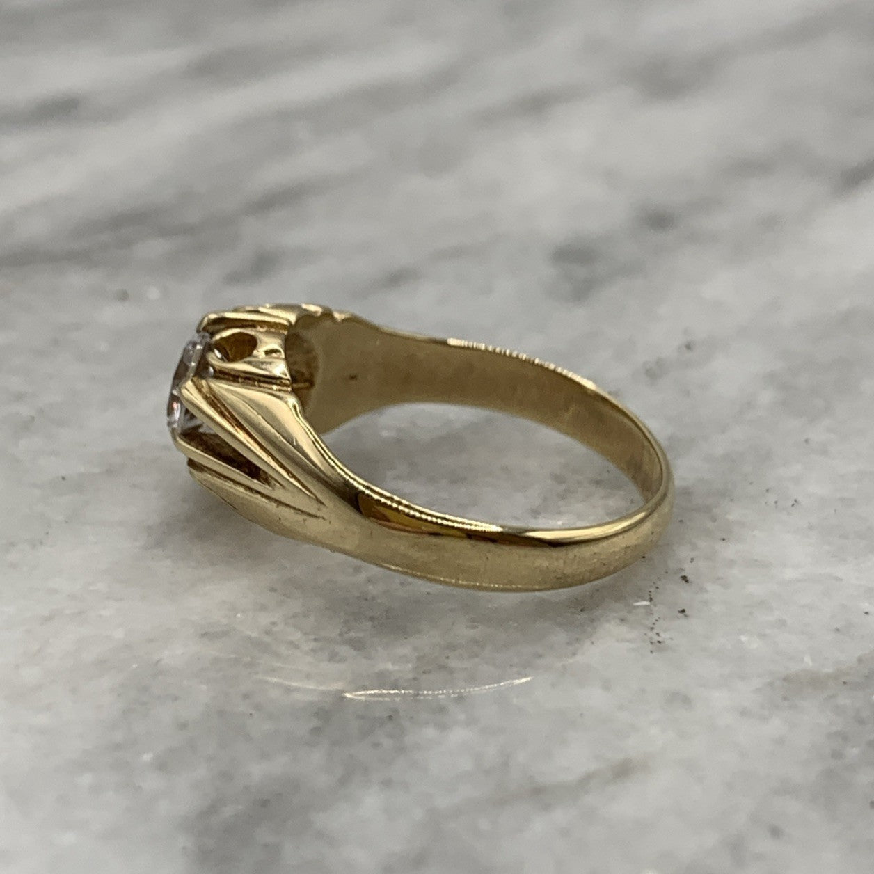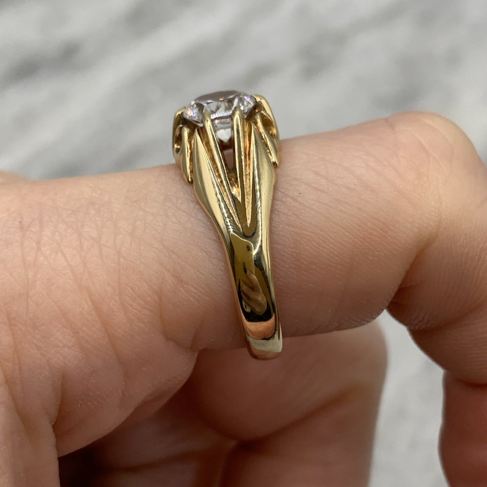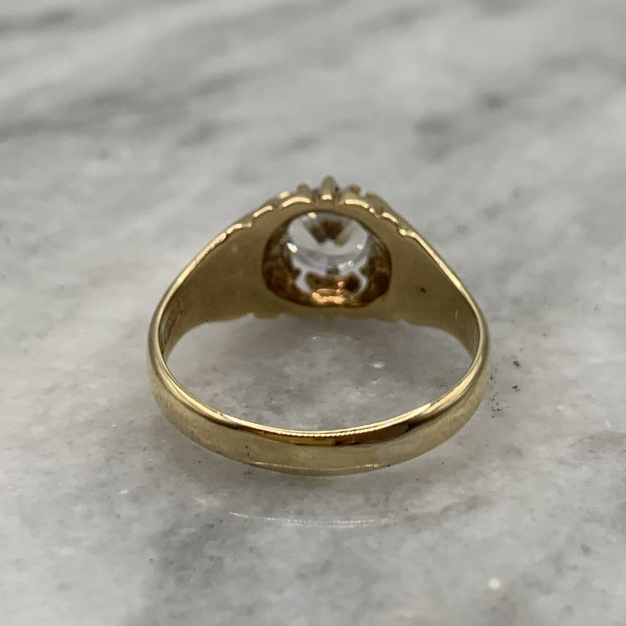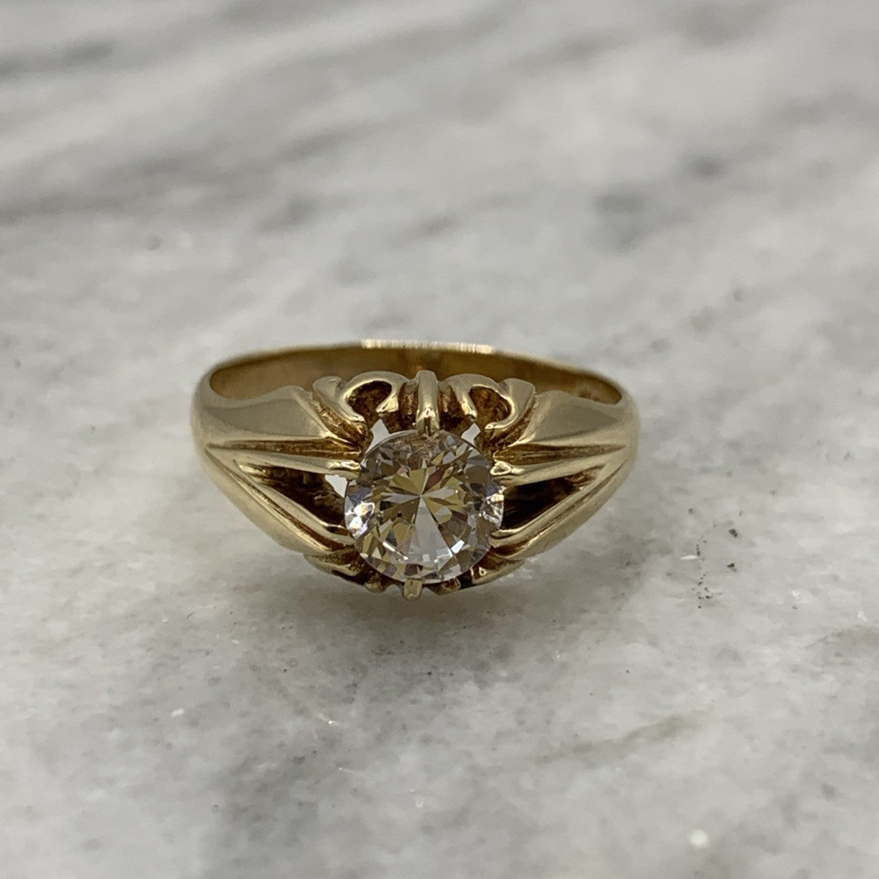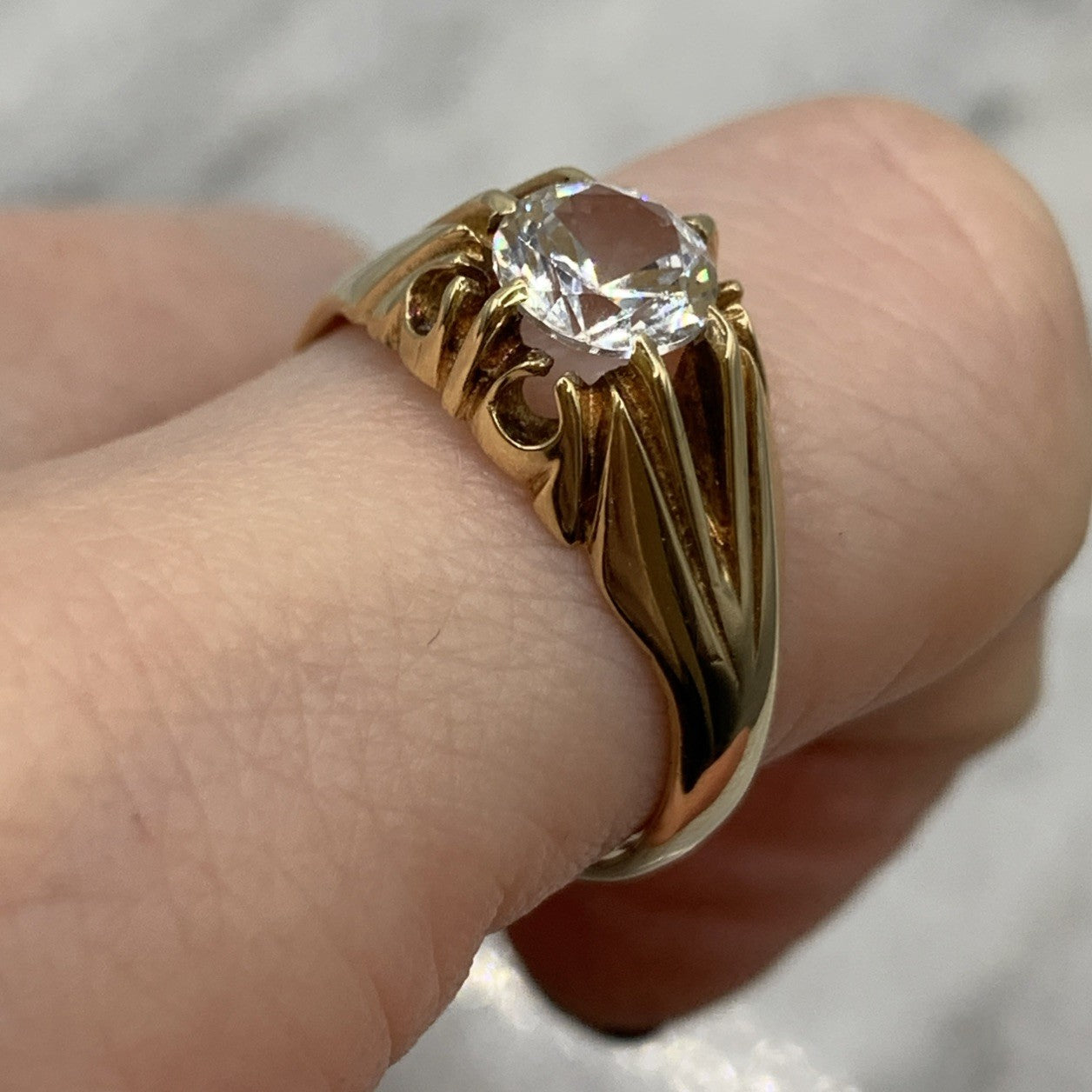 A stunning vintage yellow gold gypsy style ring featuring a solitaire white topaz.