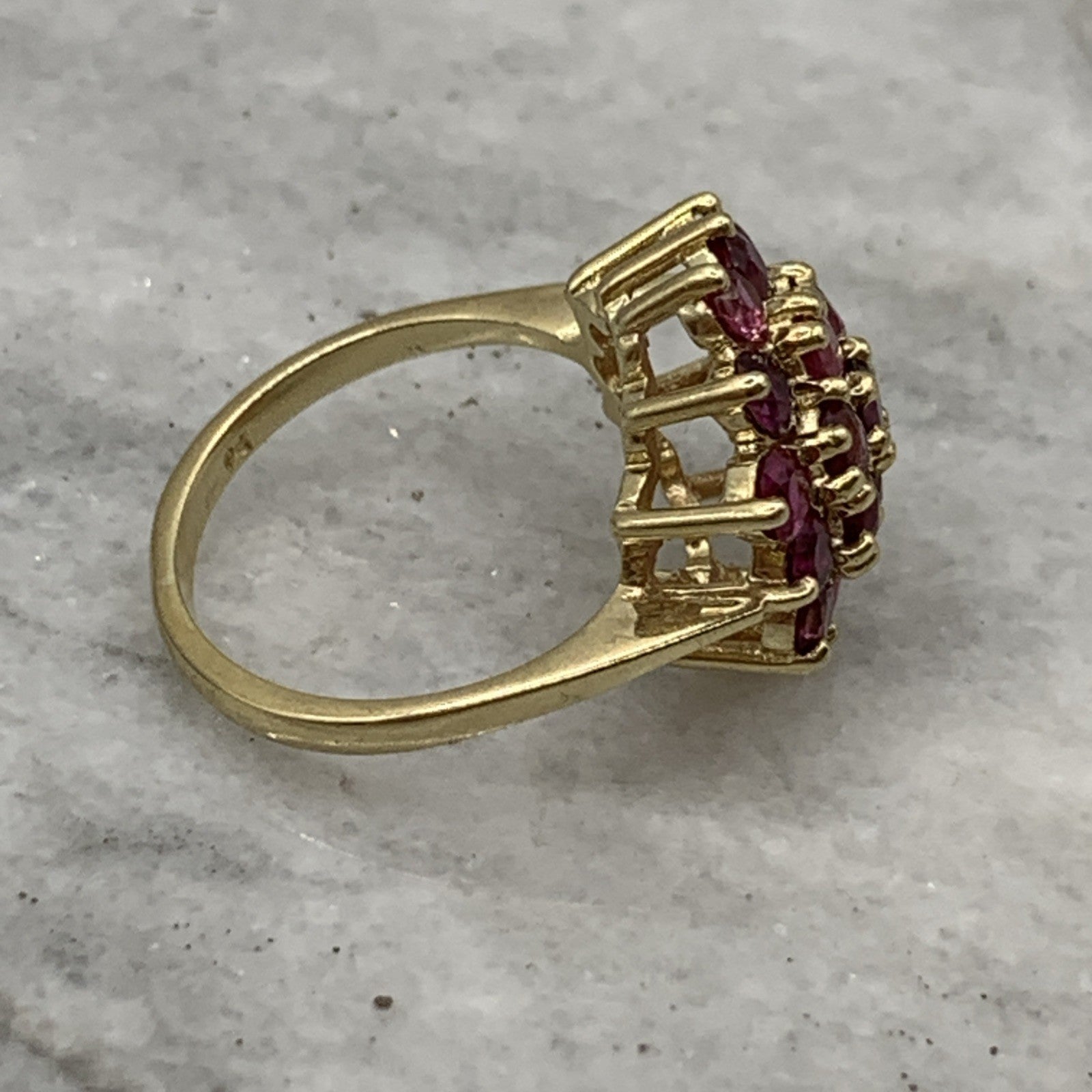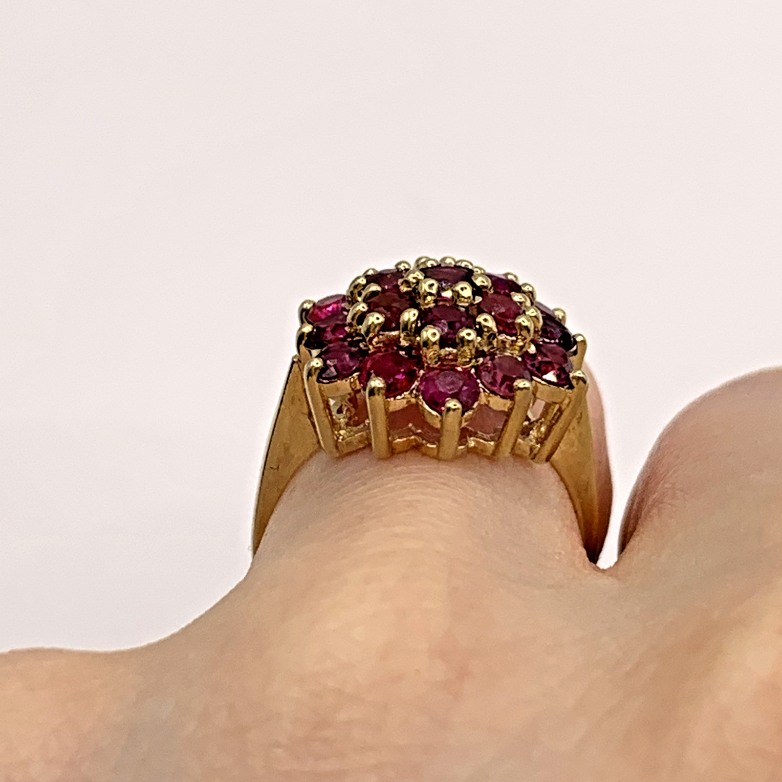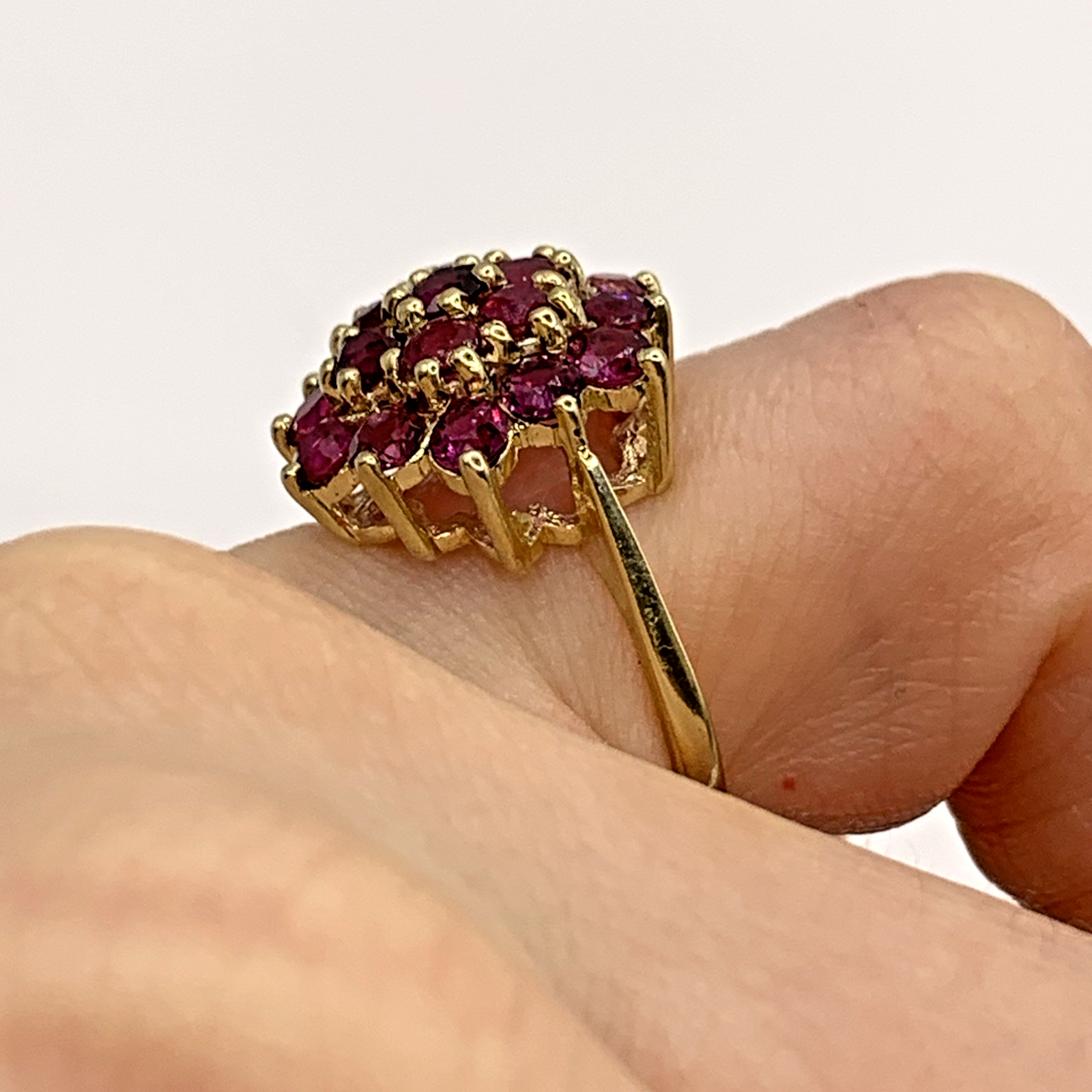 A beautiful gold ring showcasing a flower shaped cluster of round cut rubies.