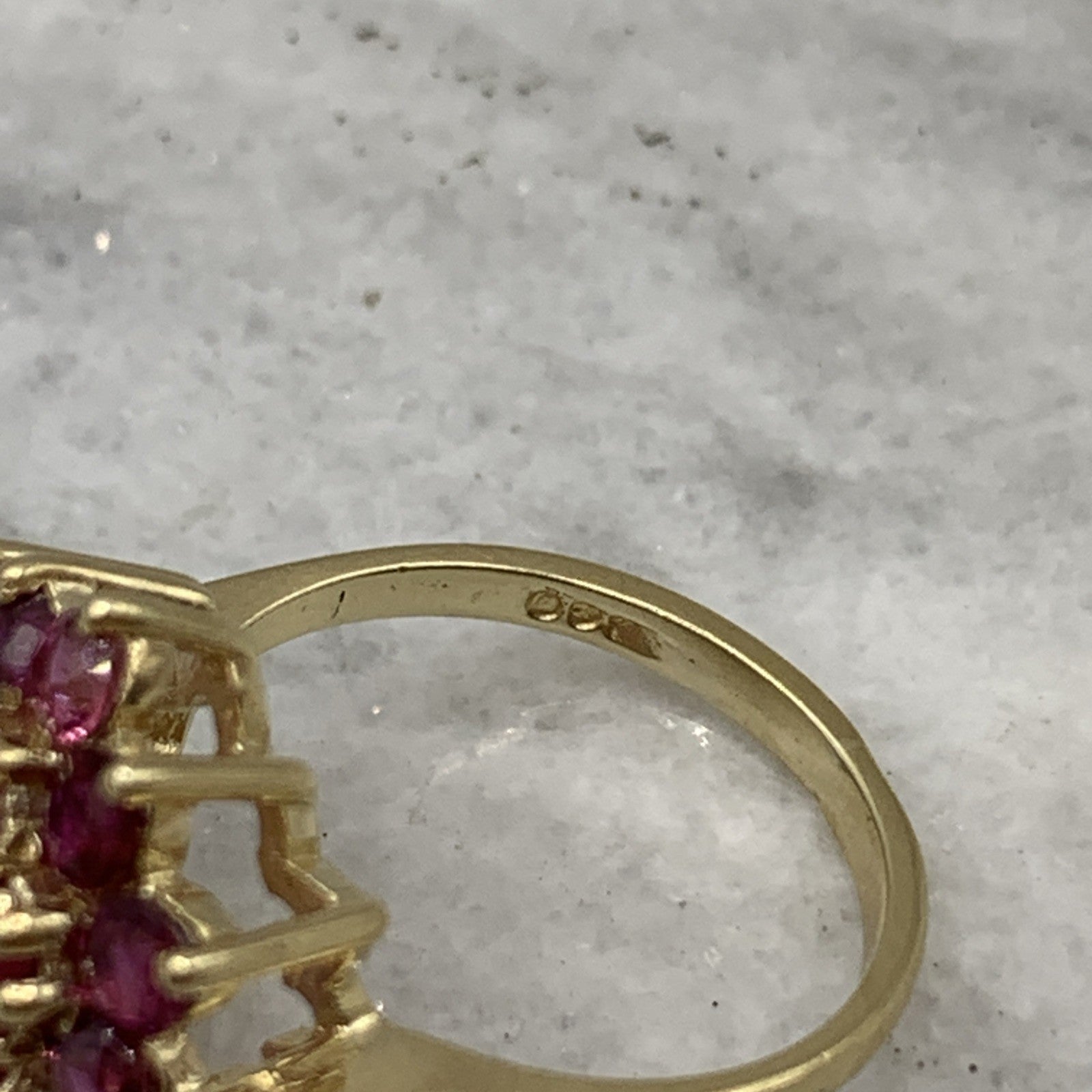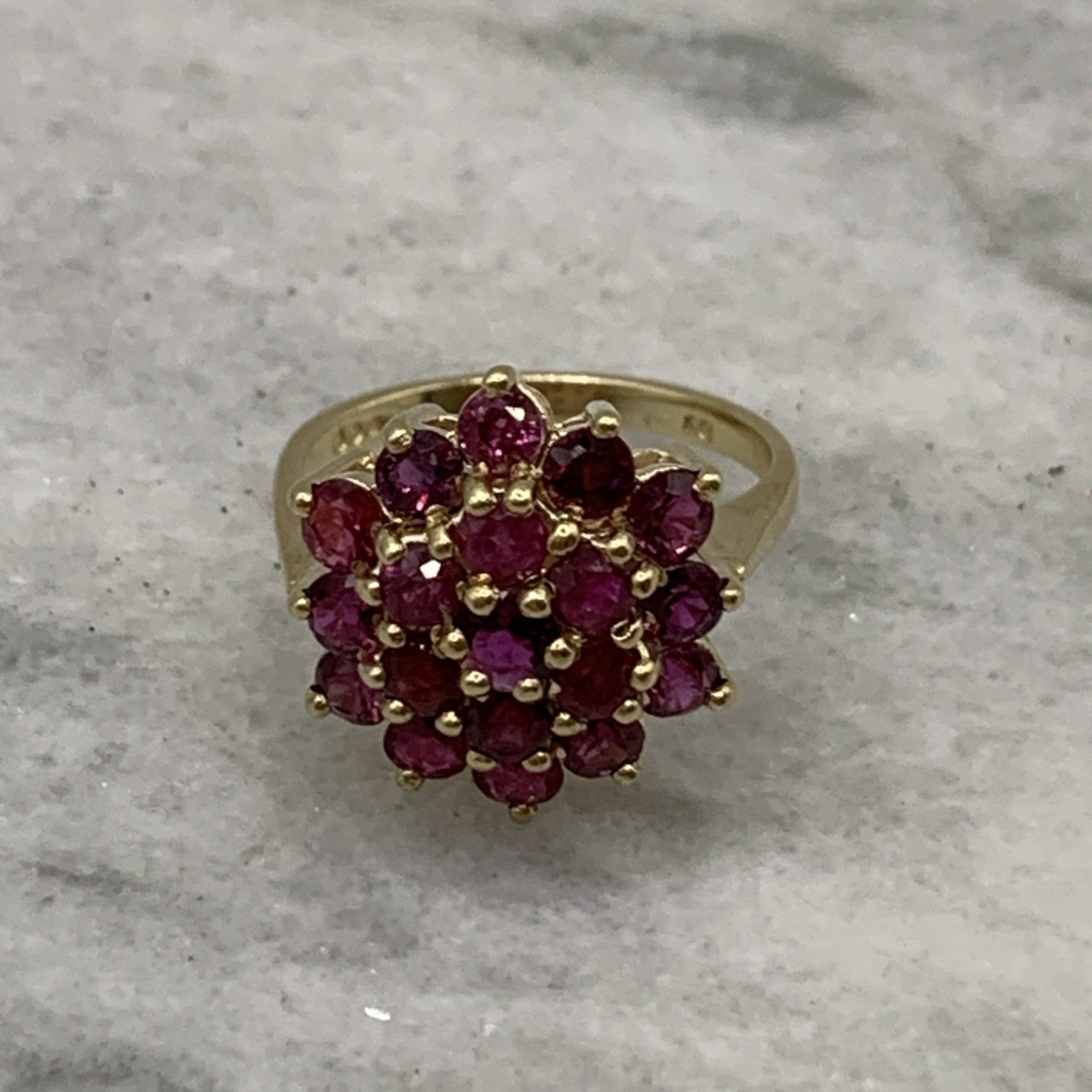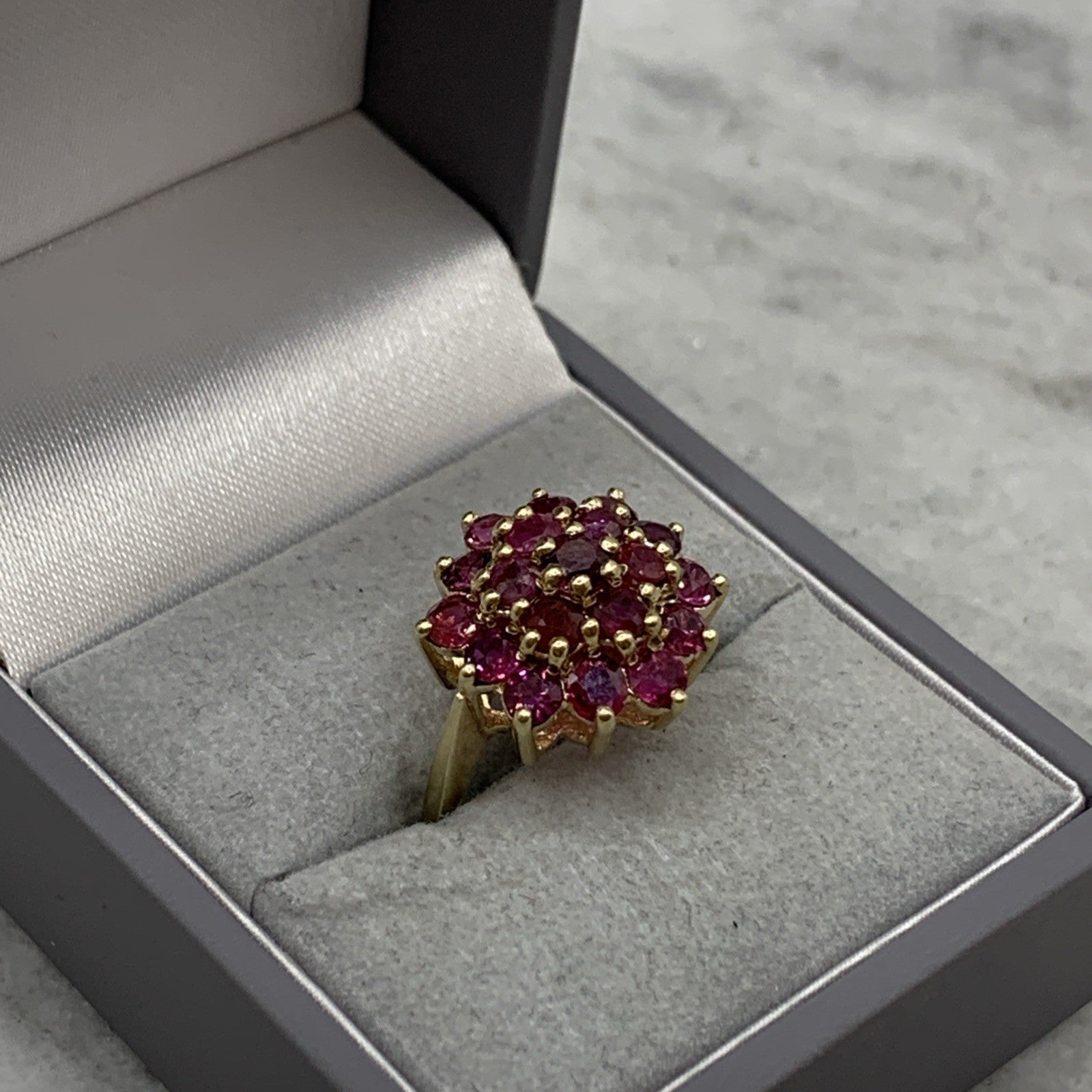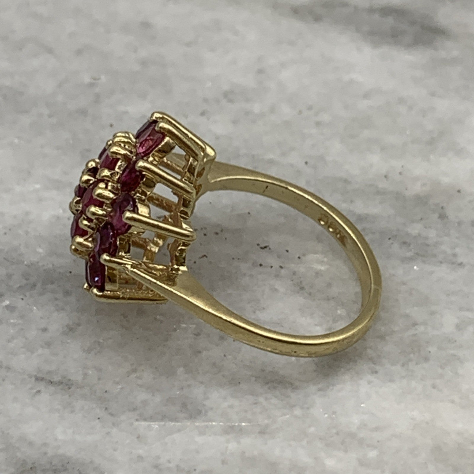 A beautiful gold ring showcasing a flower shaped cluster of round cut rubies.