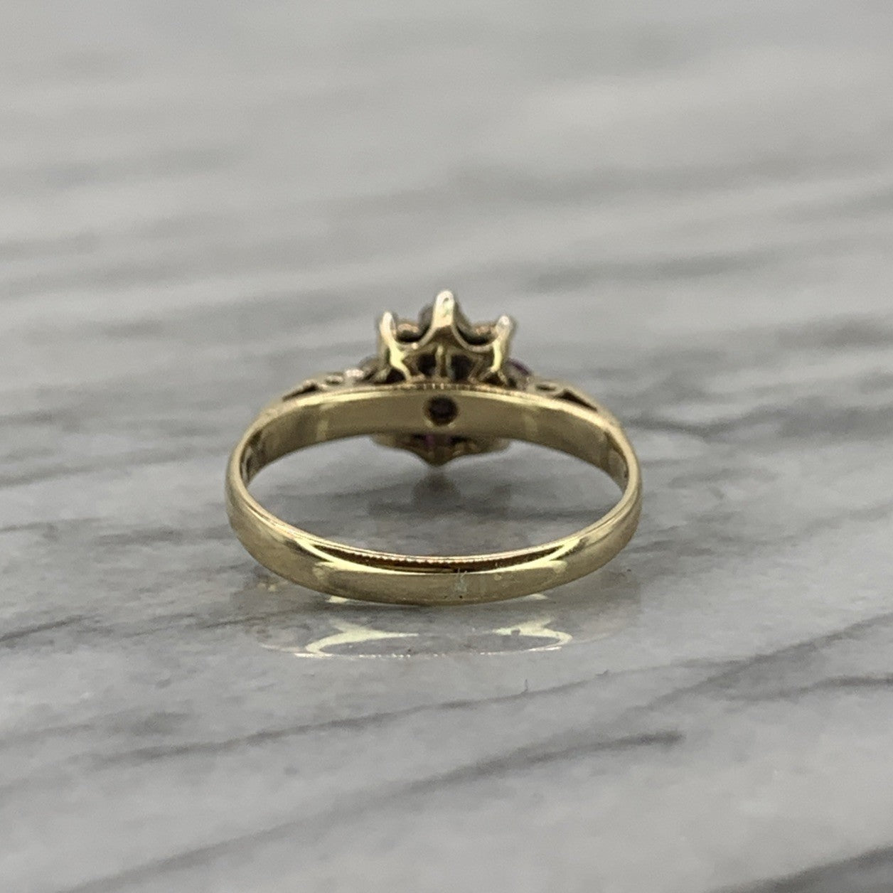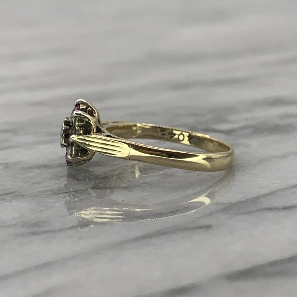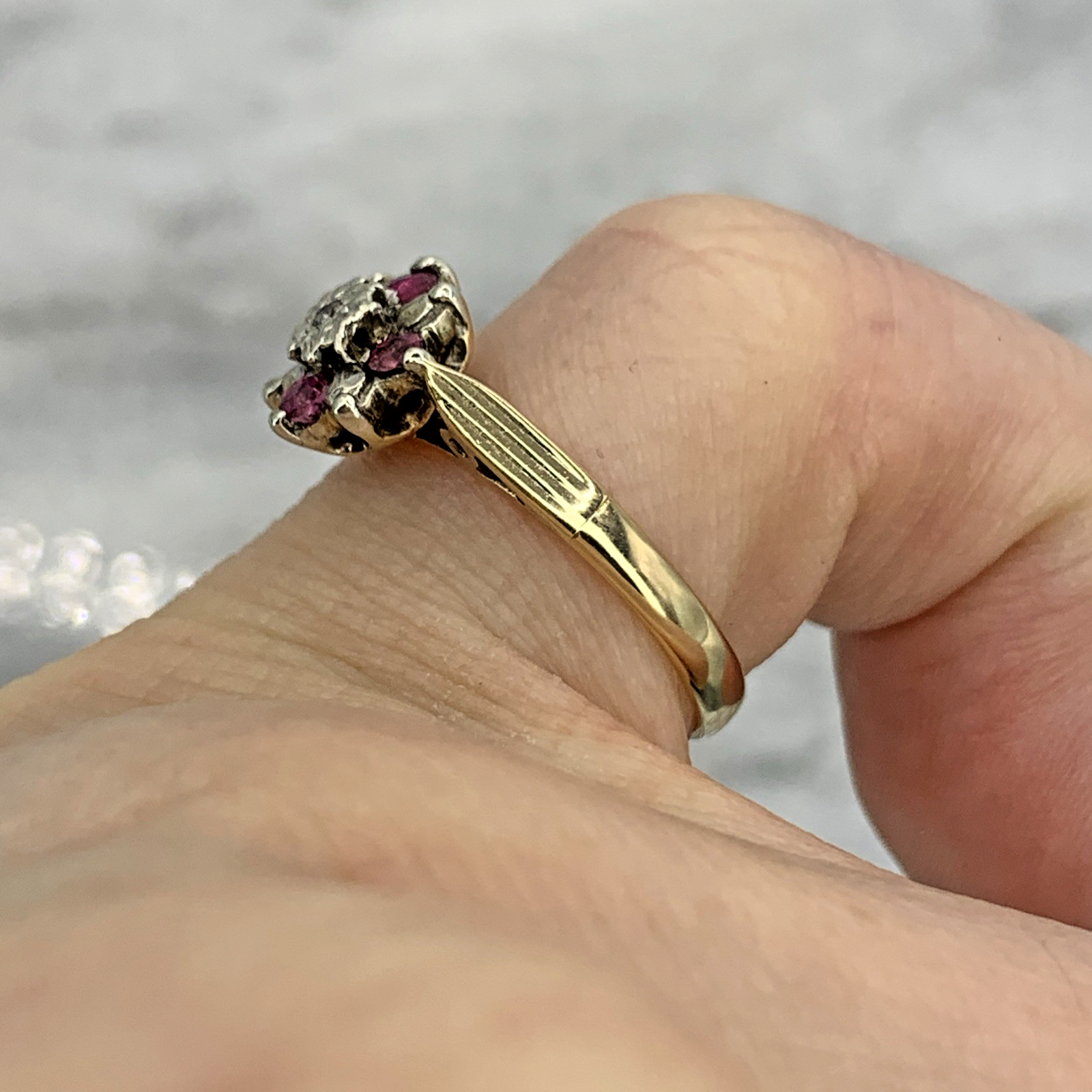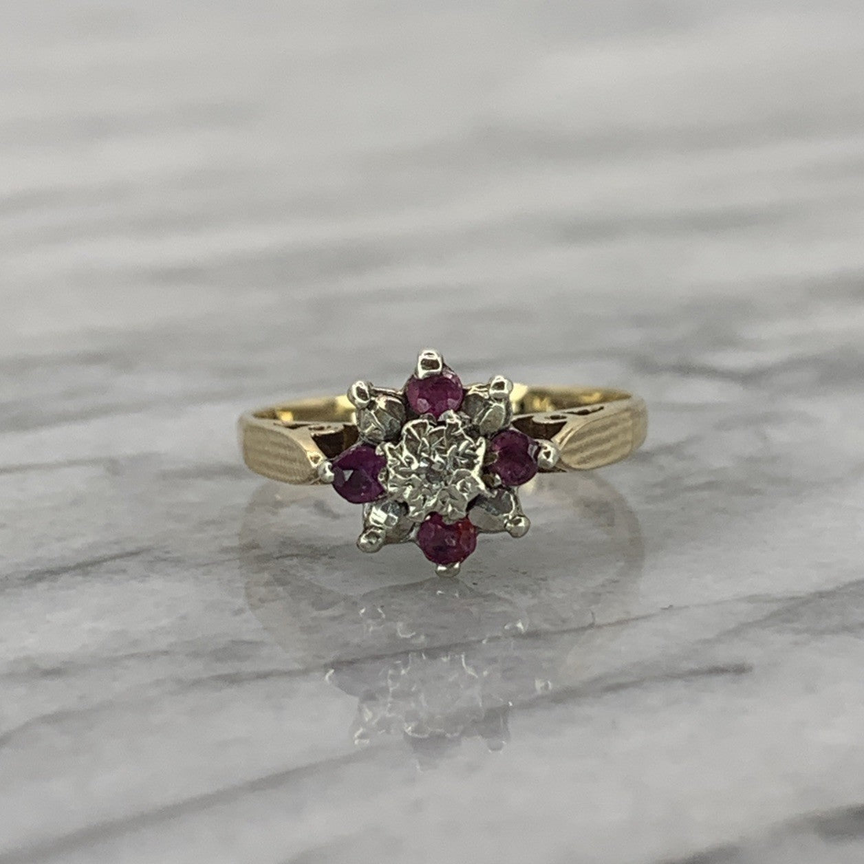 A stunning gold ring featuring a cluster of petite diamonds and rubies, centred by an illusion set diamond upon cathedral style shoulders.