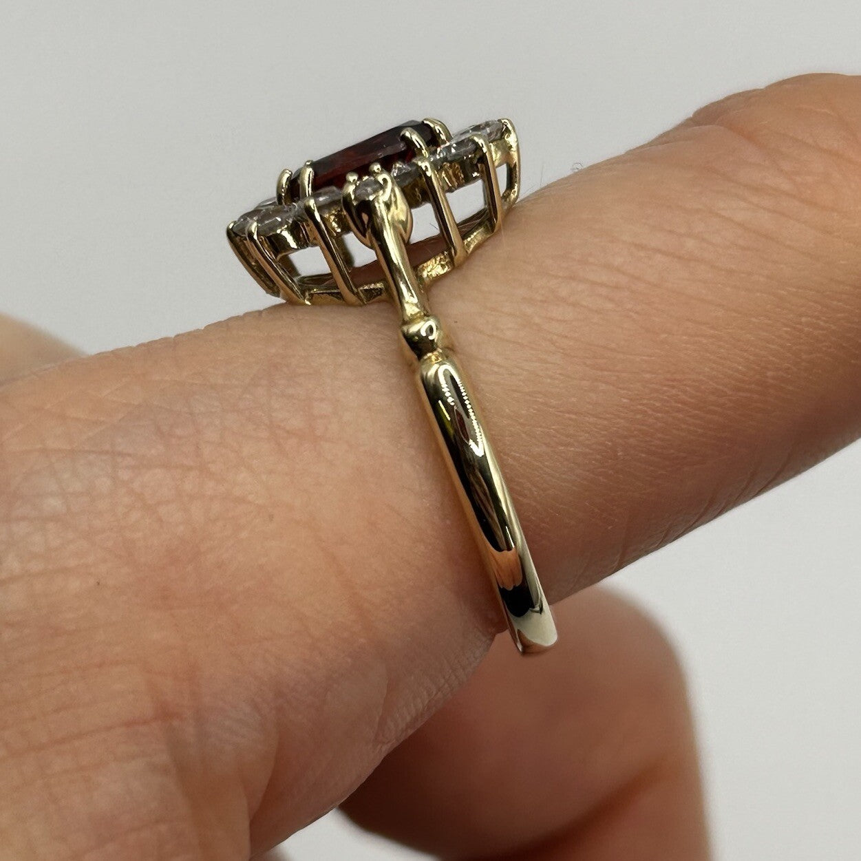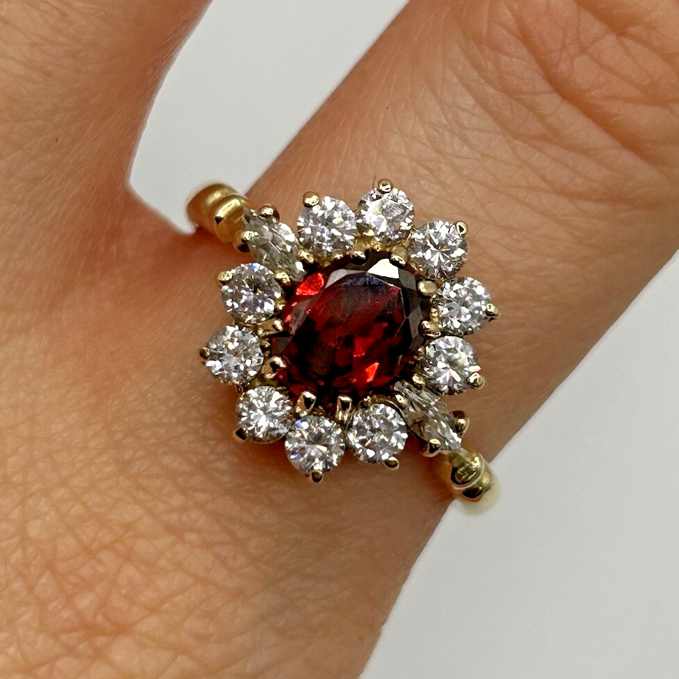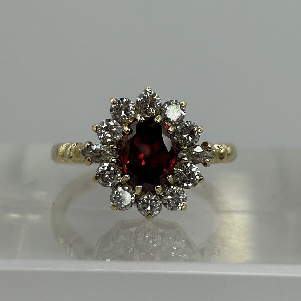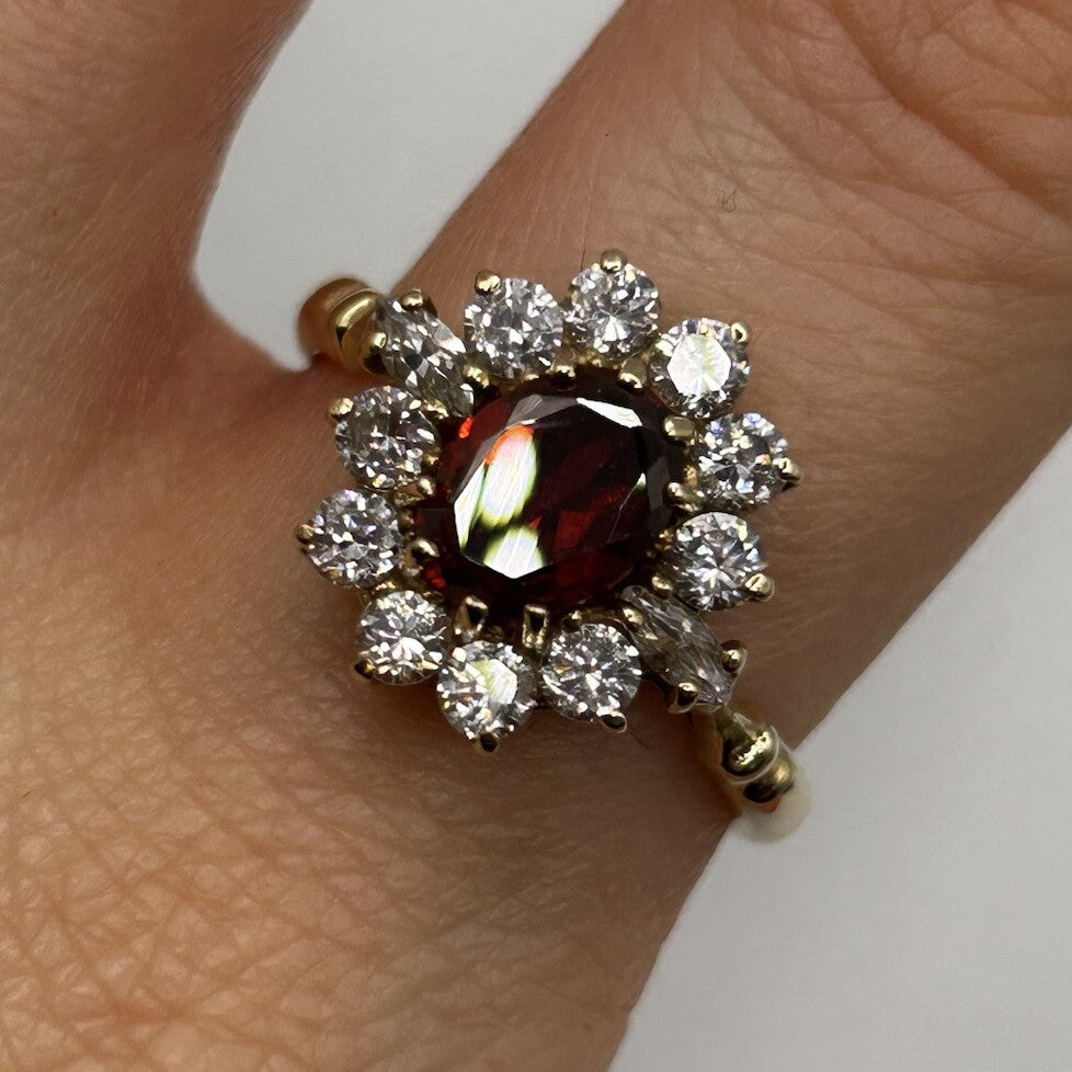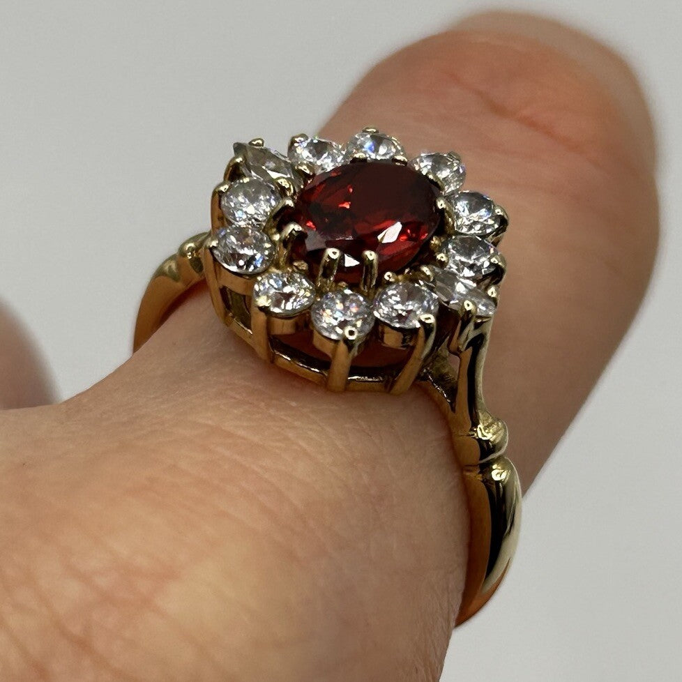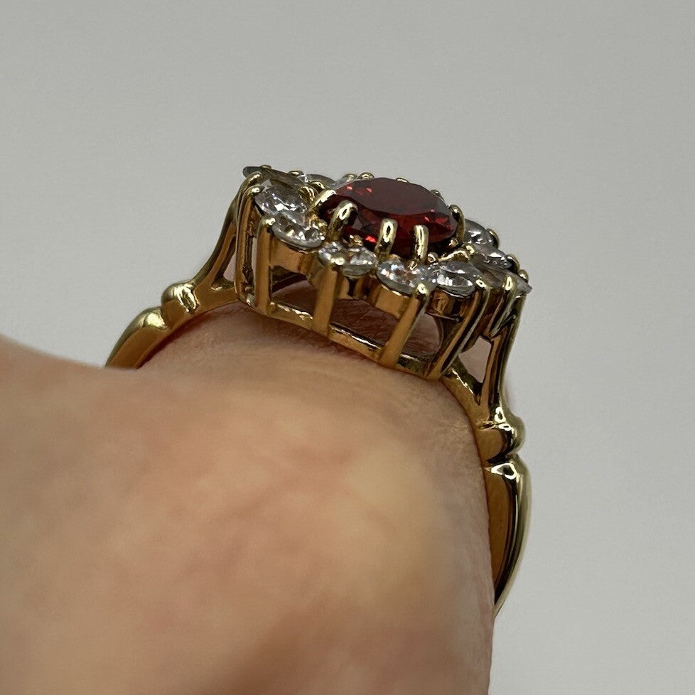 A stunning yellow gold ring showcasing an ornate cluster with an oval cut spessartine garnet to centre, accented by a halo of cubic zirconia.