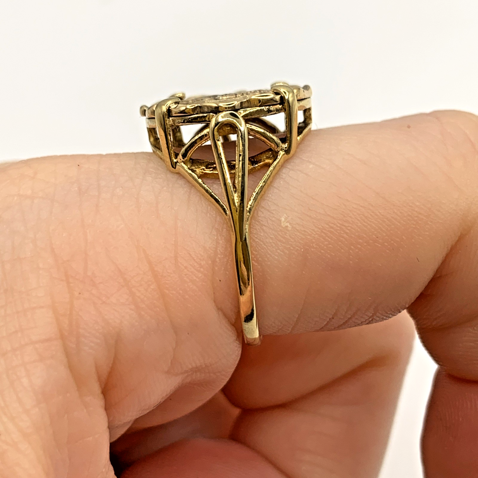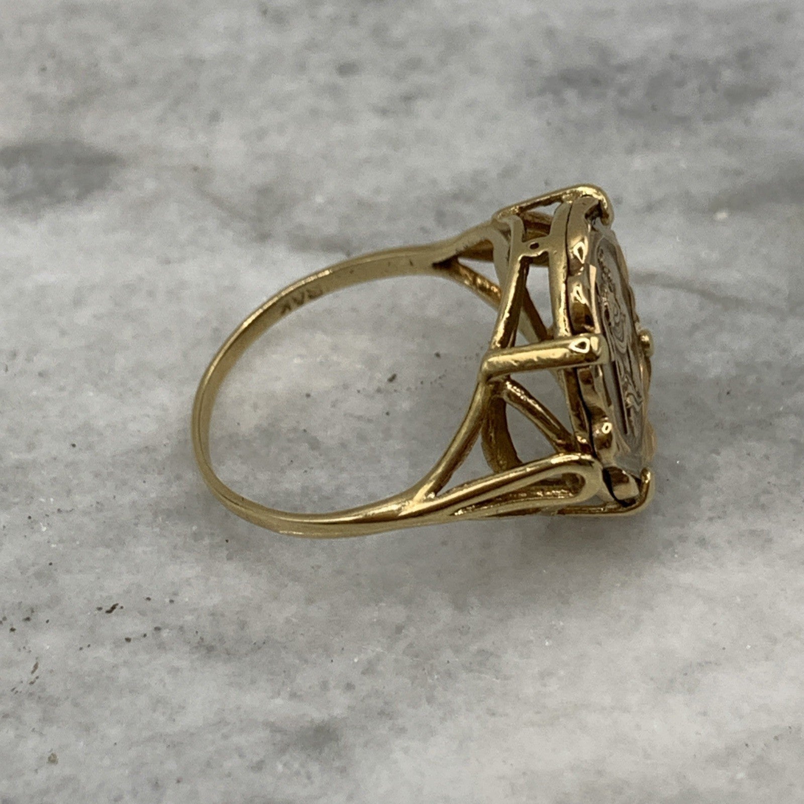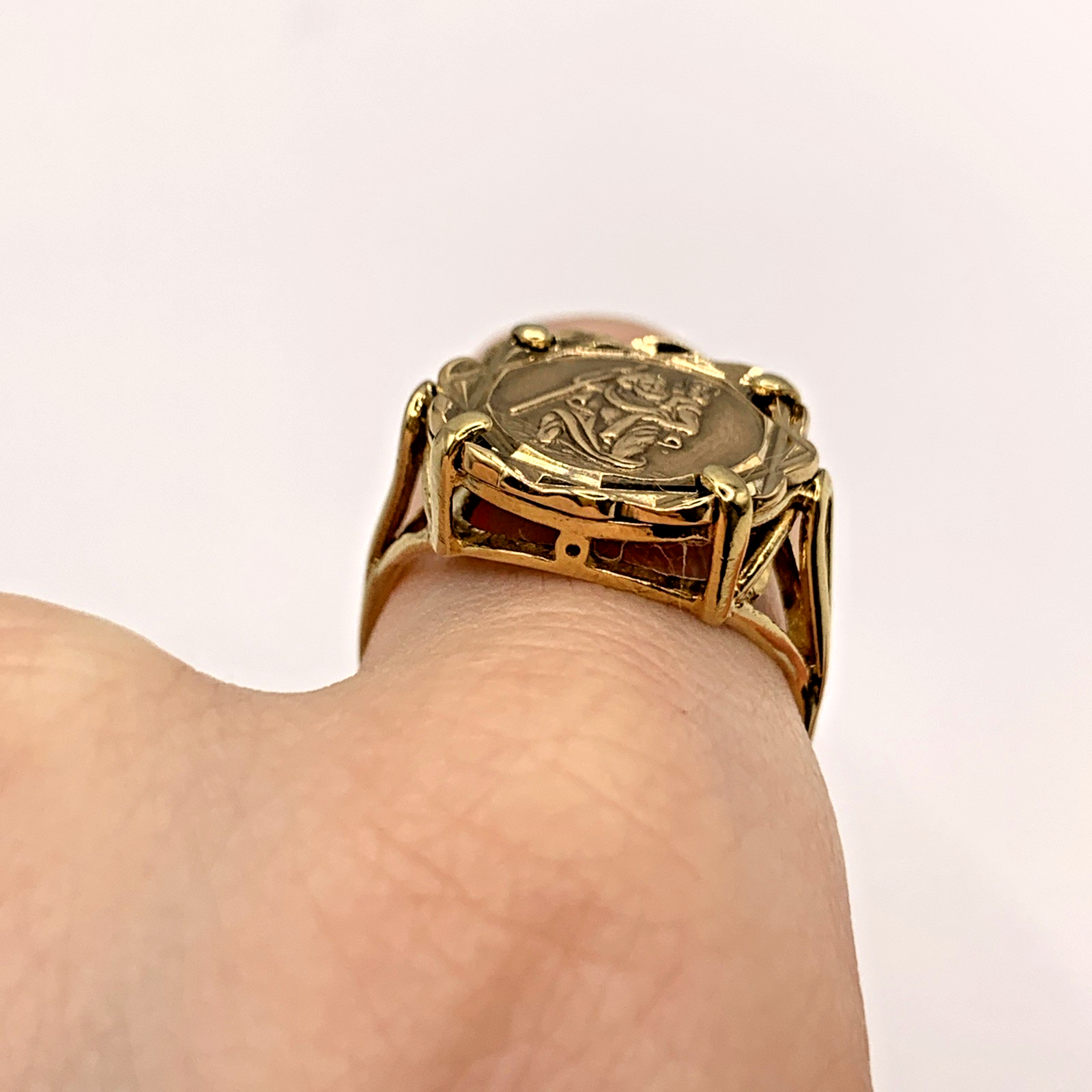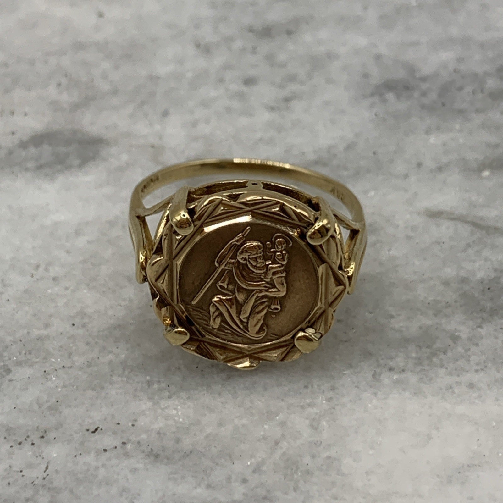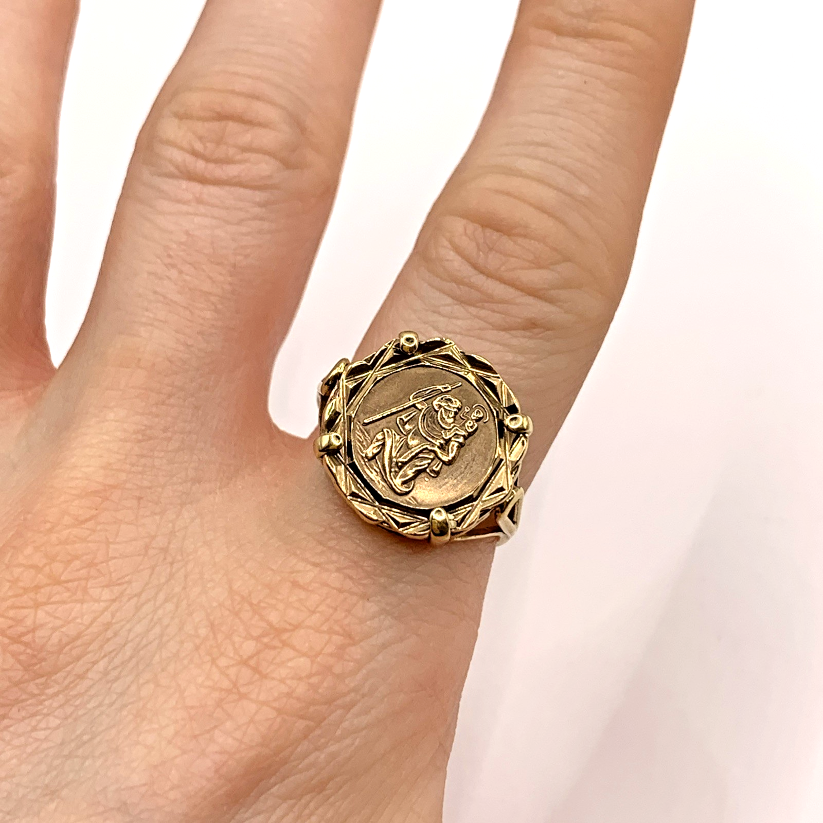 A timeless gold ring featuring a Saint Christopher coin held in claws.