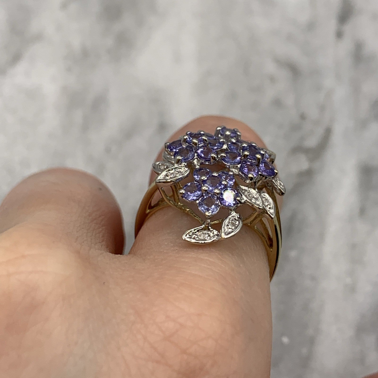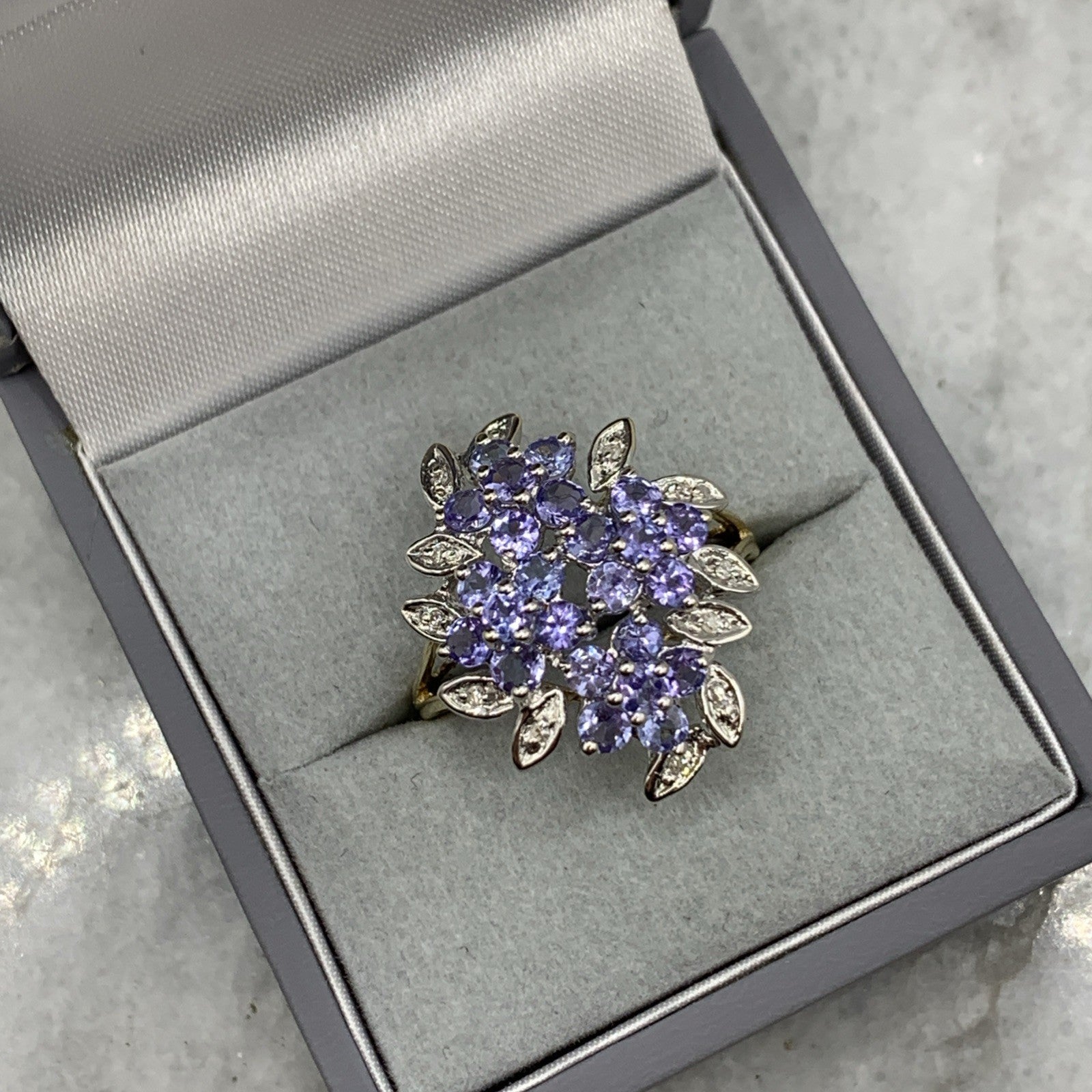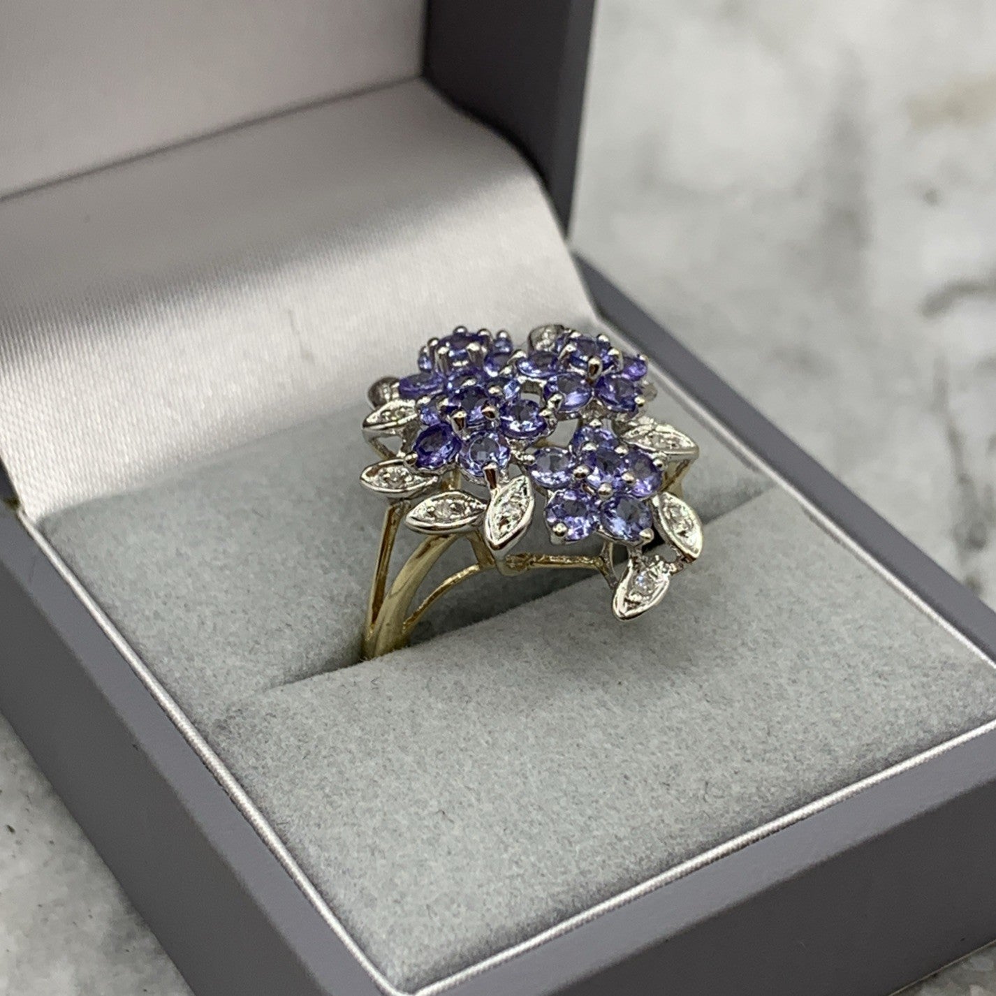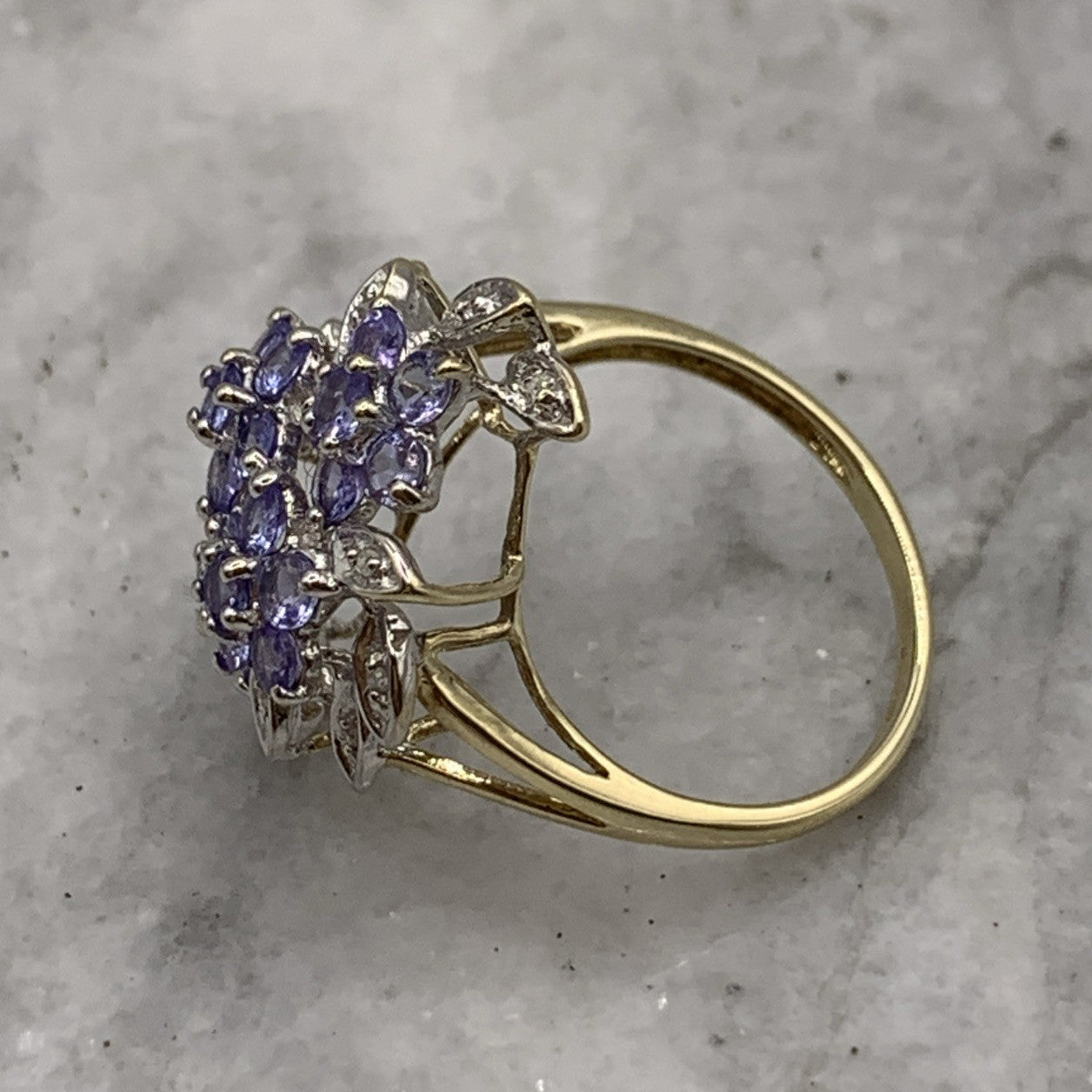 9 ct Gold Tanzanite & Diamond Flower Cluster Ring 375 9k Yellow Gold - Size P