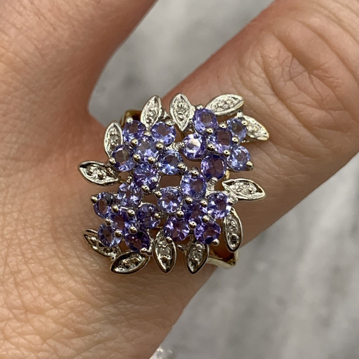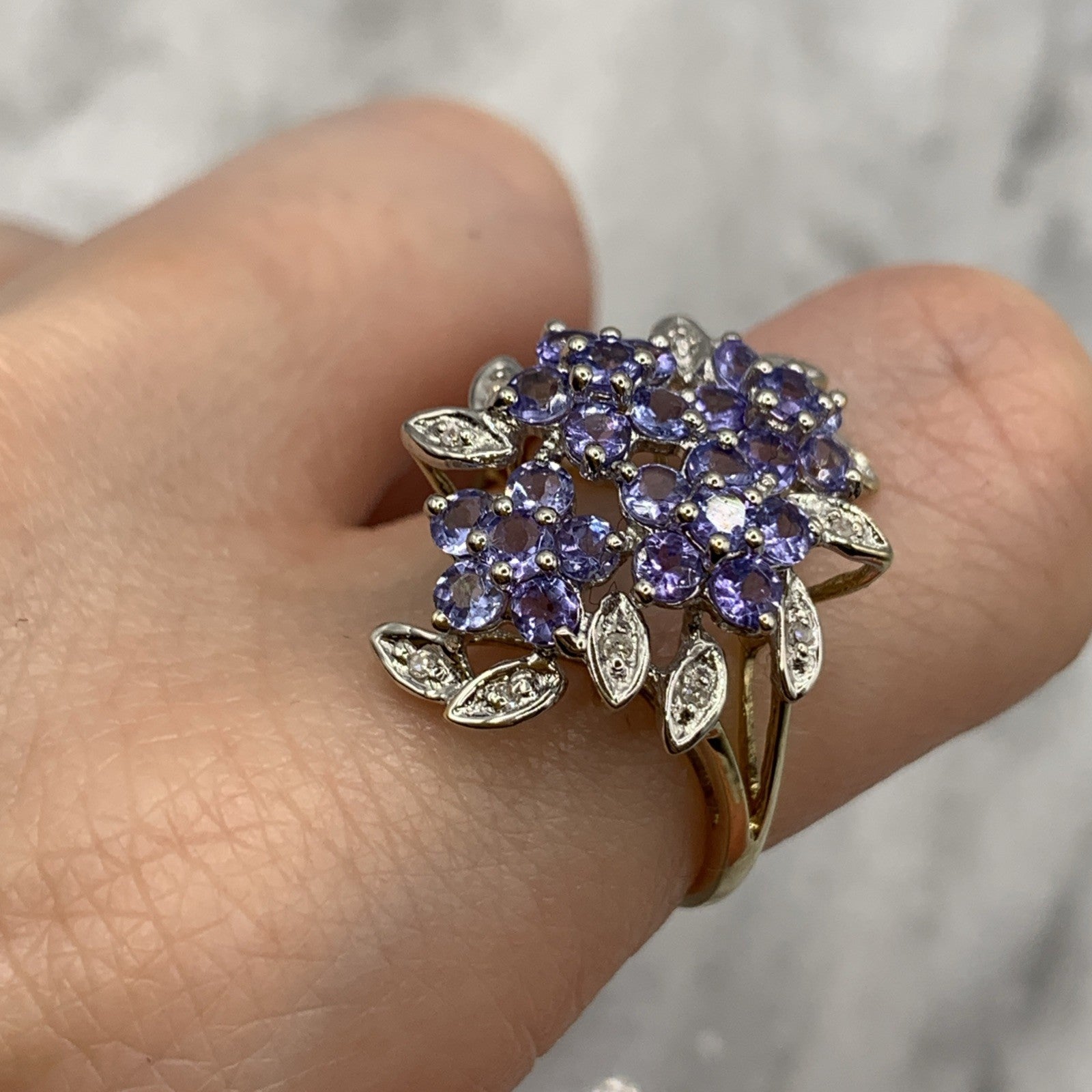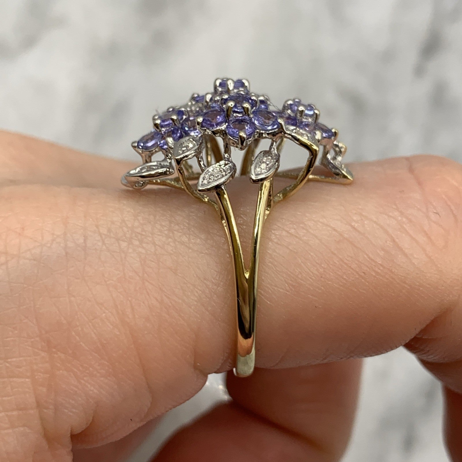 9 ct Gold Tanzanite & Diamond Flower Cluster Ring 375 9k Yellow Gold - Size P