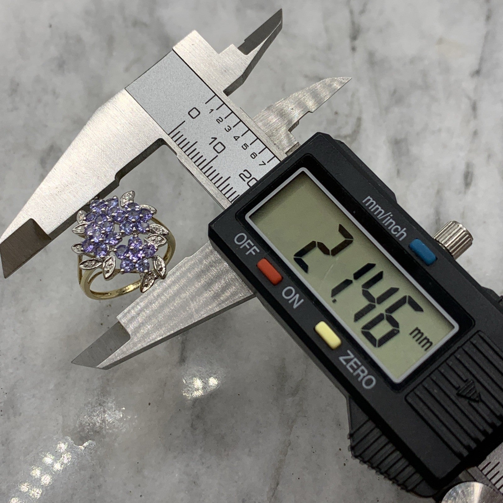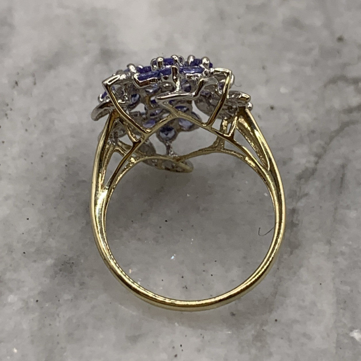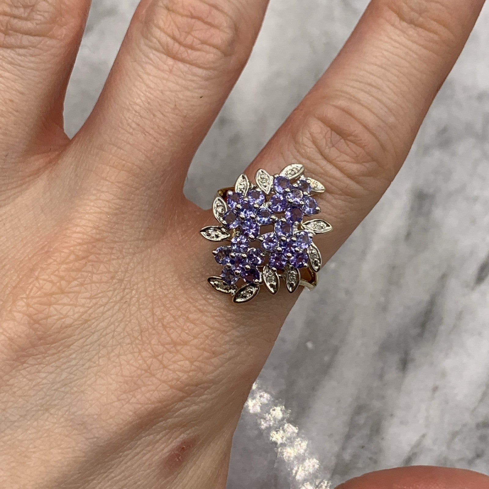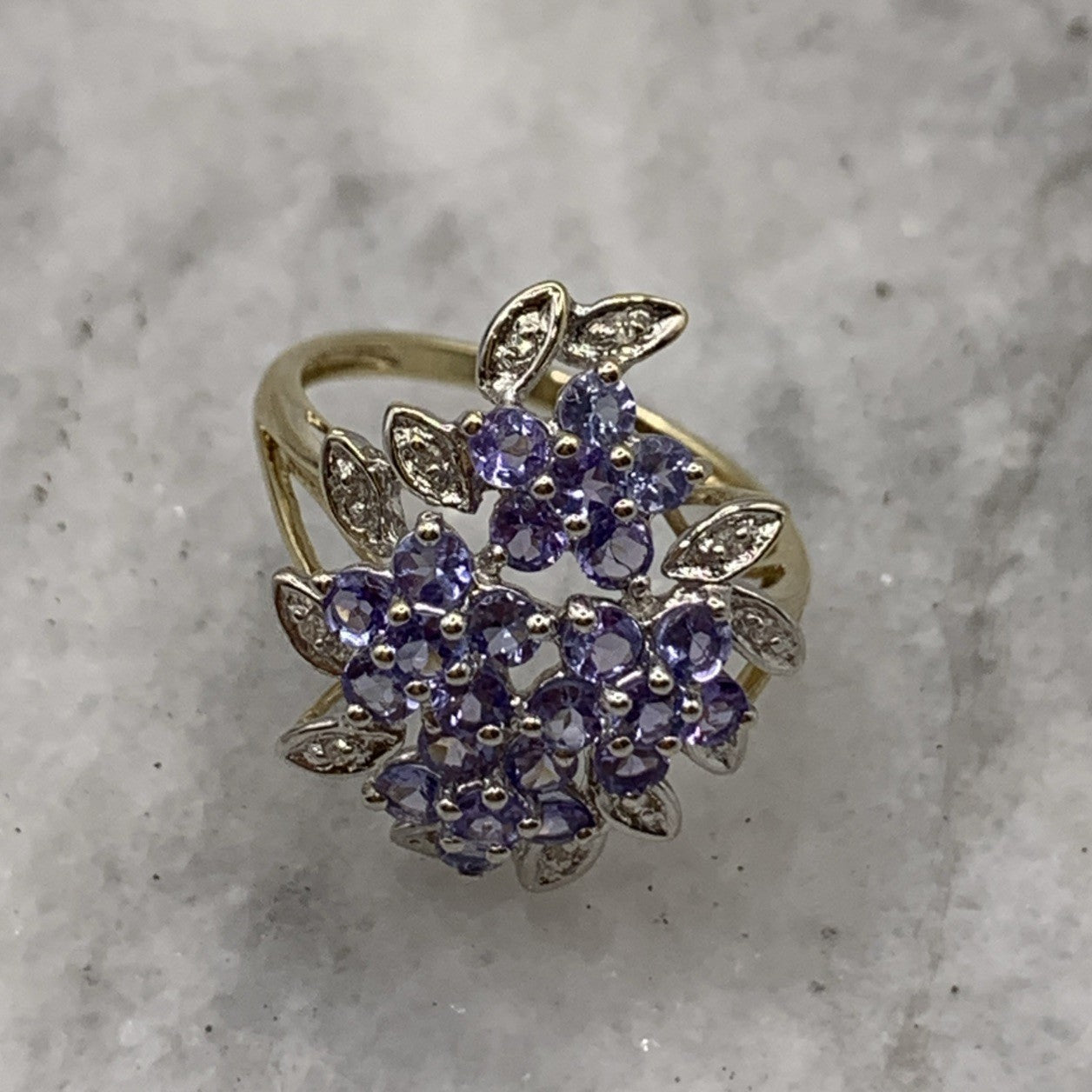 - A beautiful gold ring showcasing an ornate collection of flower shaped clusters of tanzanite accented by petite diamonds.