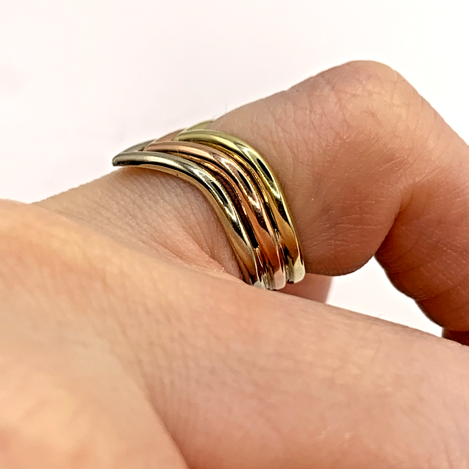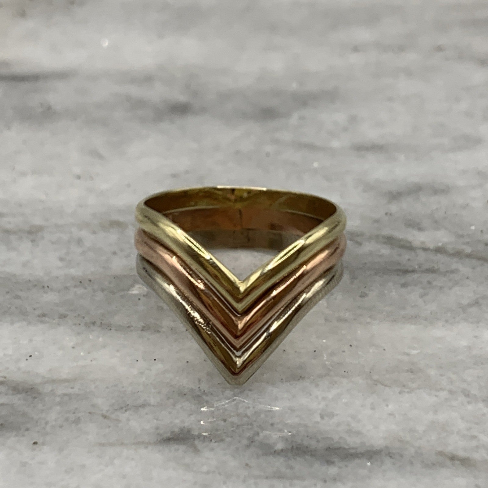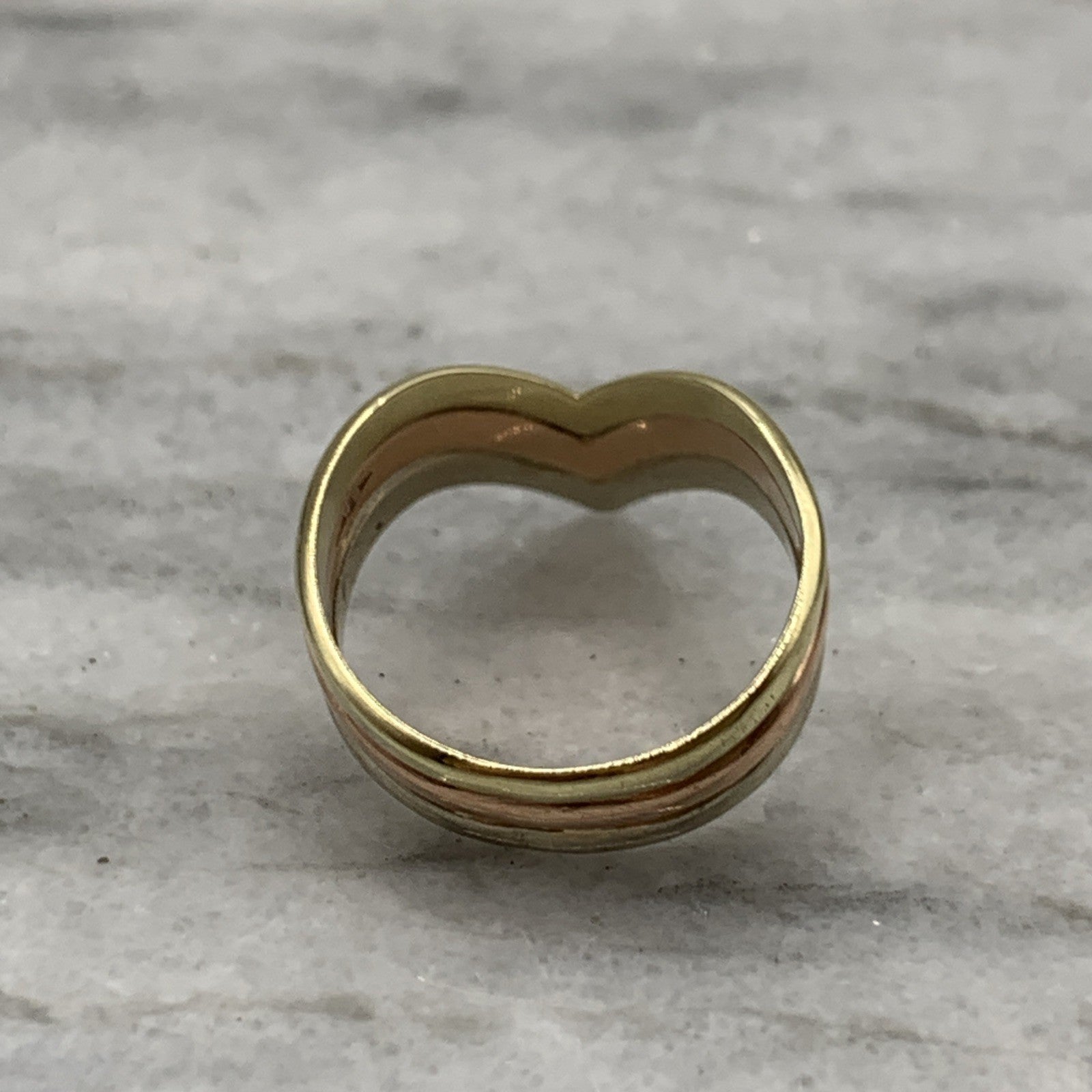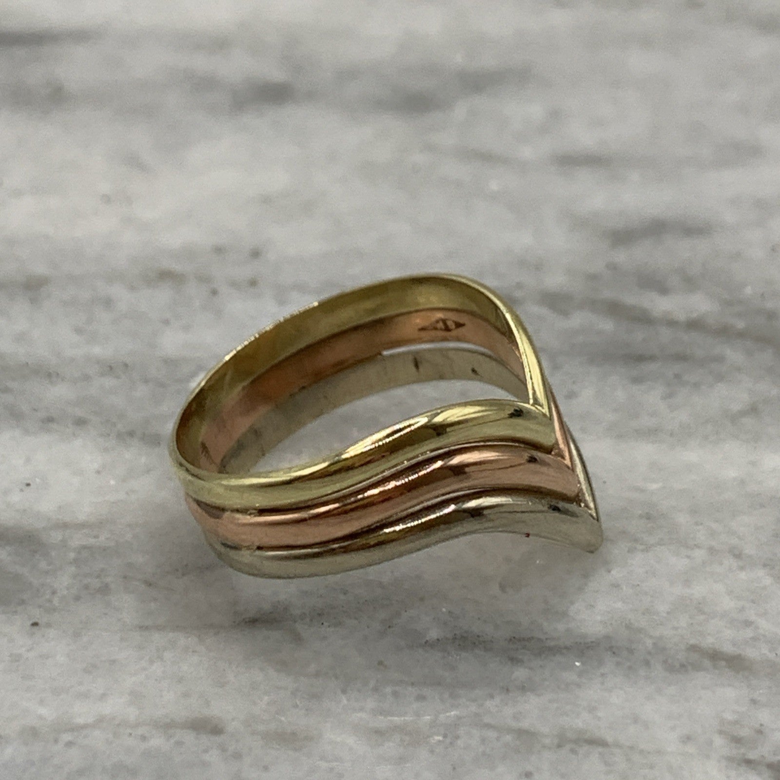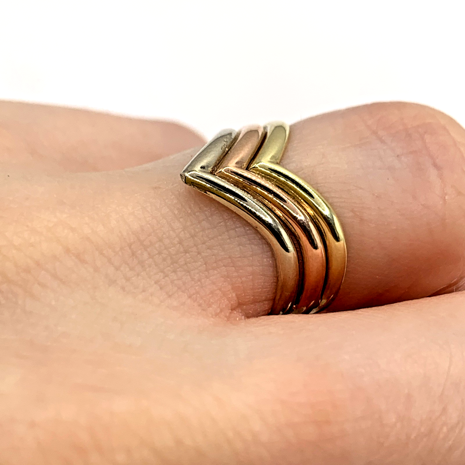 A unique three tone gold wishbone style ring.
