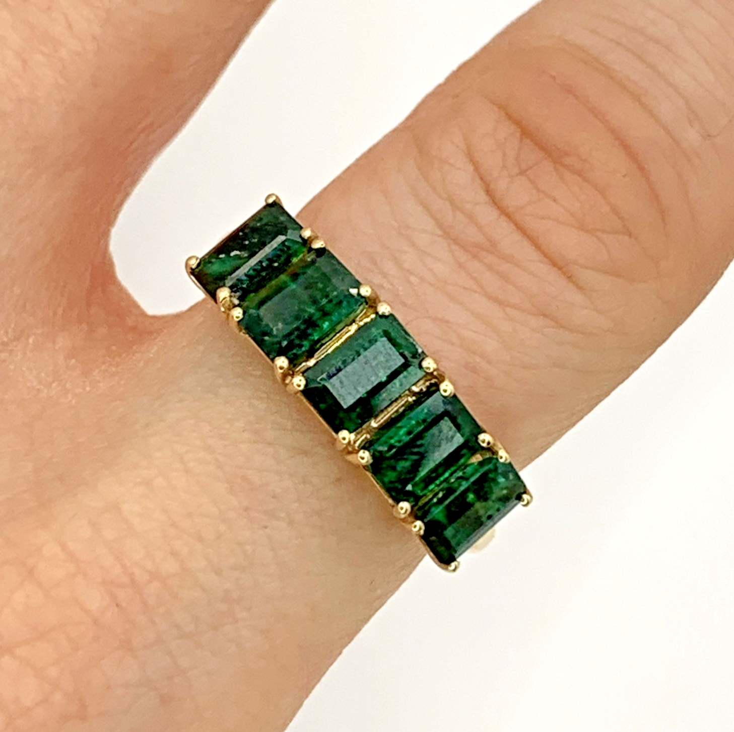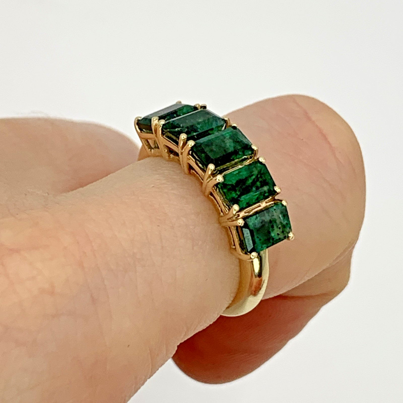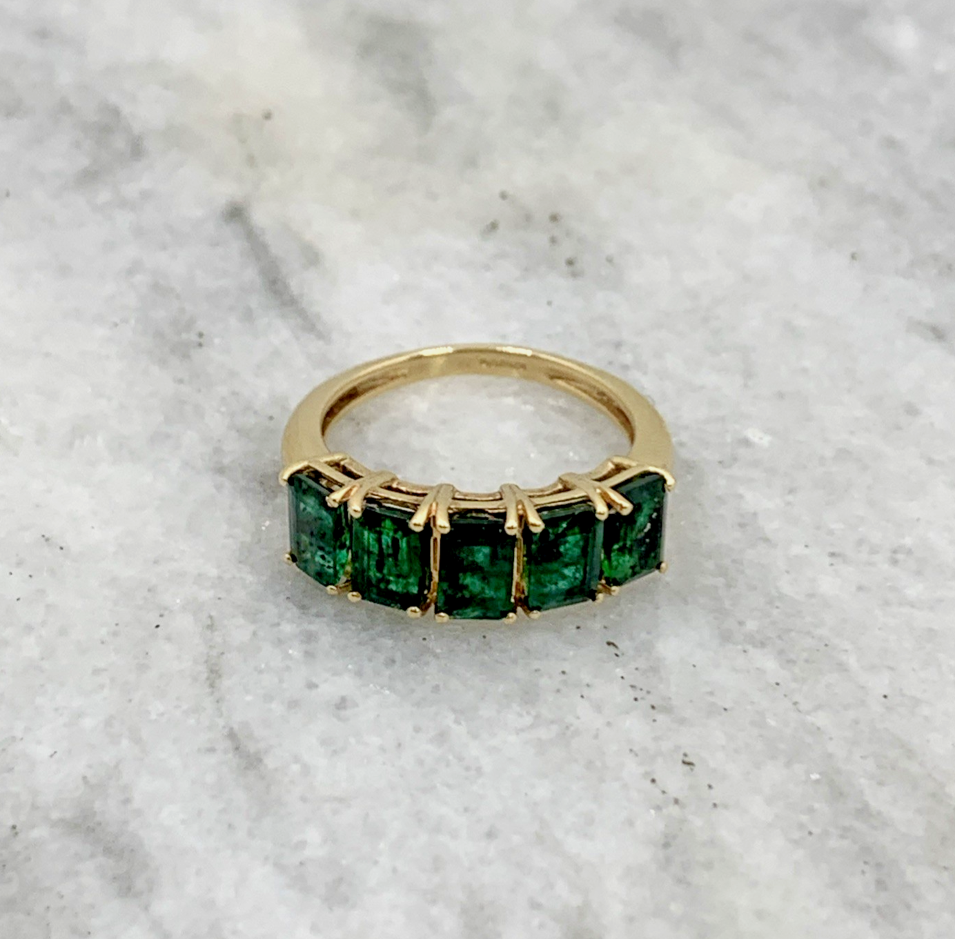 A beautiful gold ring featuring a row of five emerald cut Zambian emeralds.