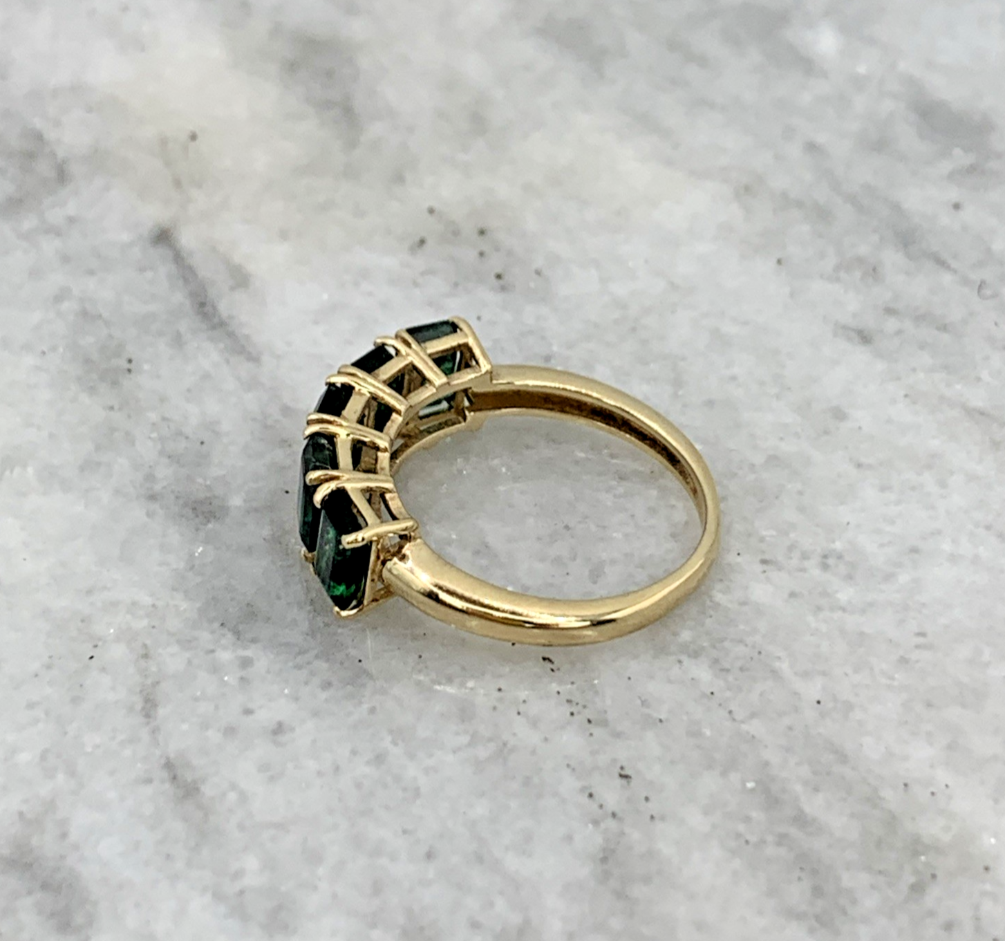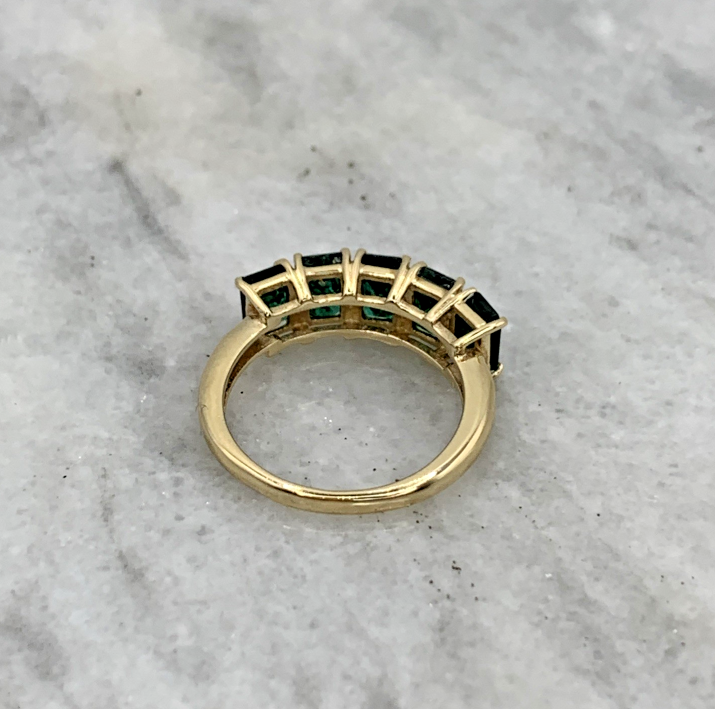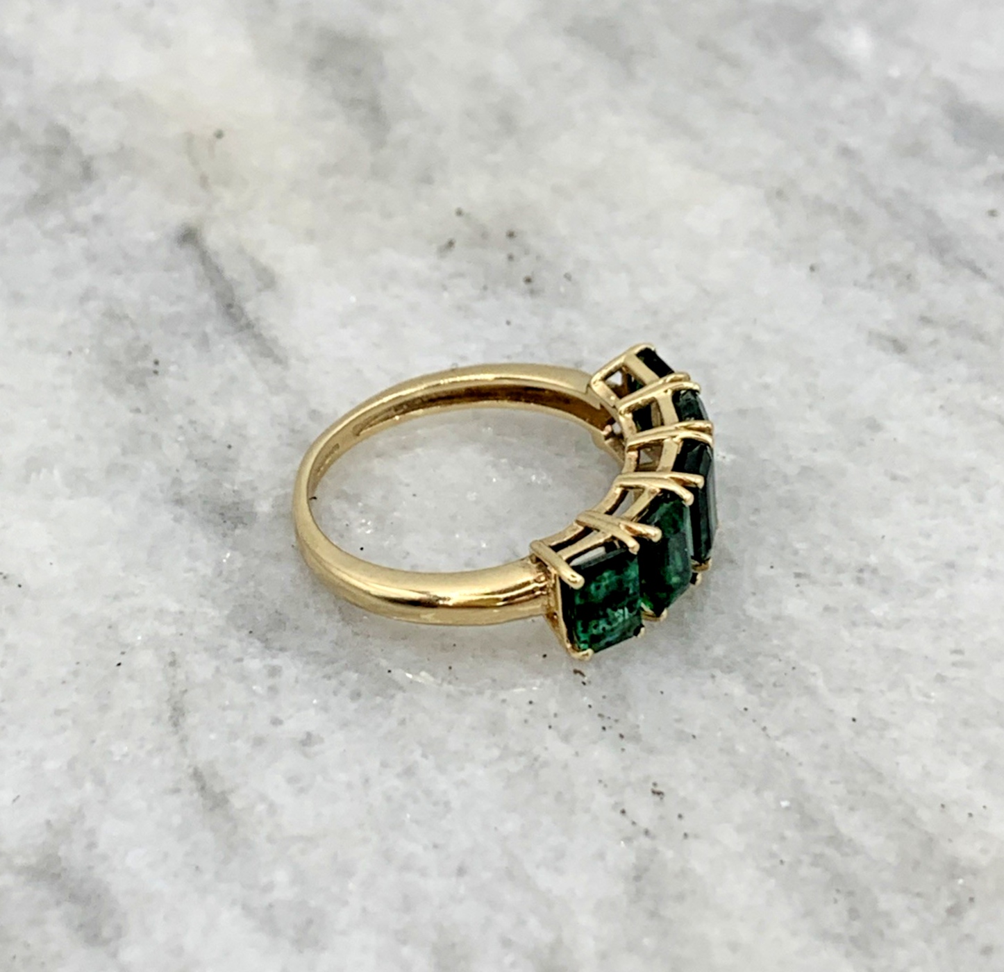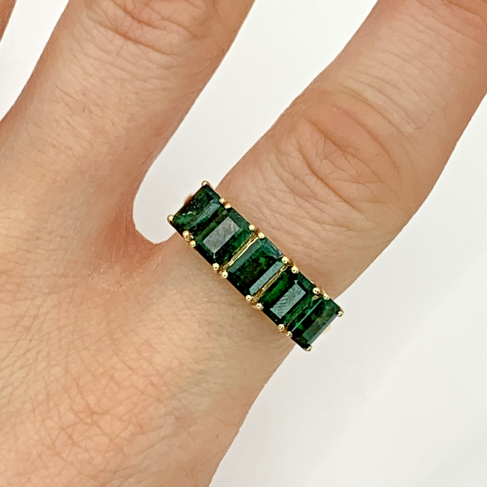 A beautiful gold ring featuring a row of five emerald cut Zambian emeralds.
