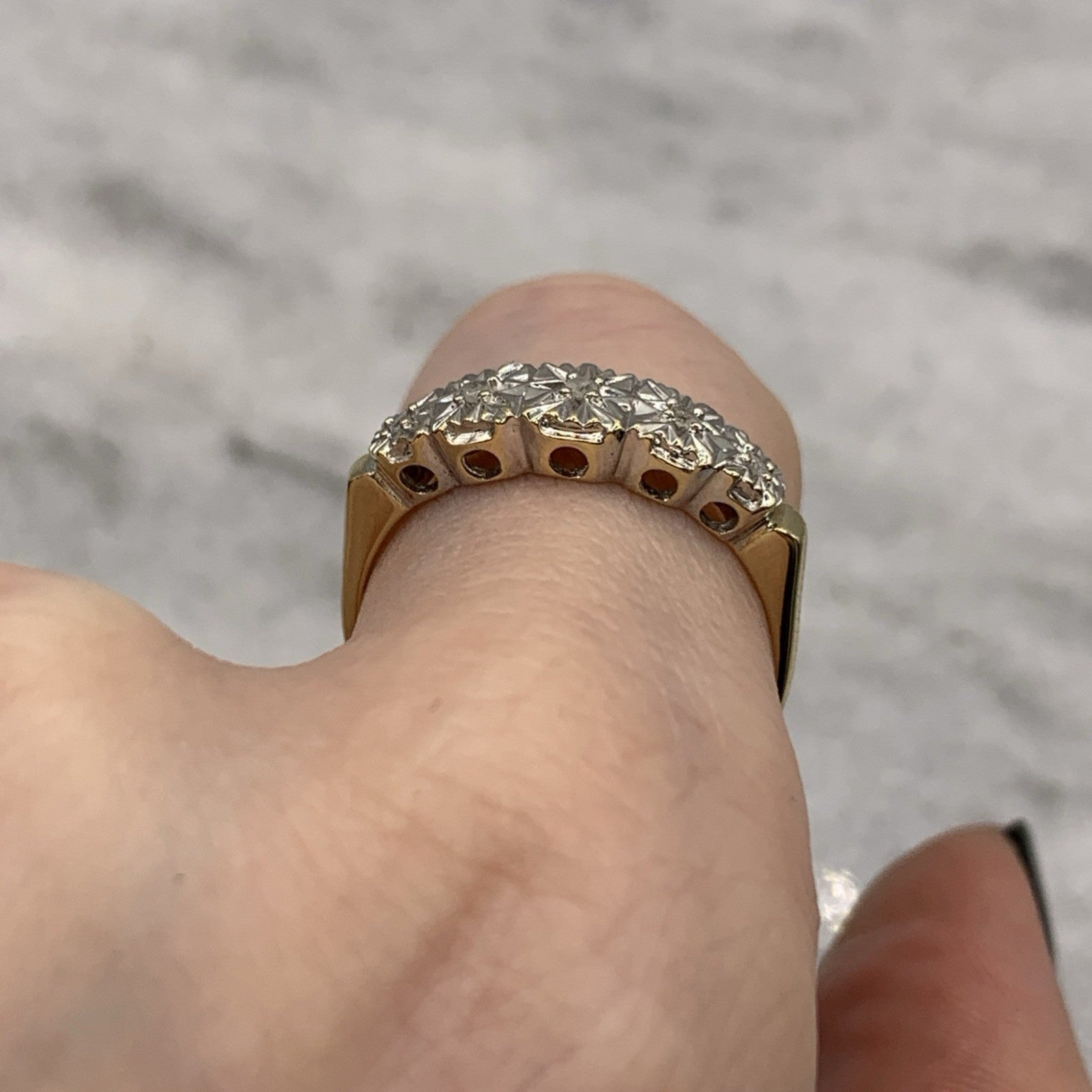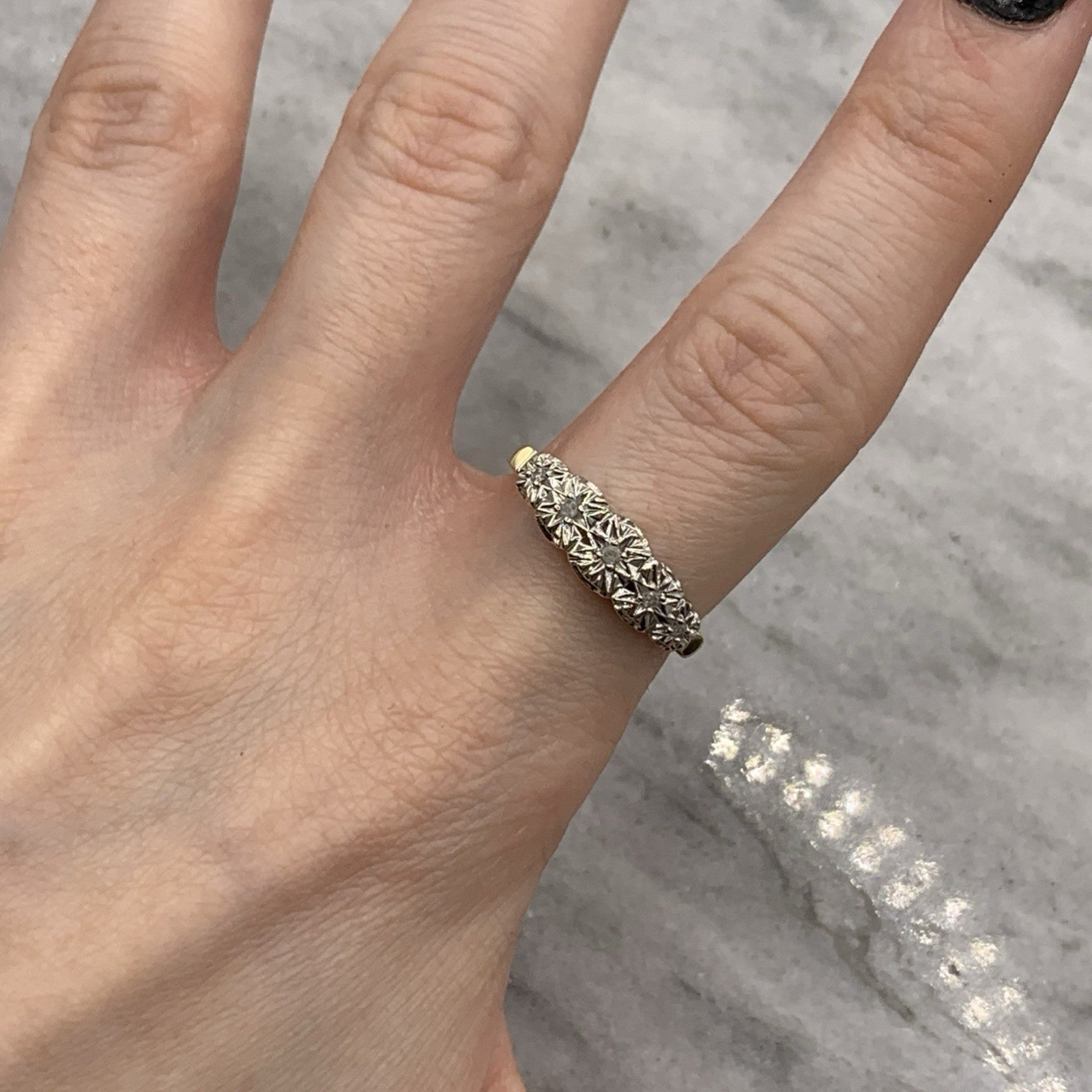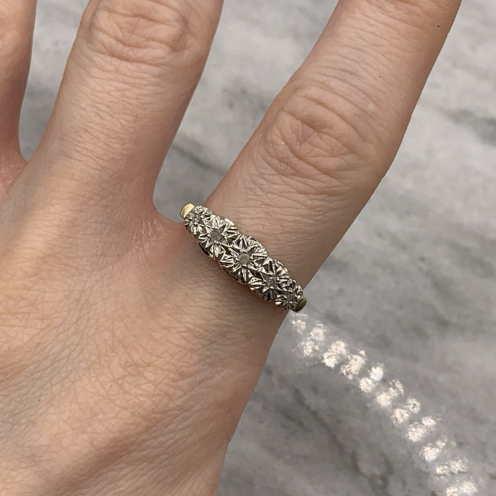 A beautiful yellow gold ring featuring five star set diamonds amounting to .05ct.