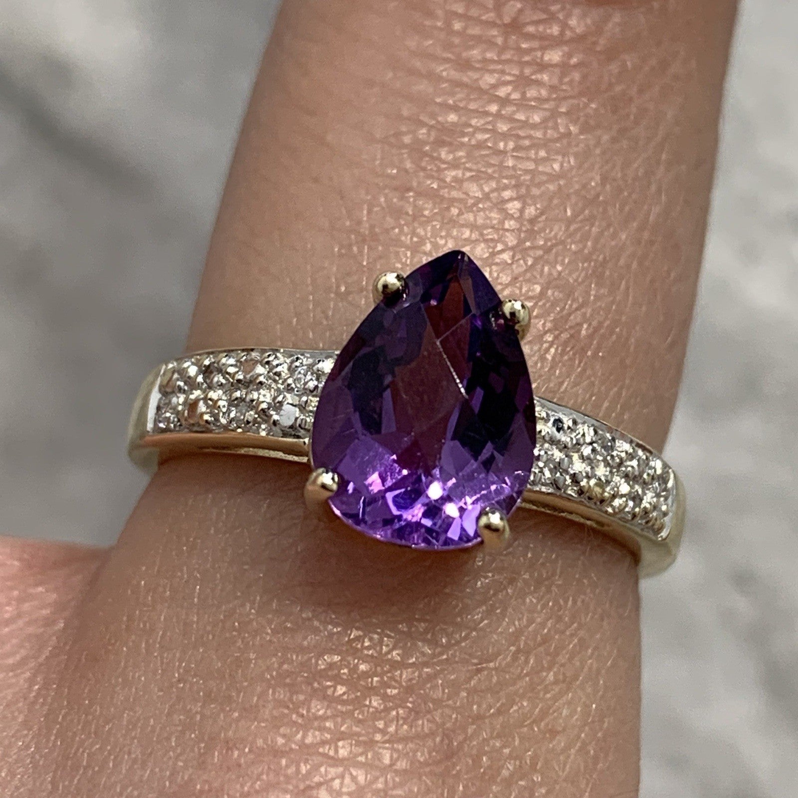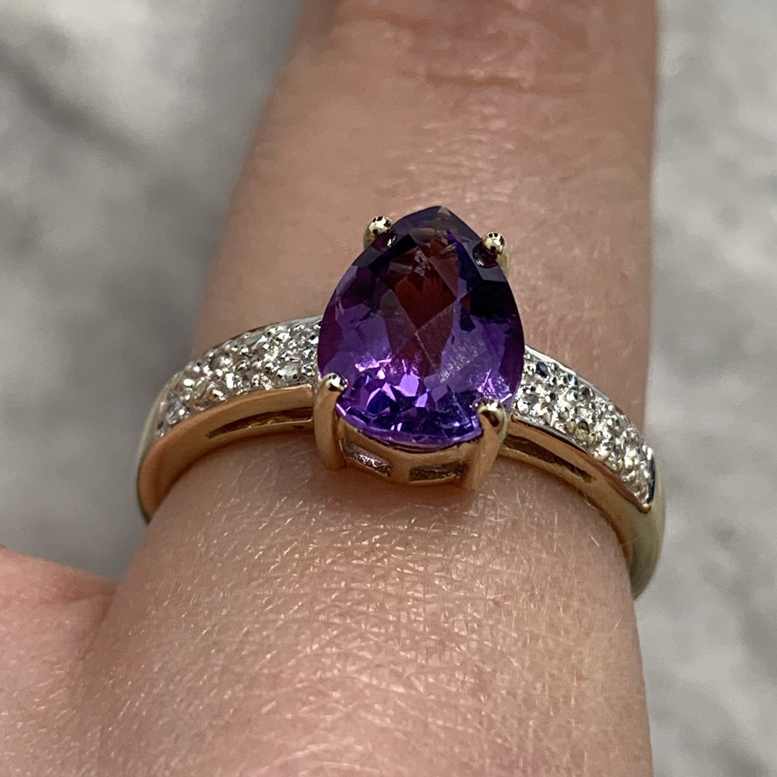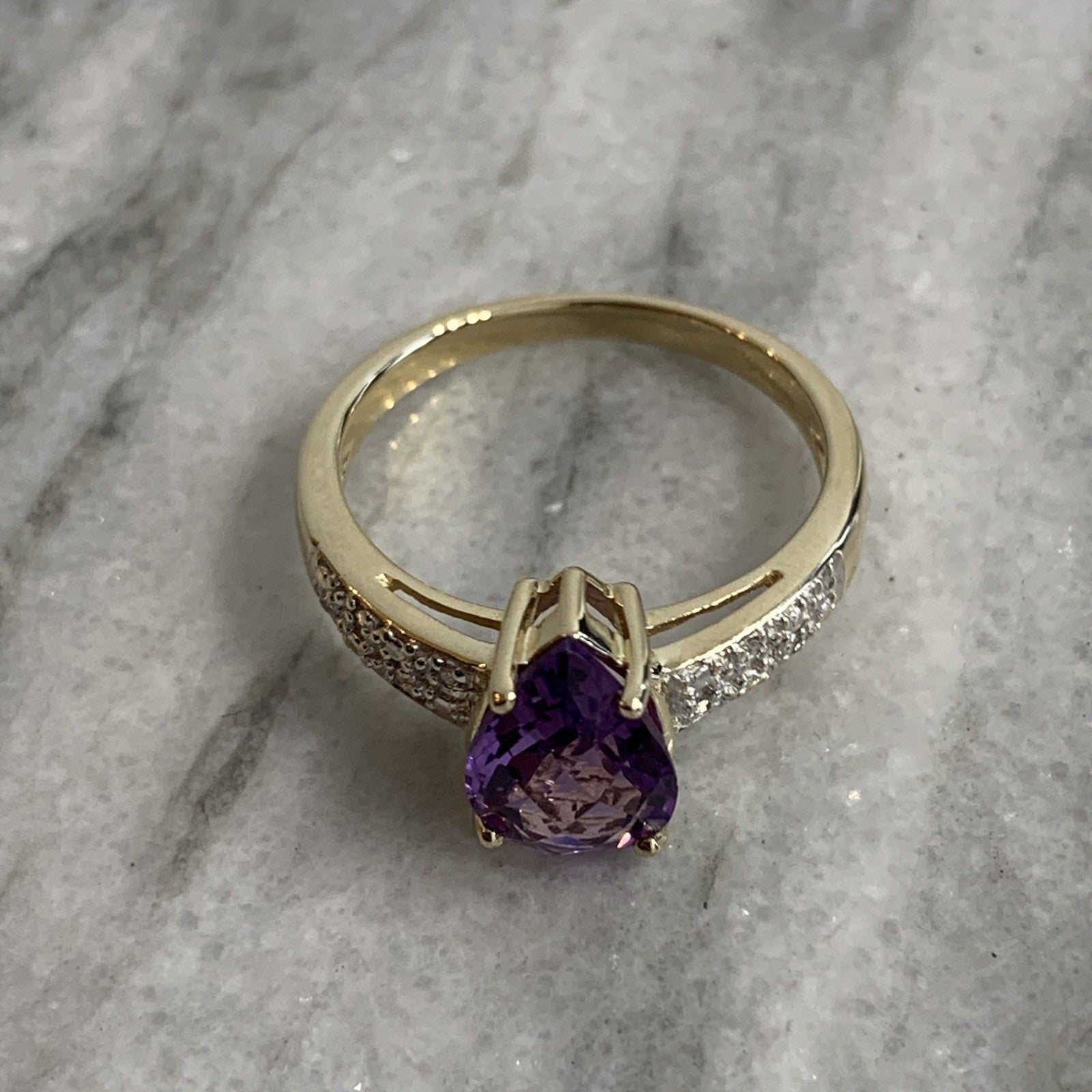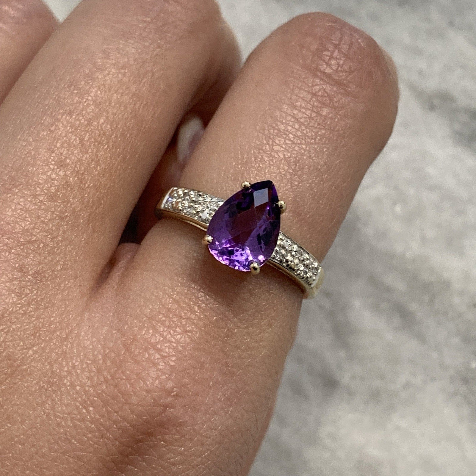 Amethyst Pear Cut with Diamond Accents Band Ring 9ct 375 Yellow Gold - Size N