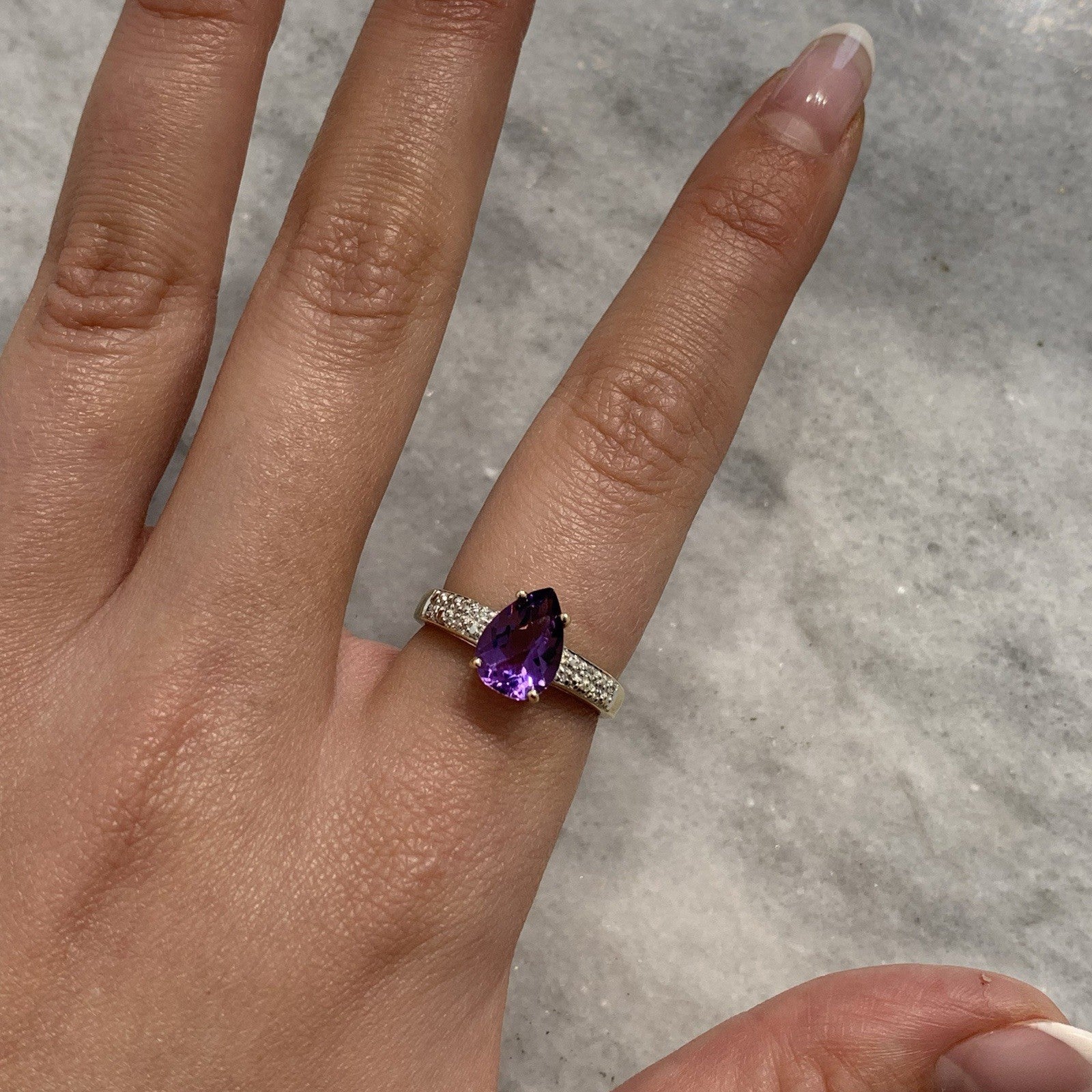 A timeless pear cut amethyst cocktail ring, flanked with diamond accents.