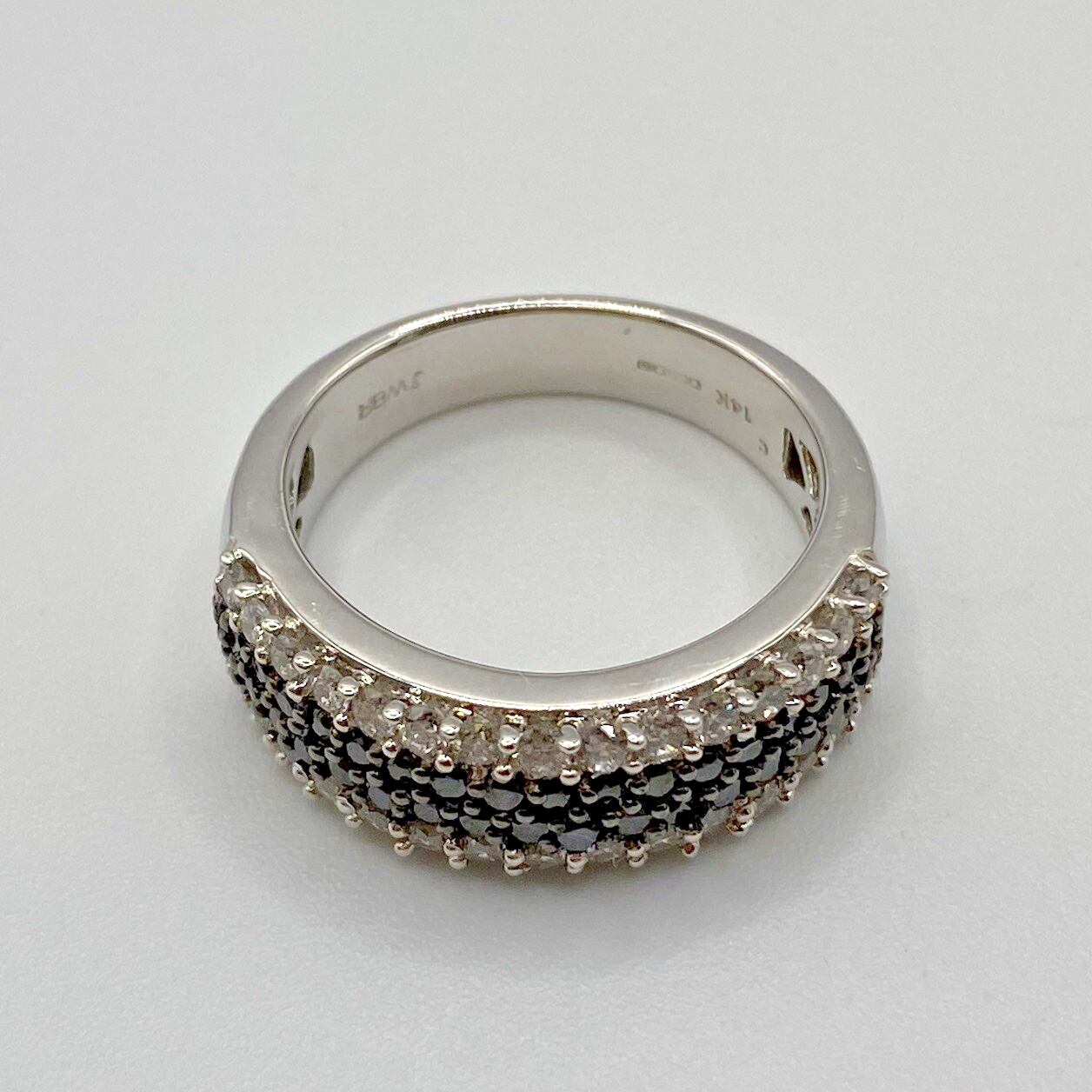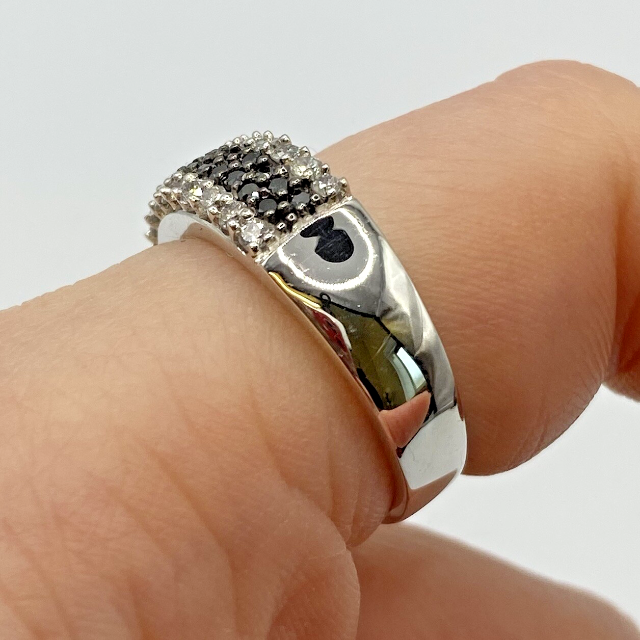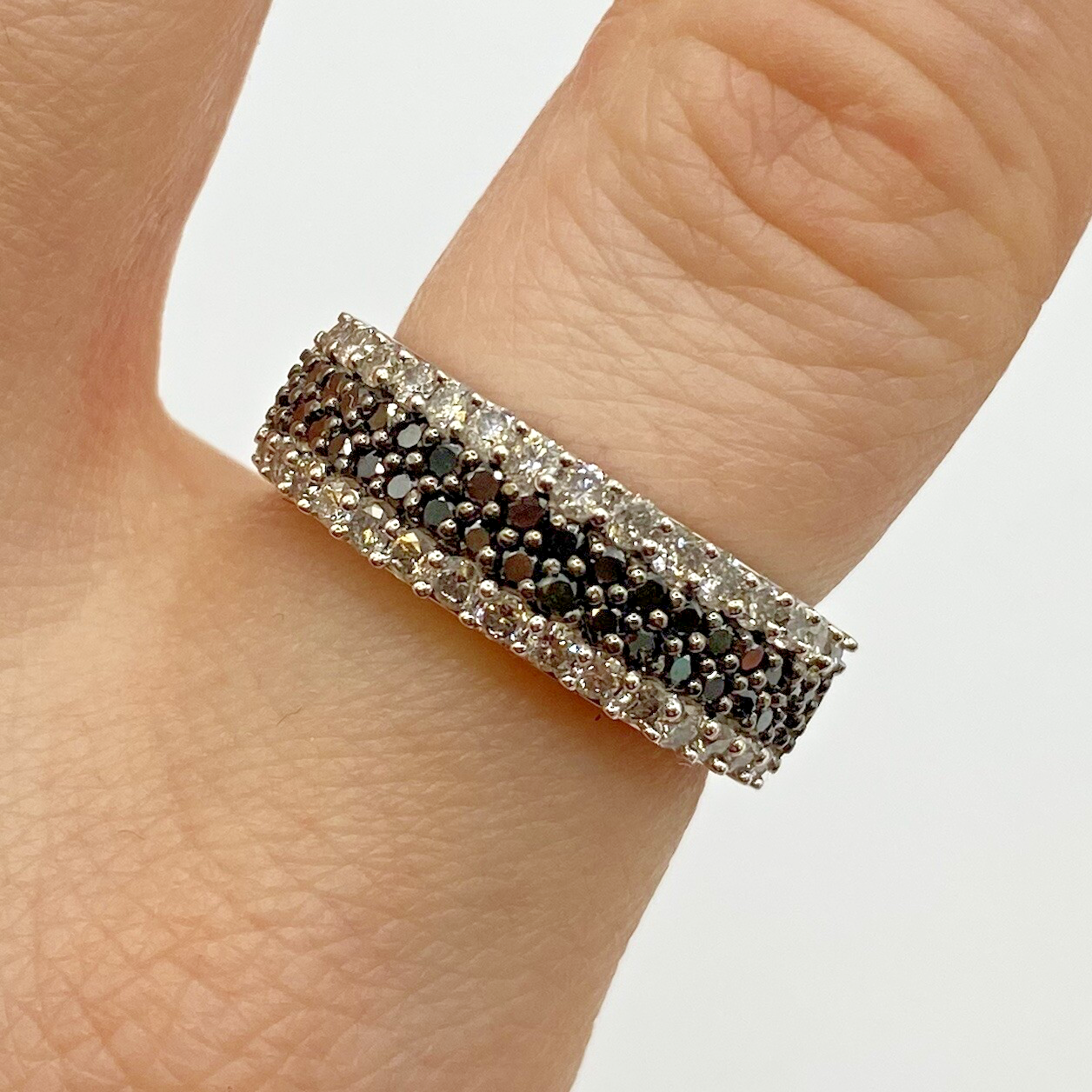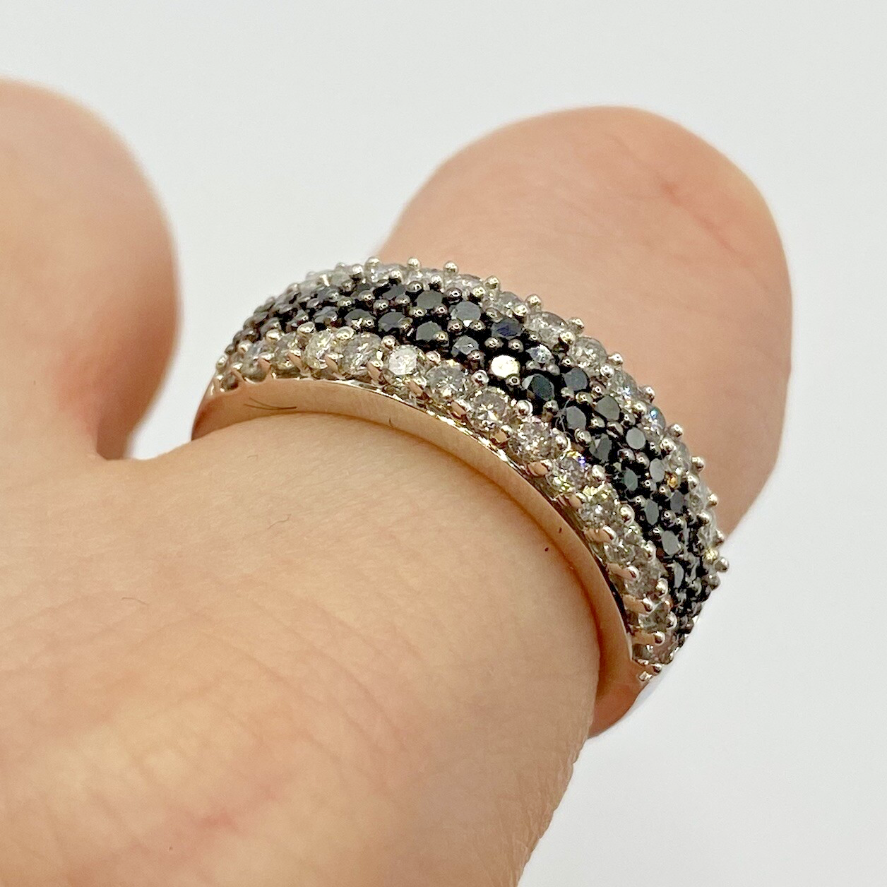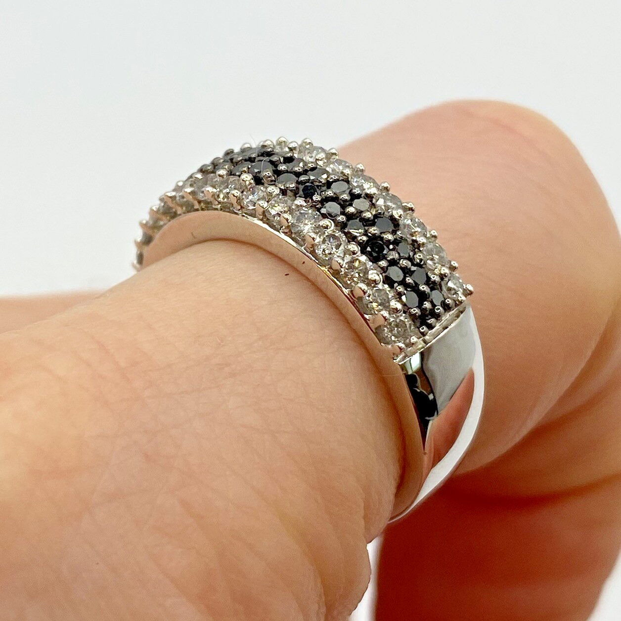A stunning white gold chunky band ring adorned with a collection of petite black and white diamonds amounting to .75ct.