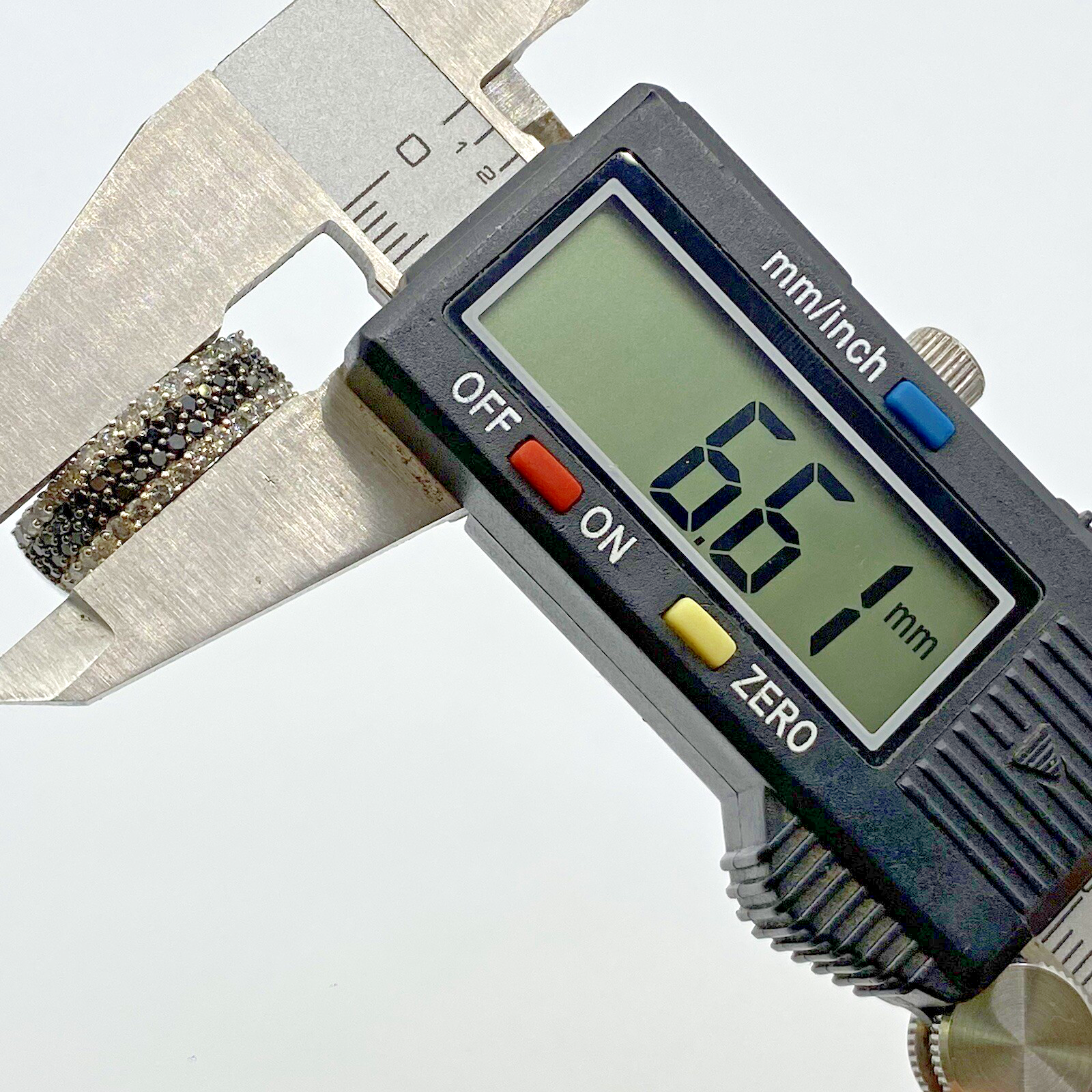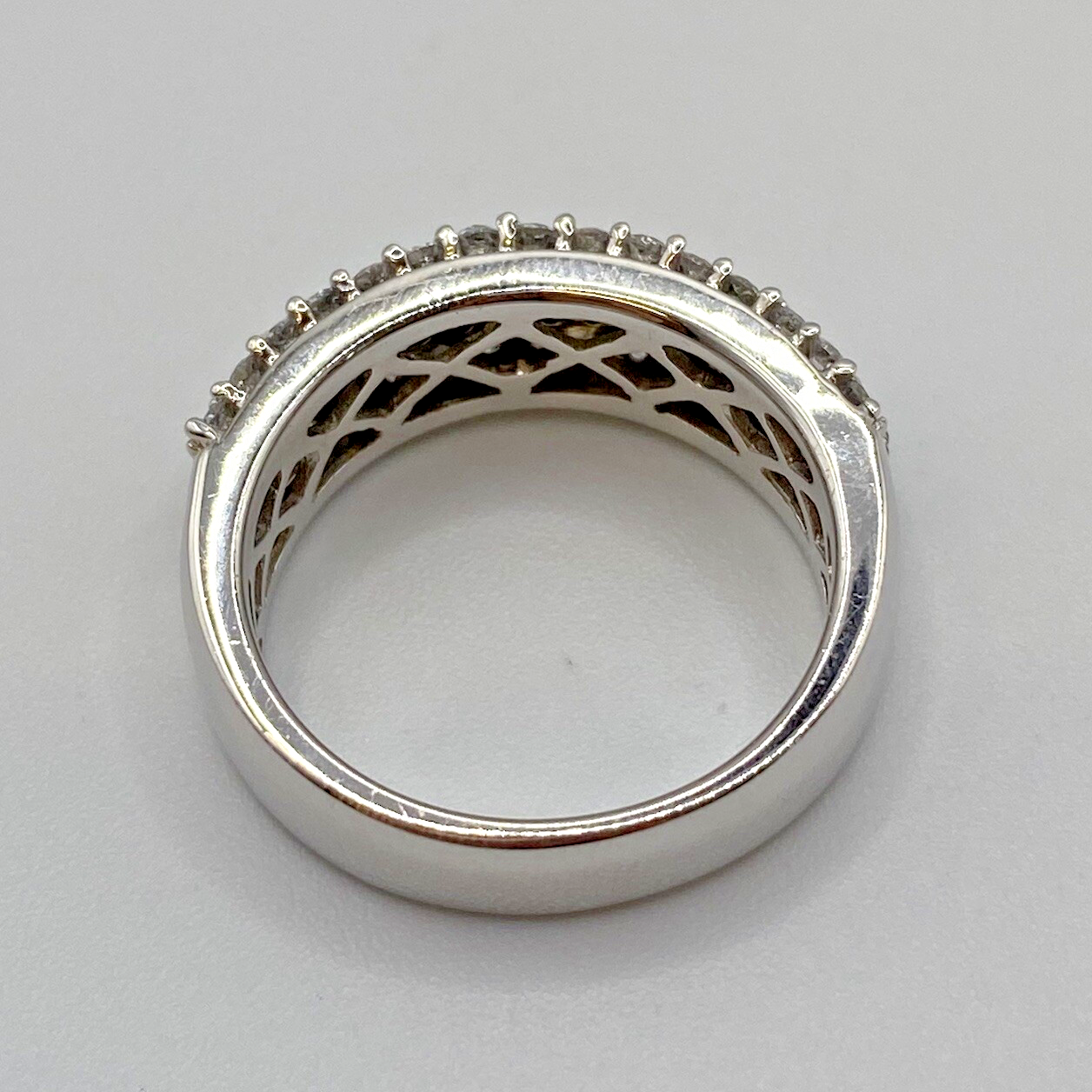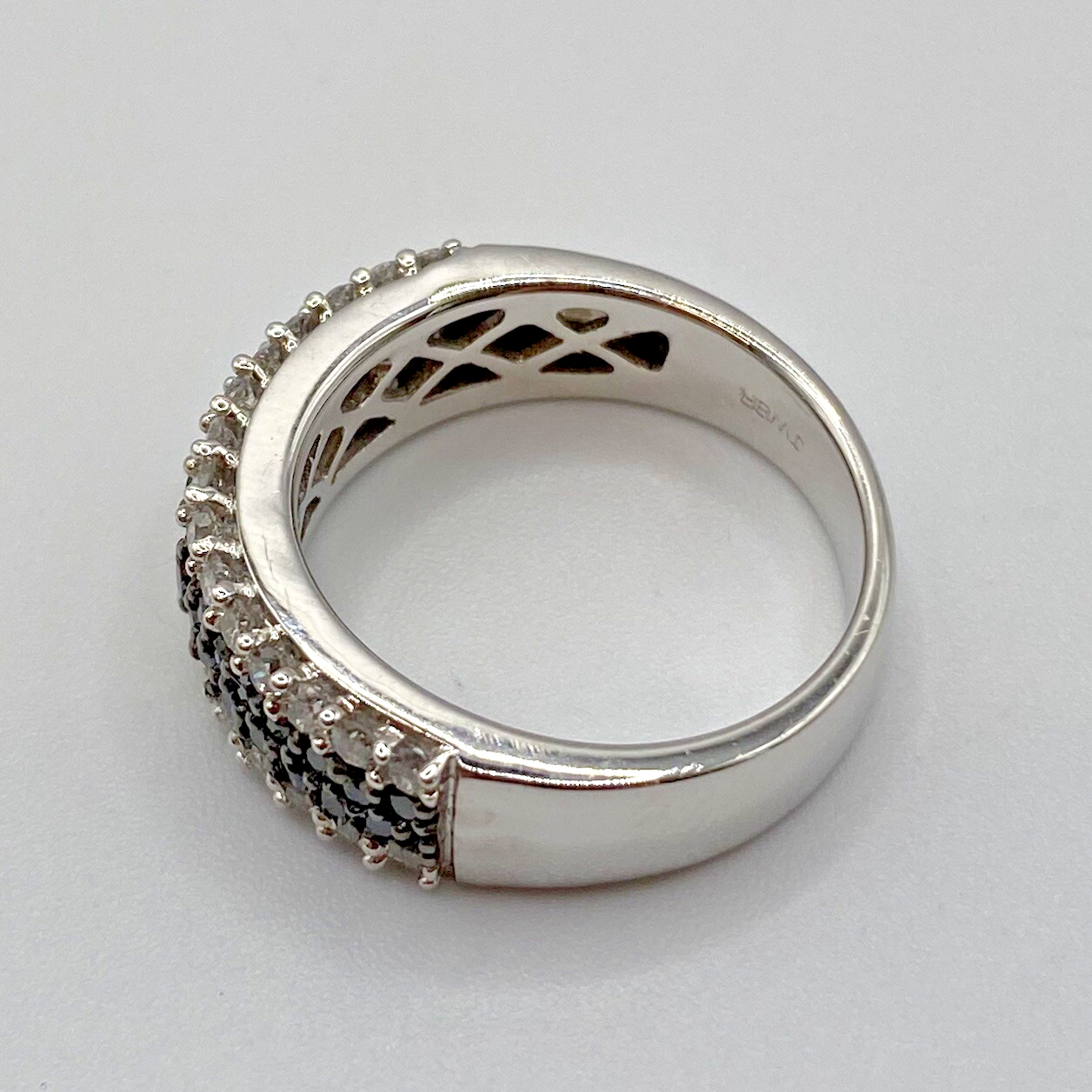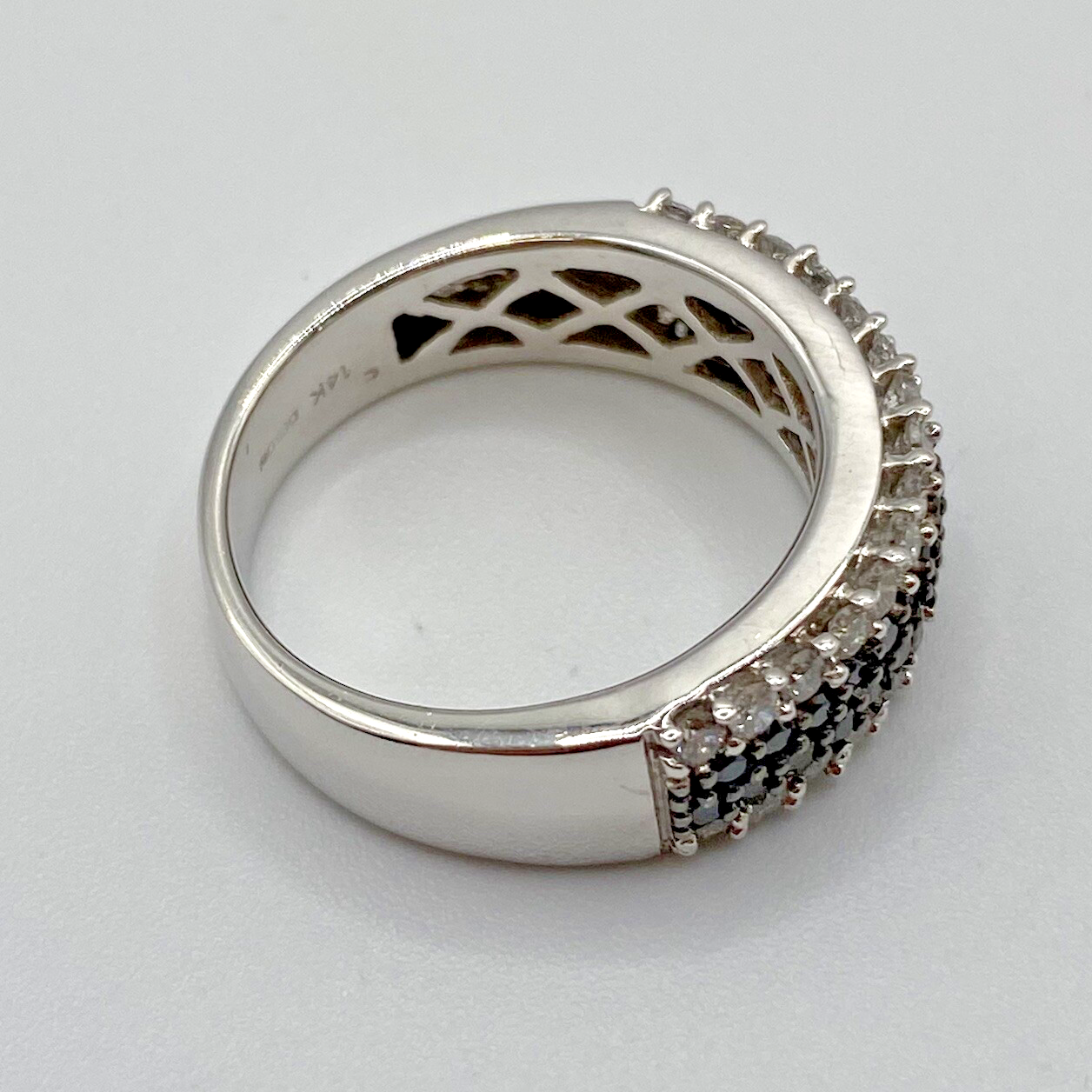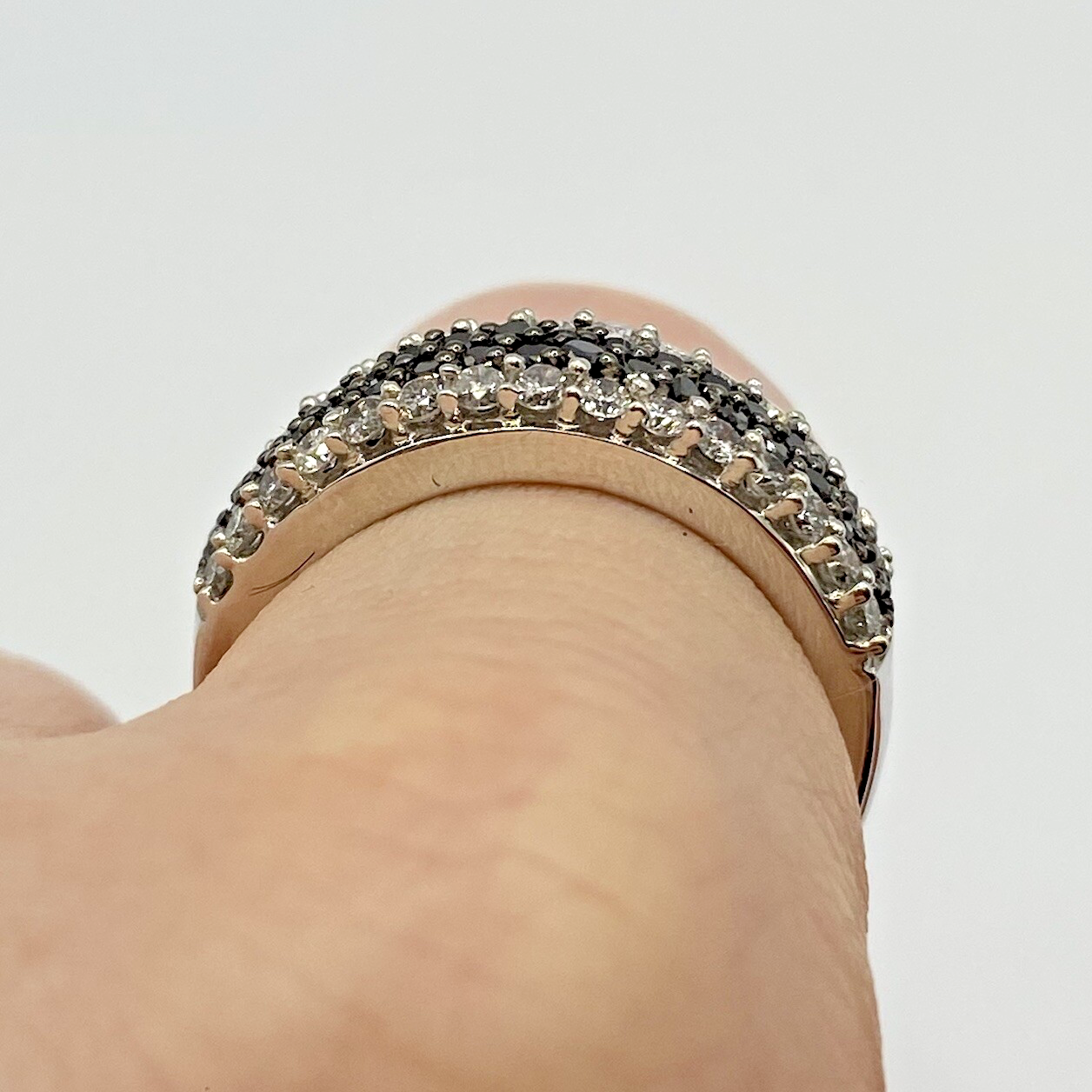 A stunning white gold chunky band ring adorned with a collection of petite black and white diamonds amounting to .75ct.
