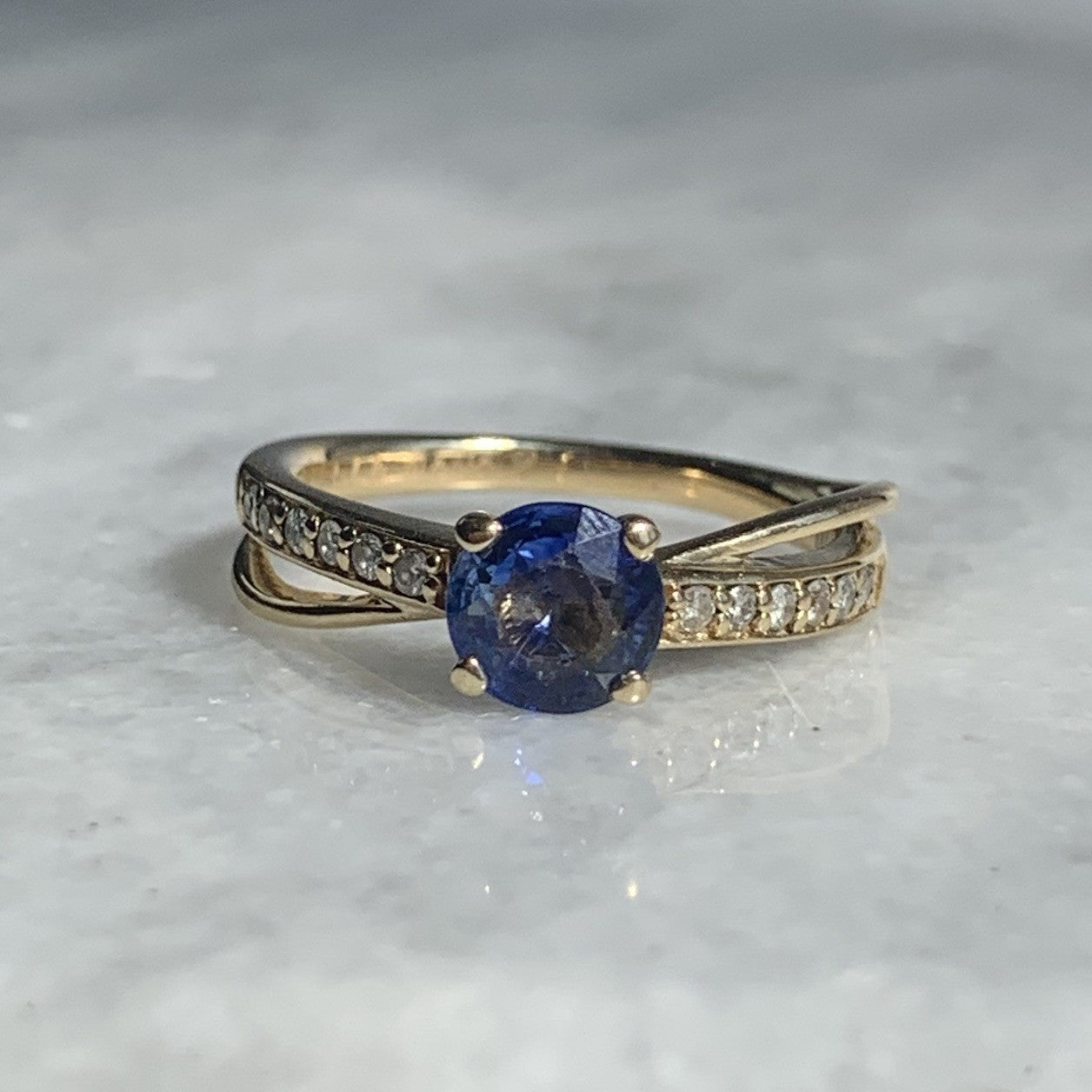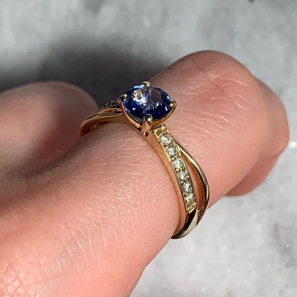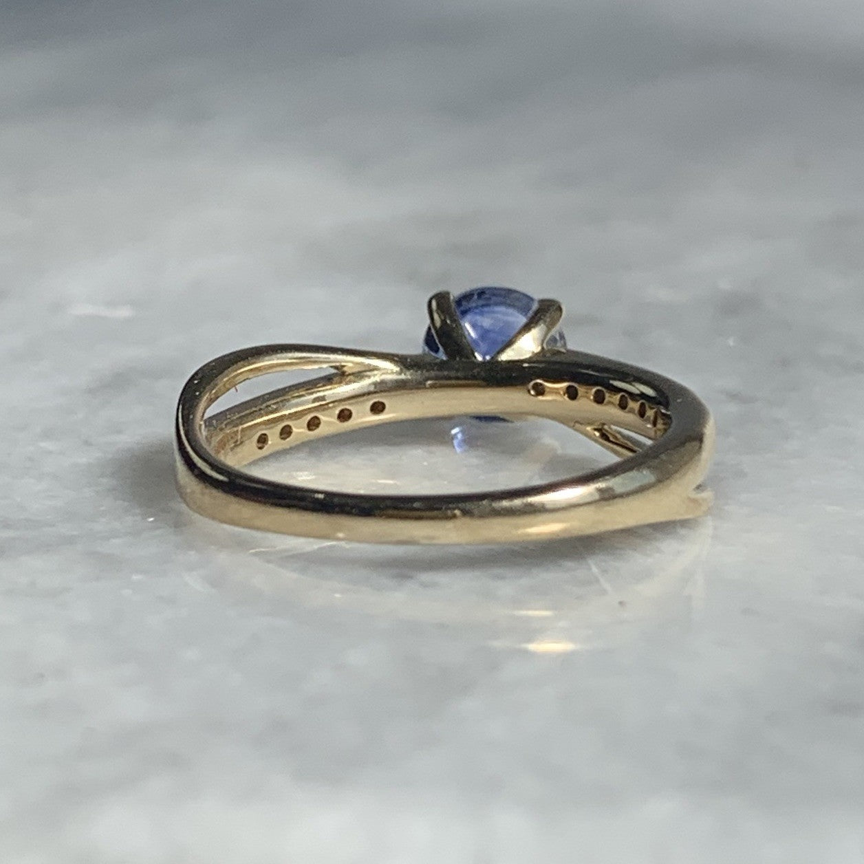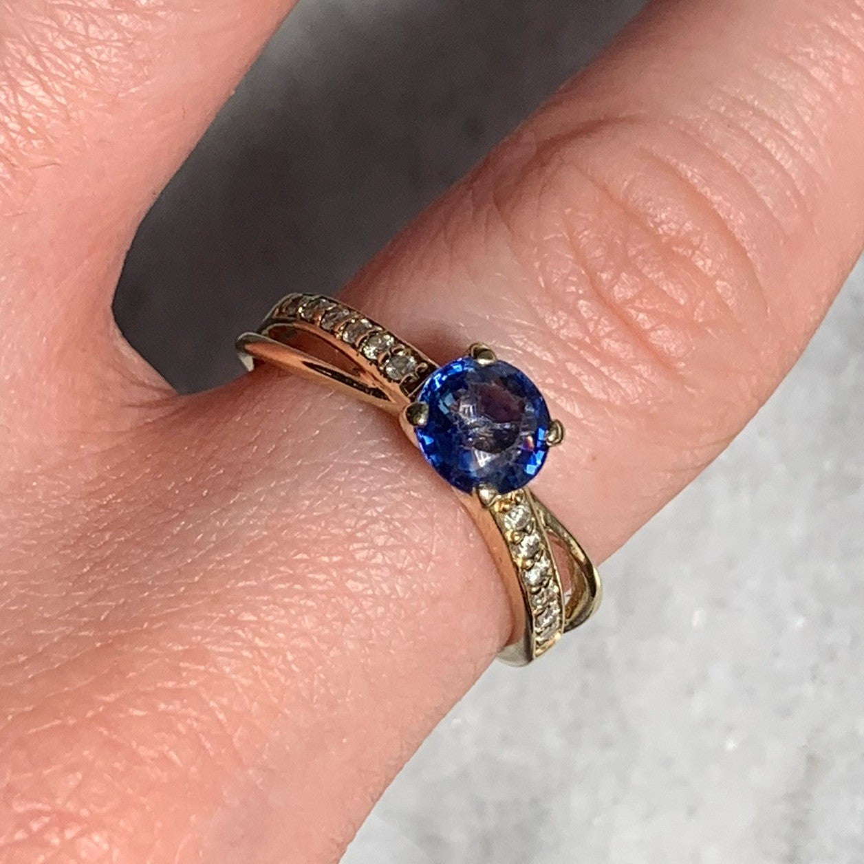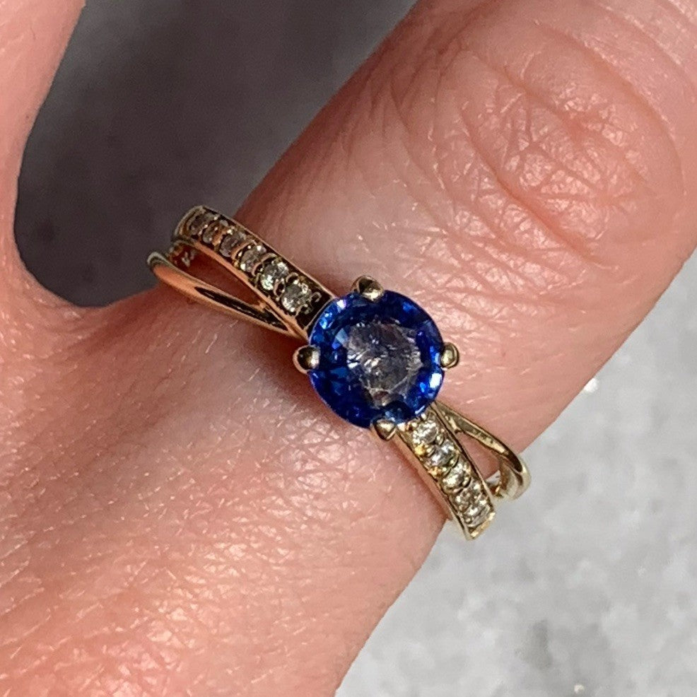 A stunning gold crossover style ring showcasing a round cut blue topaz gemstone, accented by pave set diamonds on the shoulders.