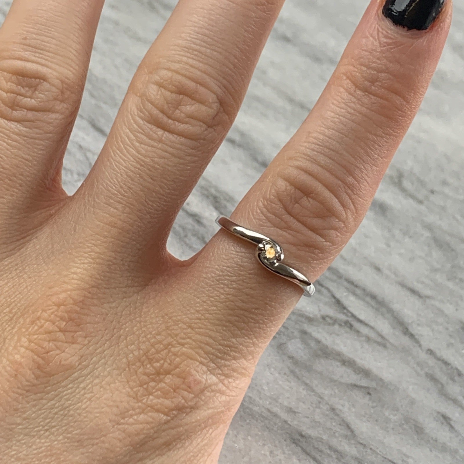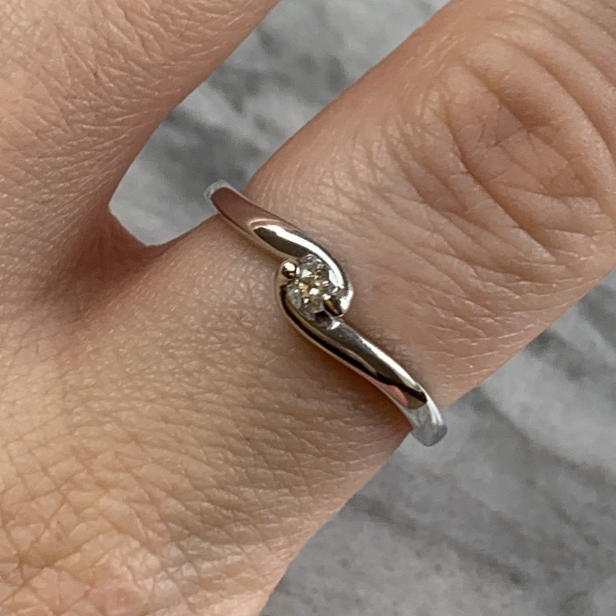 A charming white gold bypass style ring showcasing a solitaire diamond.