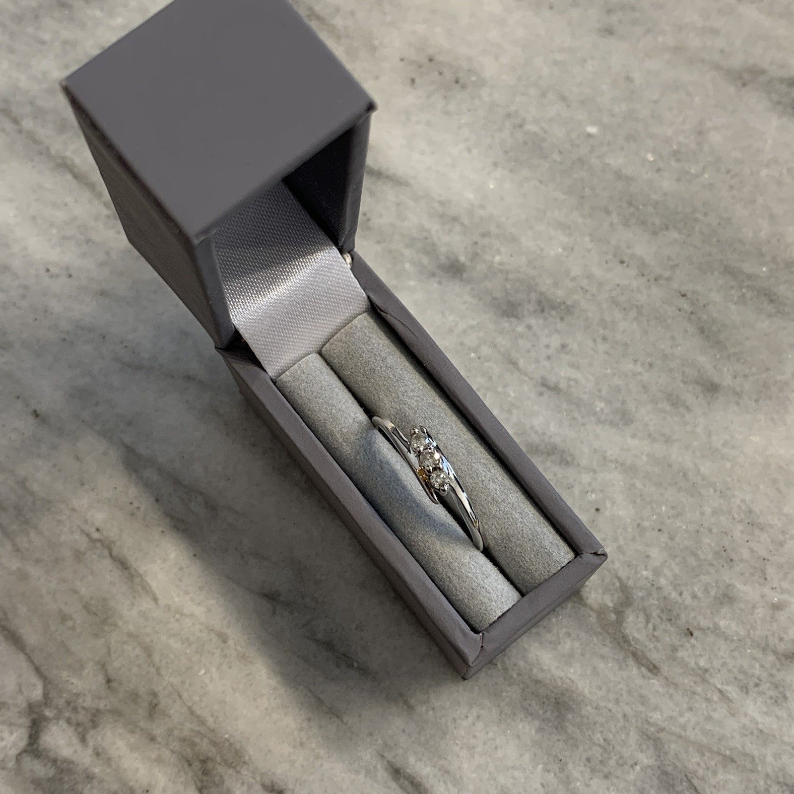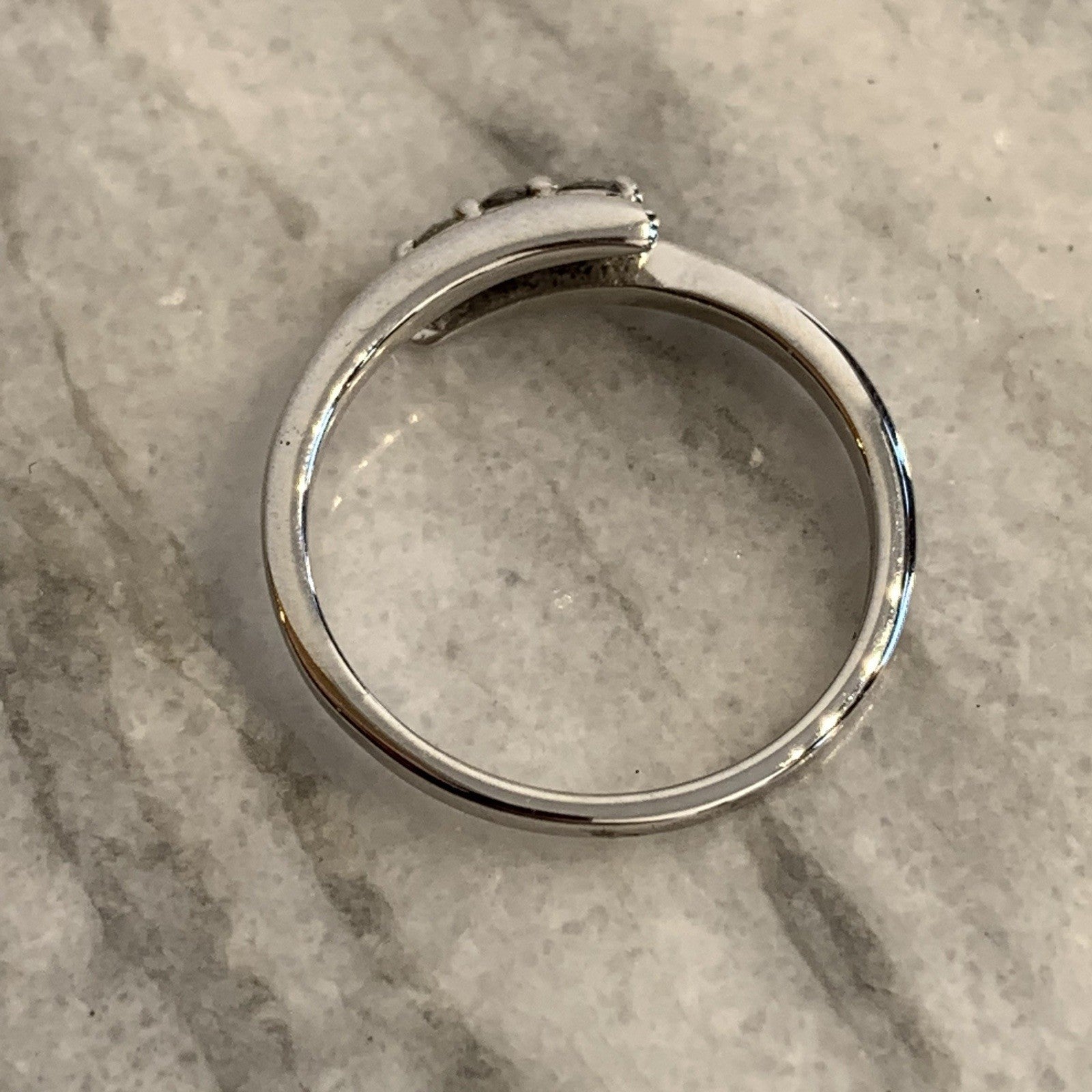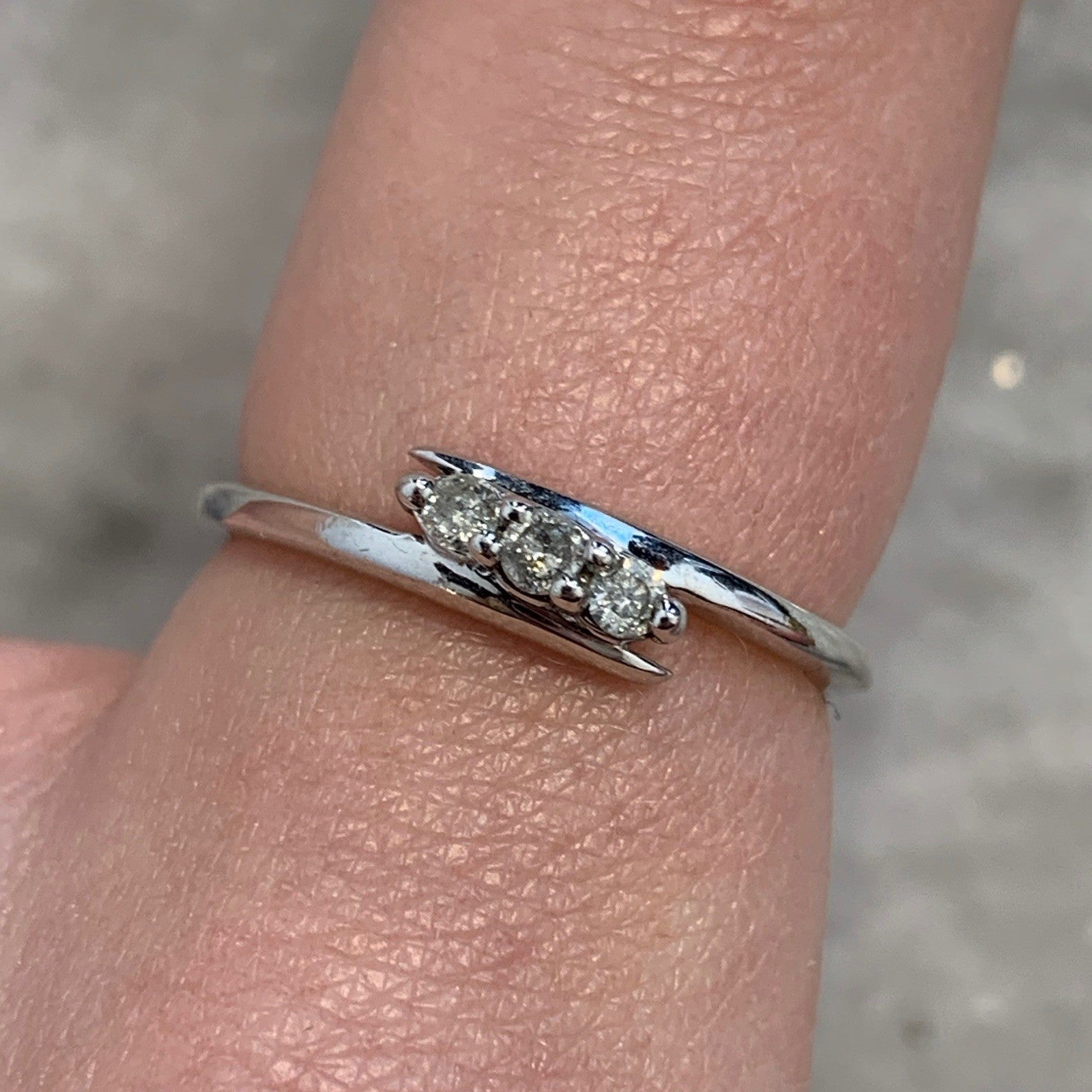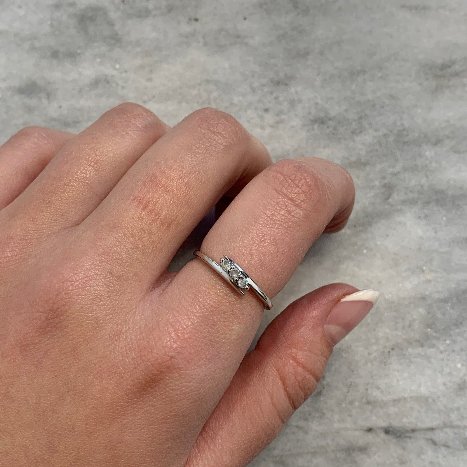 A lovely white gold bypass ring holding a trilogy of diamonds at .10ct.