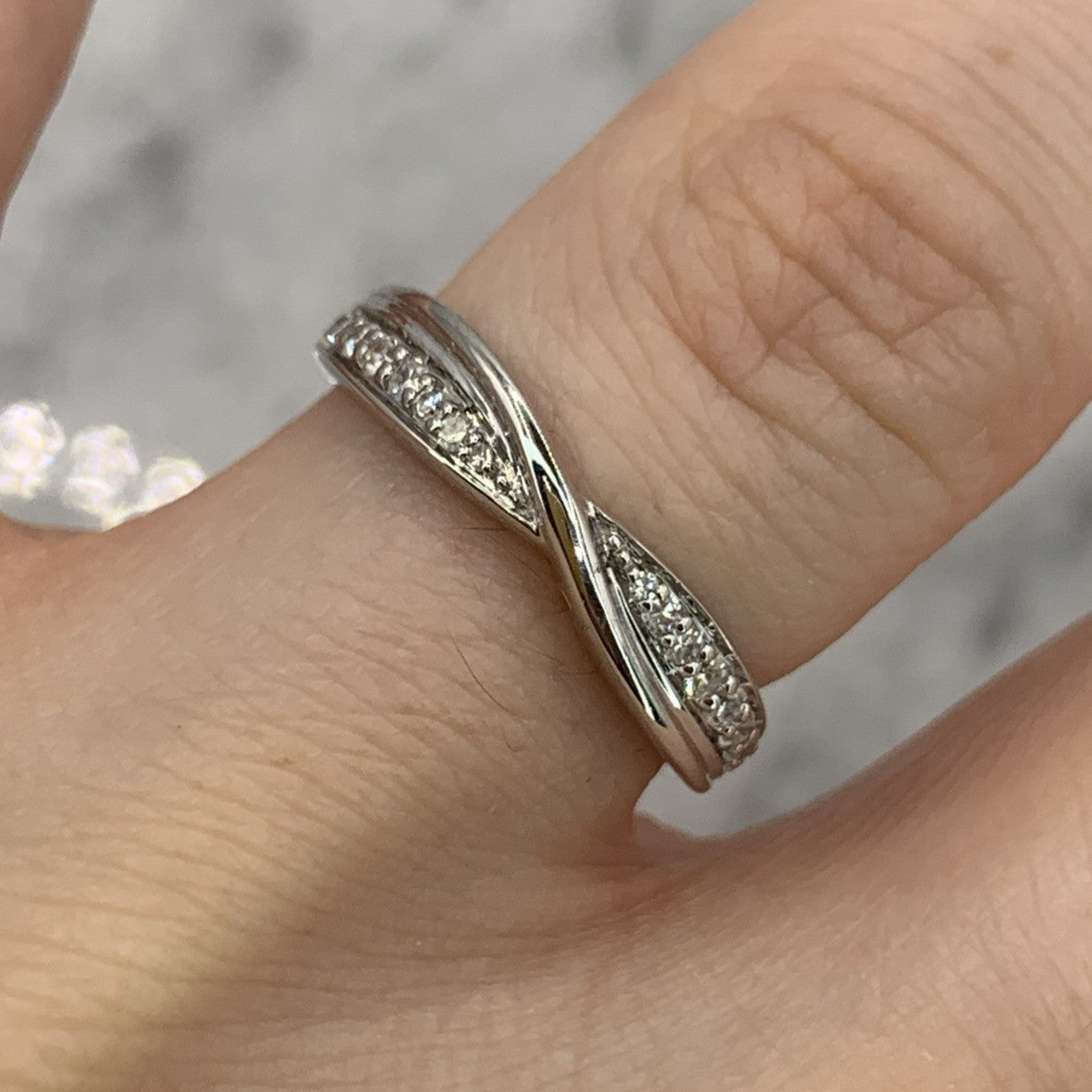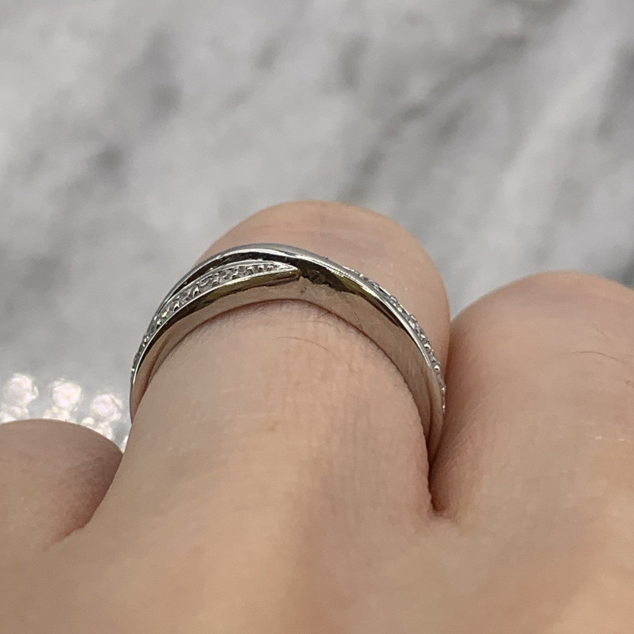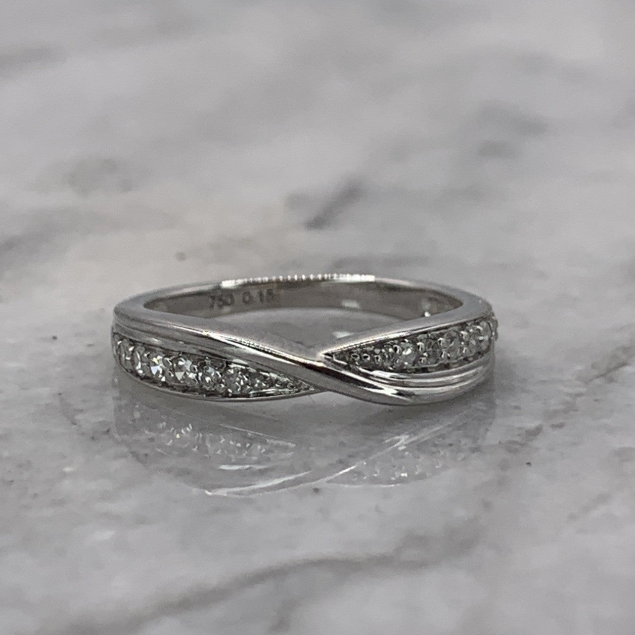 A stunning white gold crossover twist style band ring featuring a collection of petite pave set diamonds amounting to .15ct.
