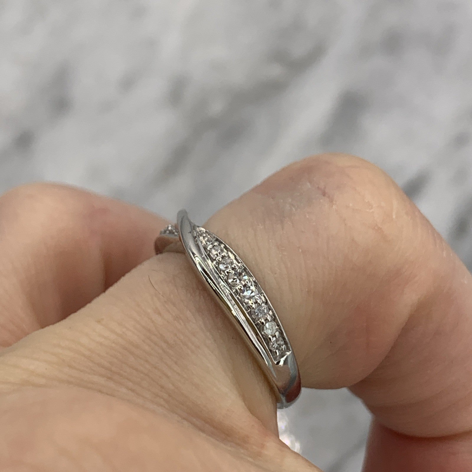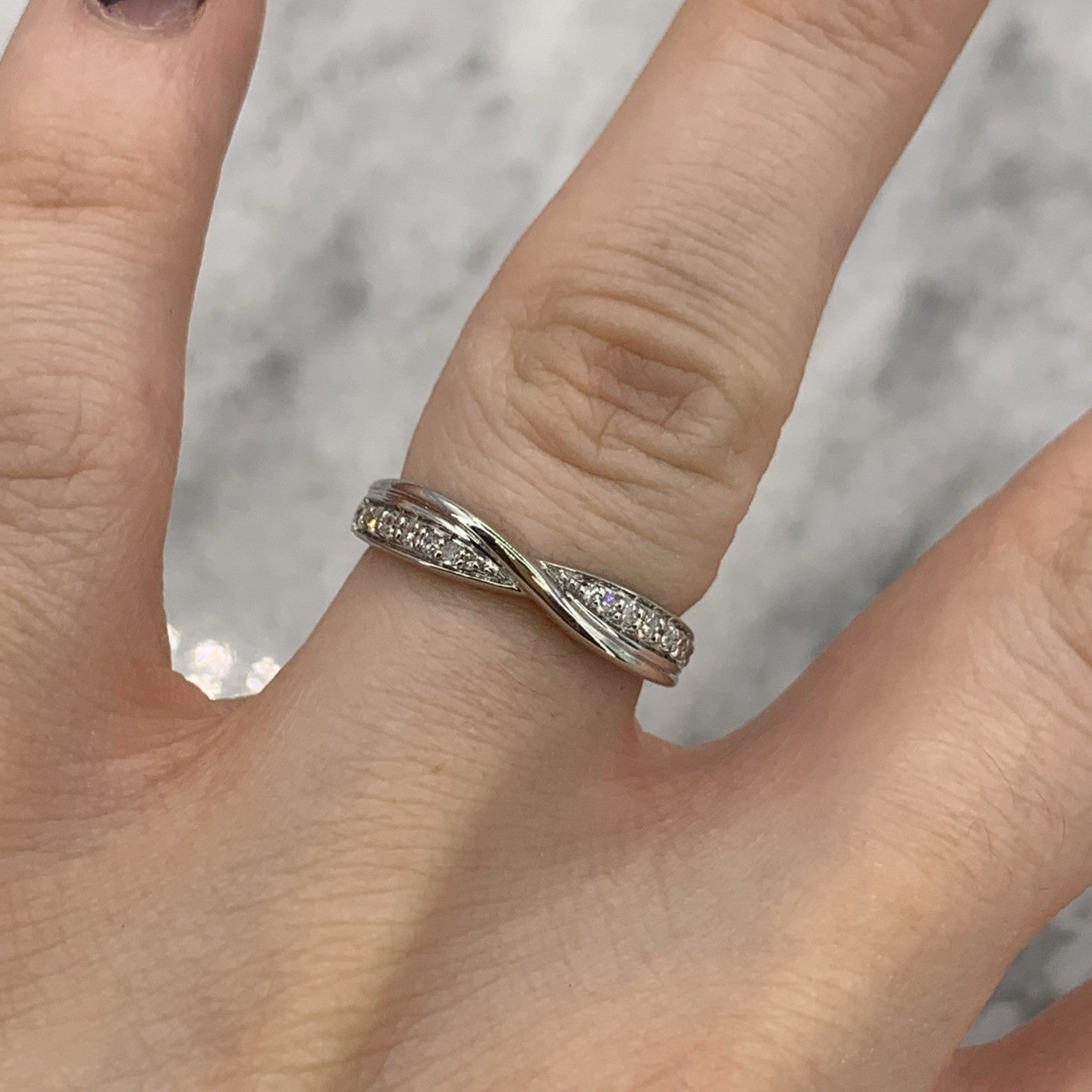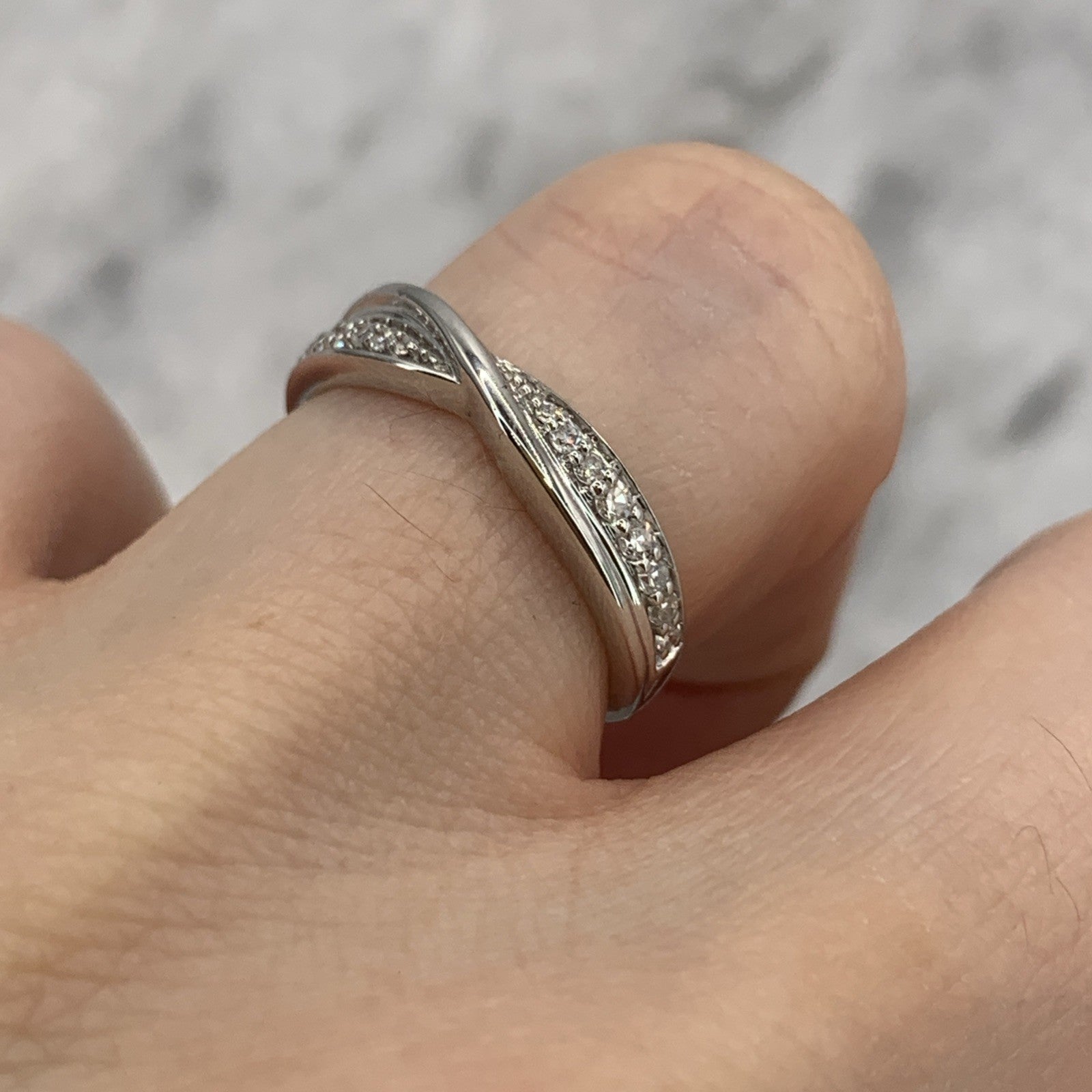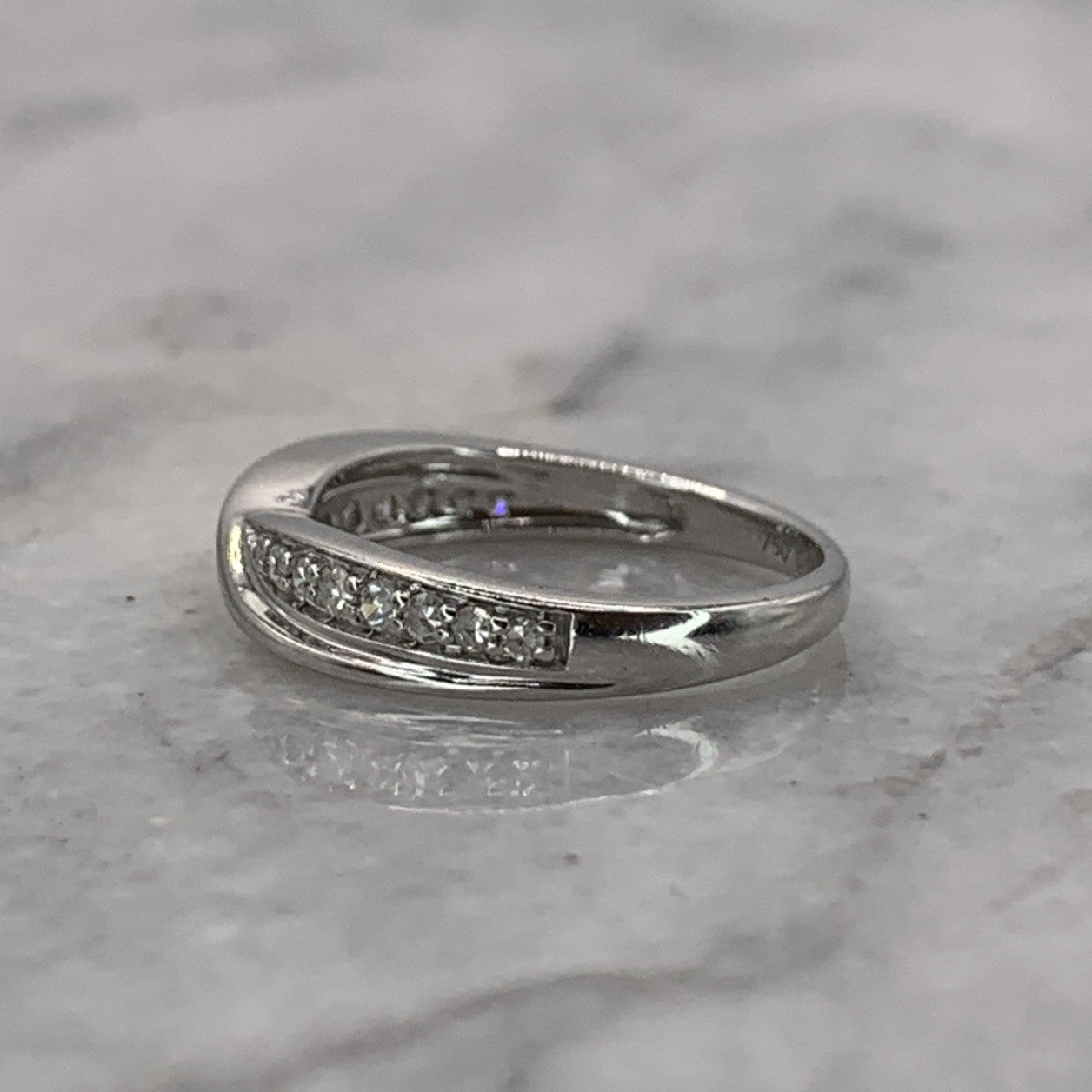 A stunning white gold crossover twist style band ring featuring a collection of petite pave set diamonds amounting to .15ct.