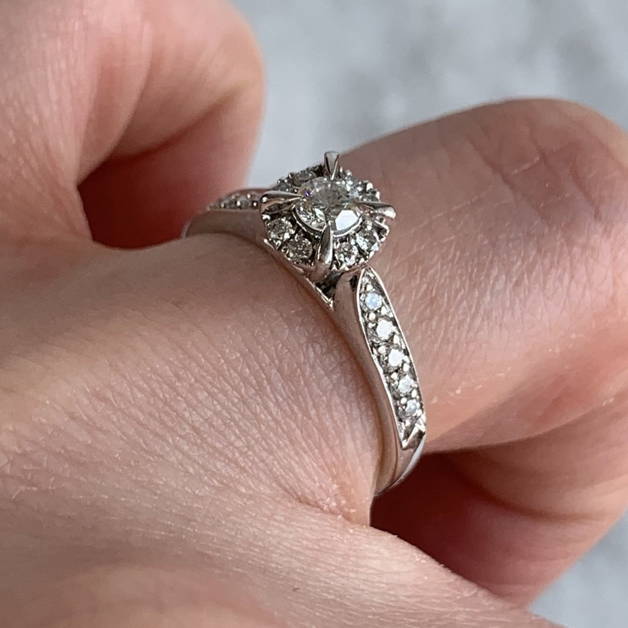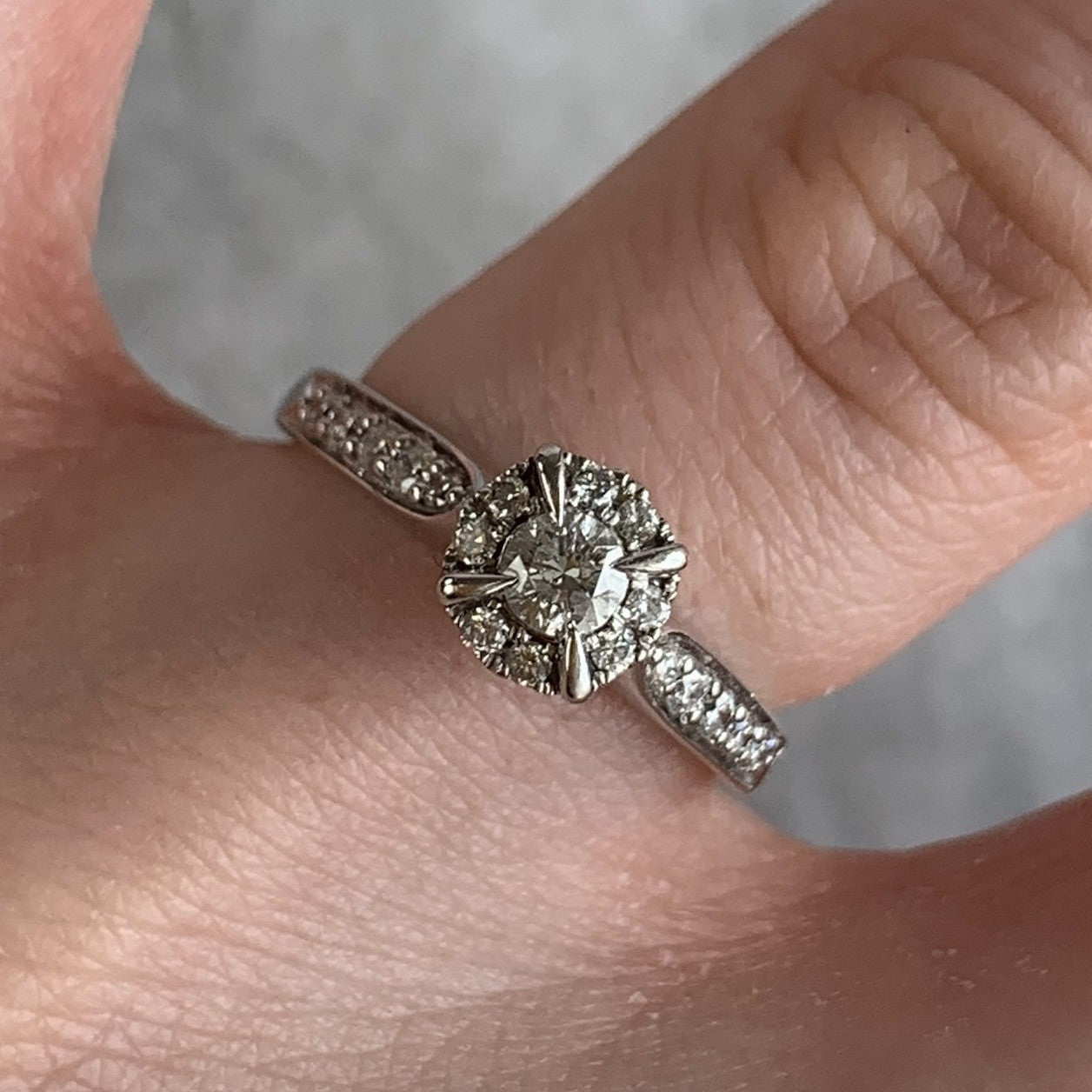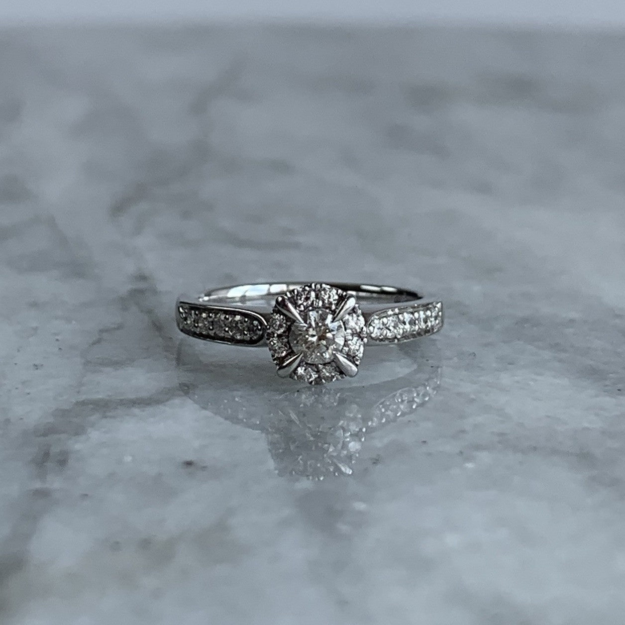 A lovely white gold ring showcasing a round diamond cluster, with additional diamonds on the shoulders to accent.