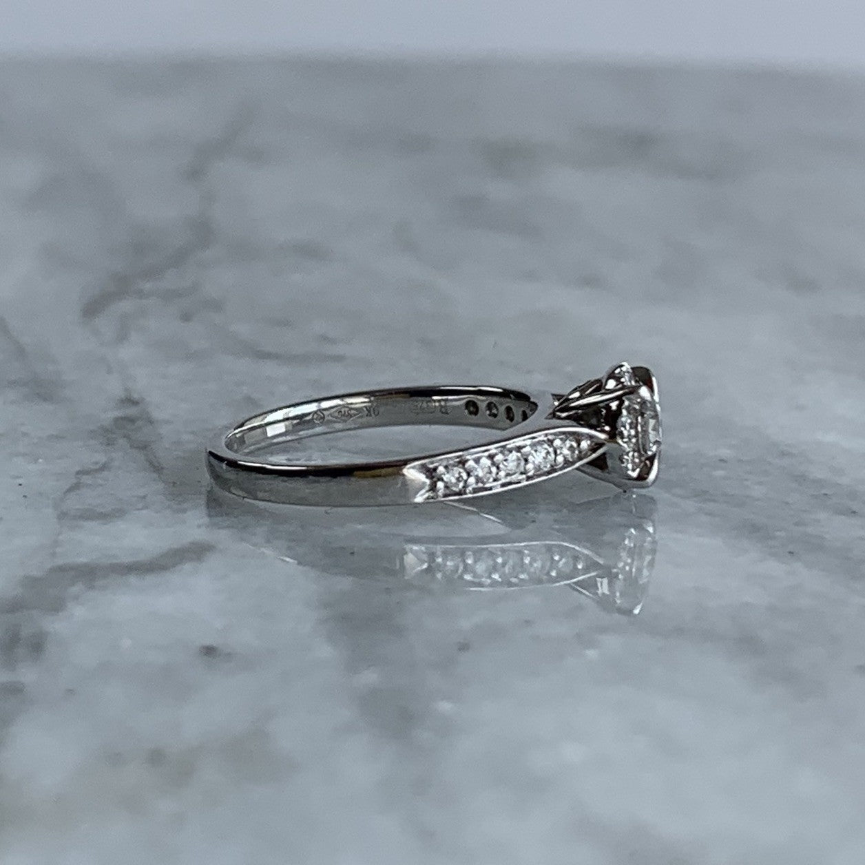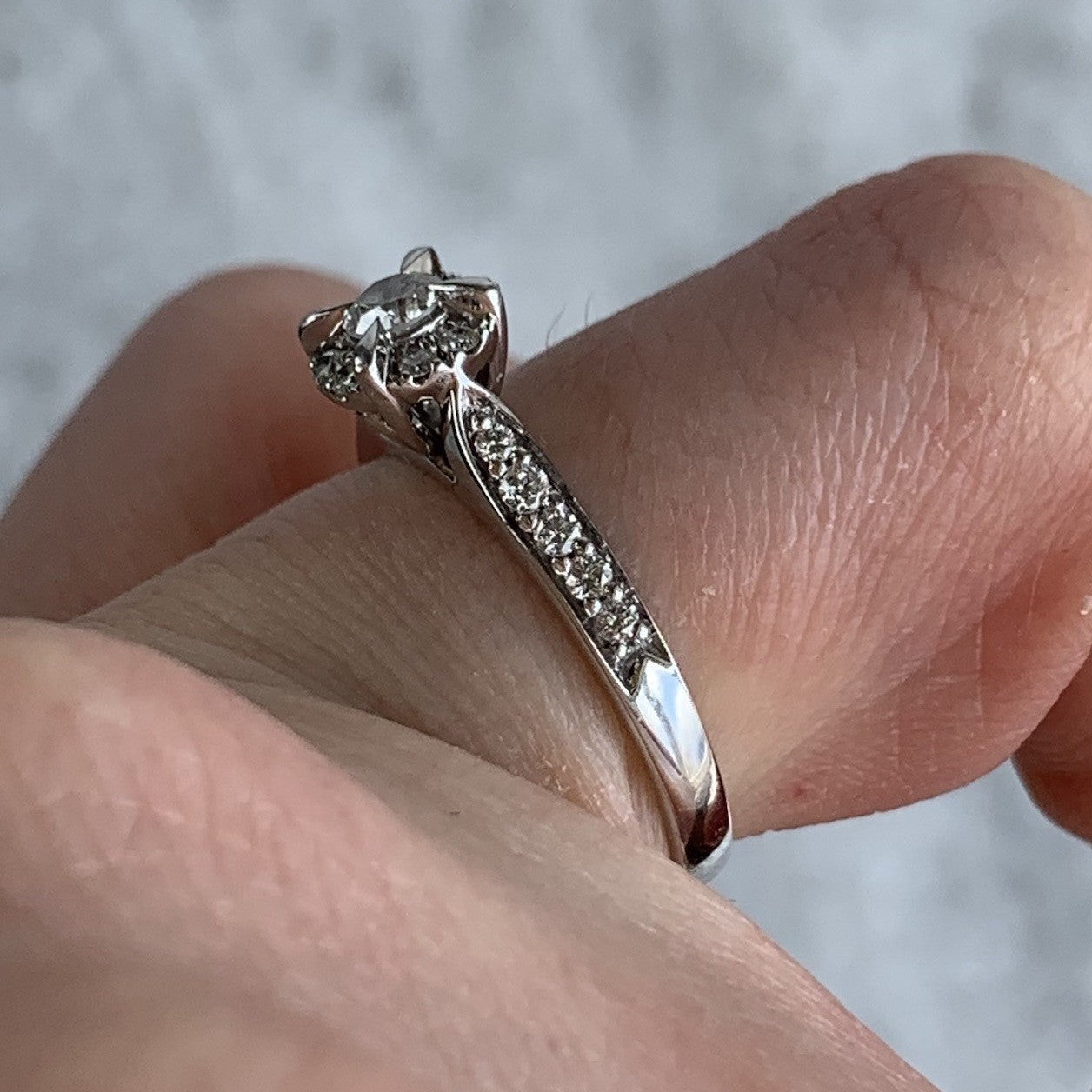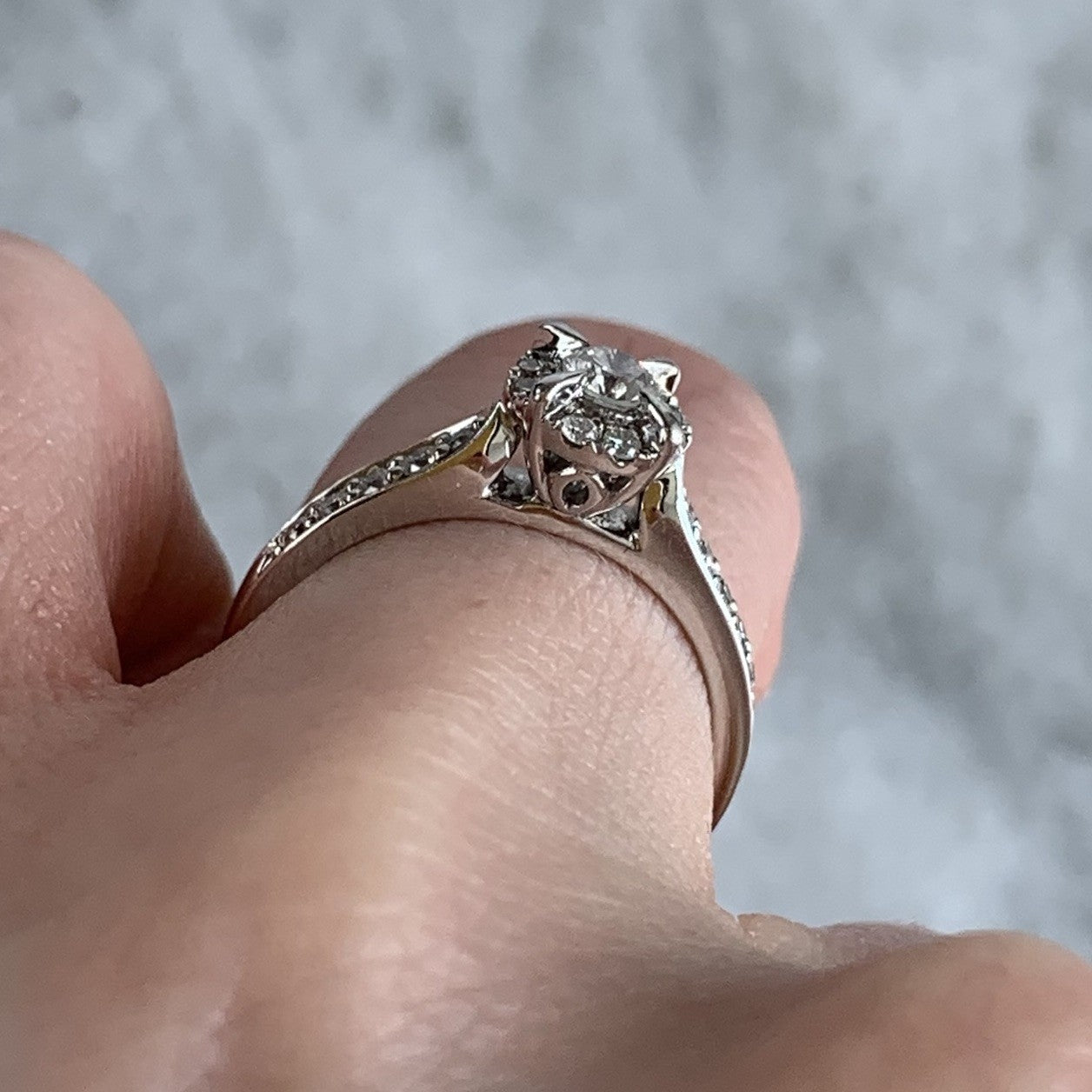 A lovely white gold ring showcasing a round diamond cluster, with additional diamonds on the shoulders to accent.