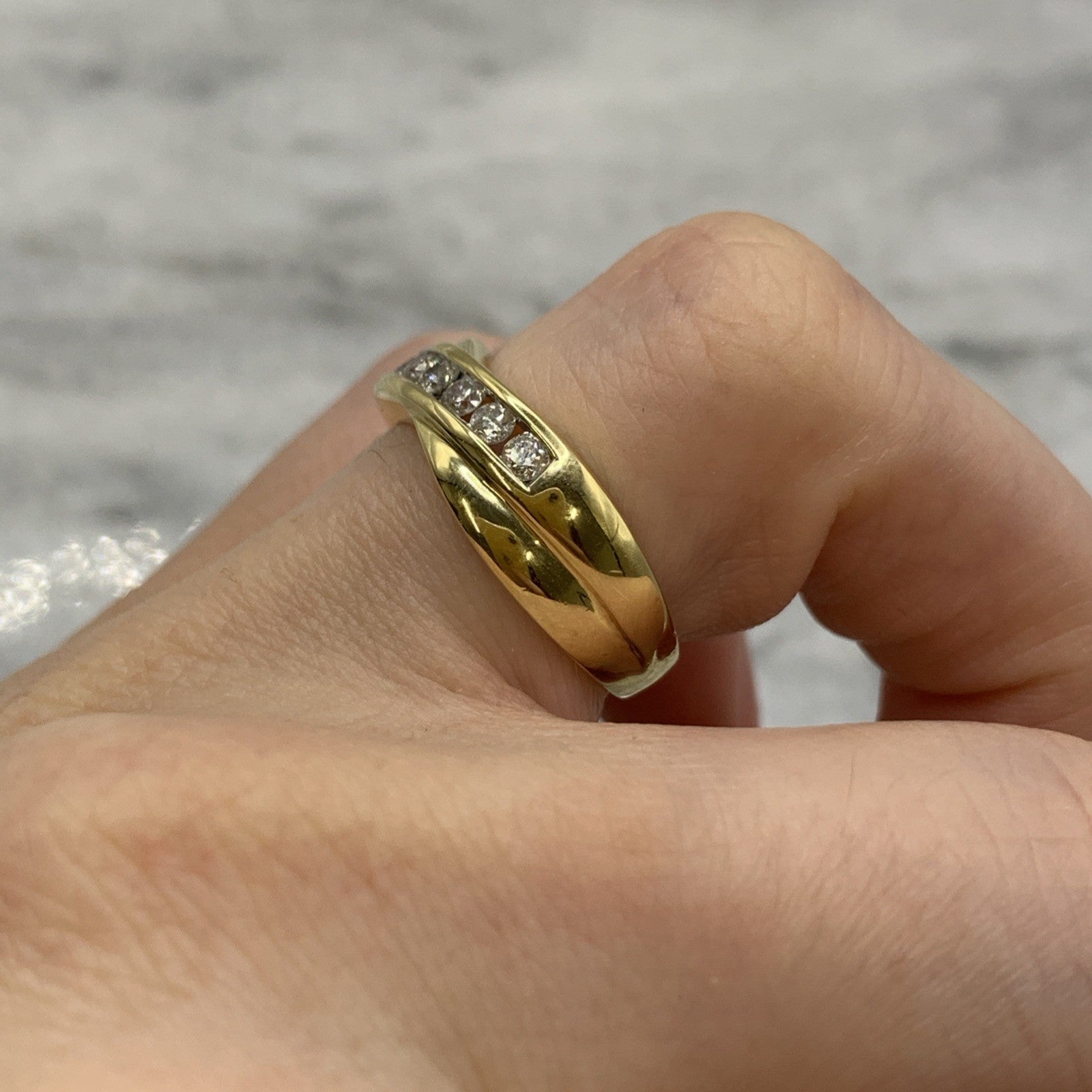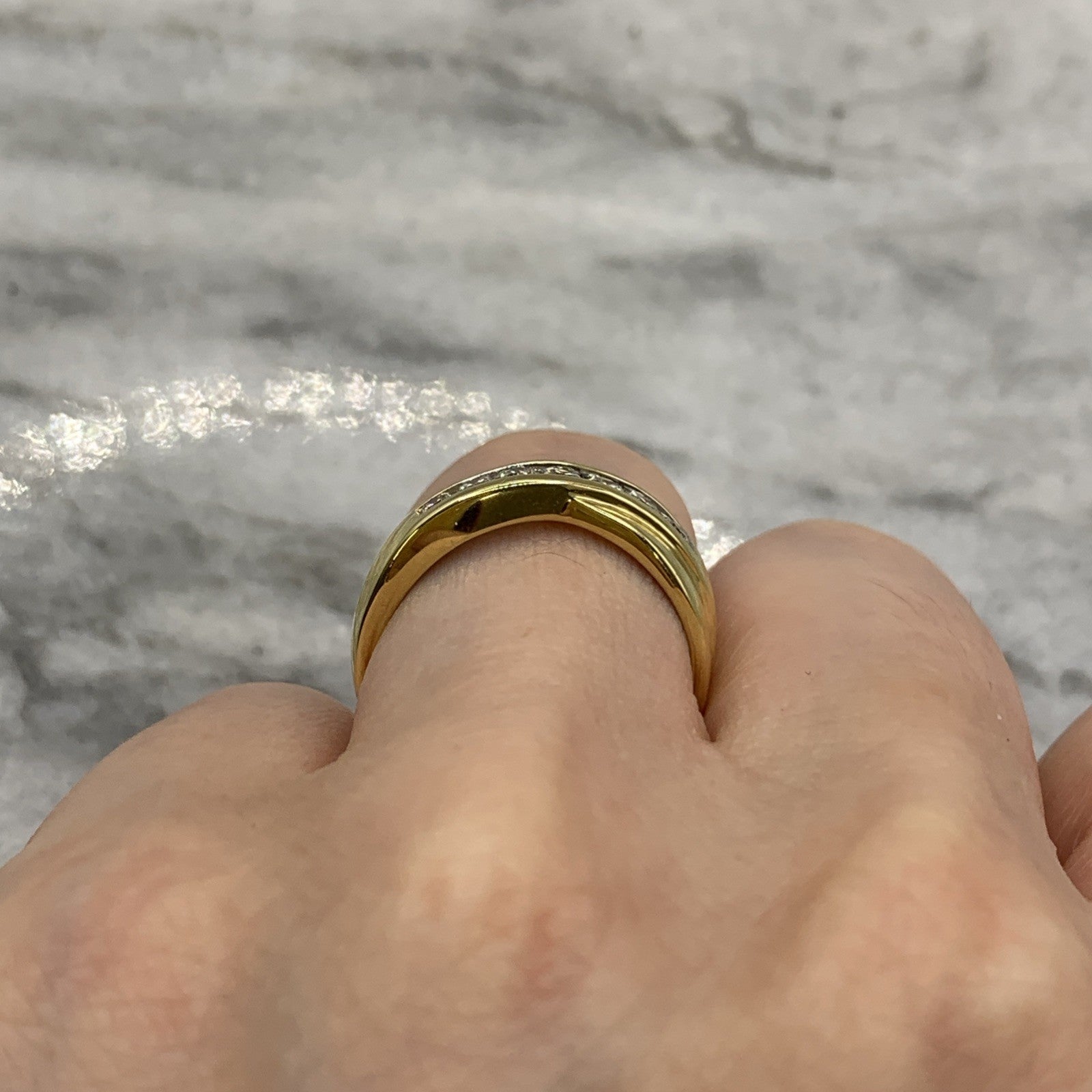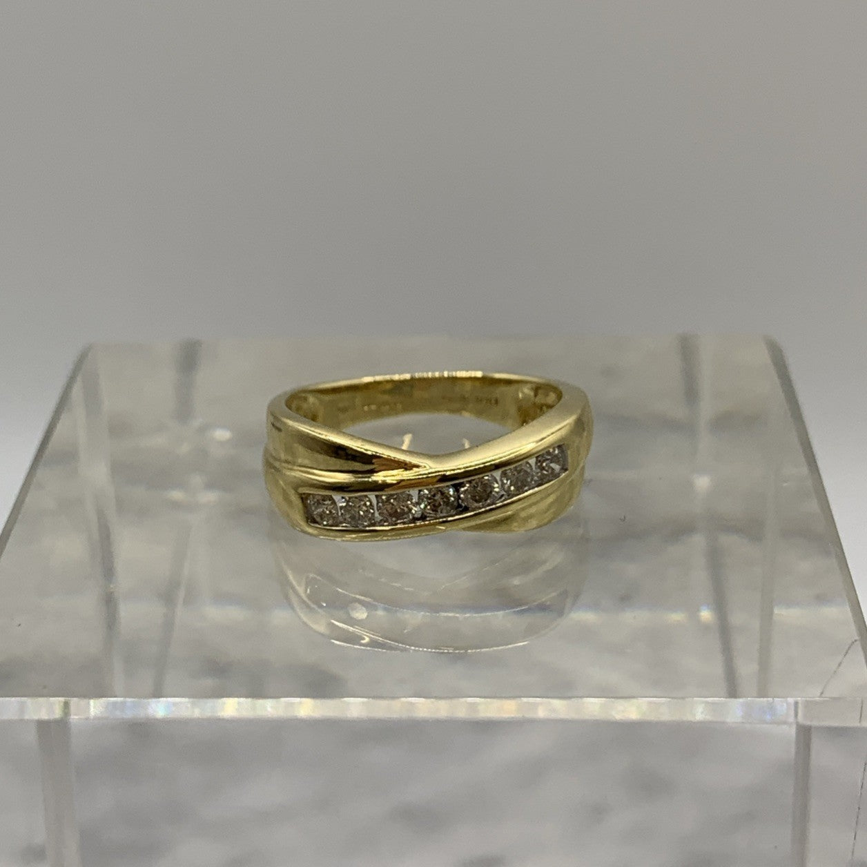 A stunning gold crossover ring featuring a channel of round cut diamonds amounting to .33ct.