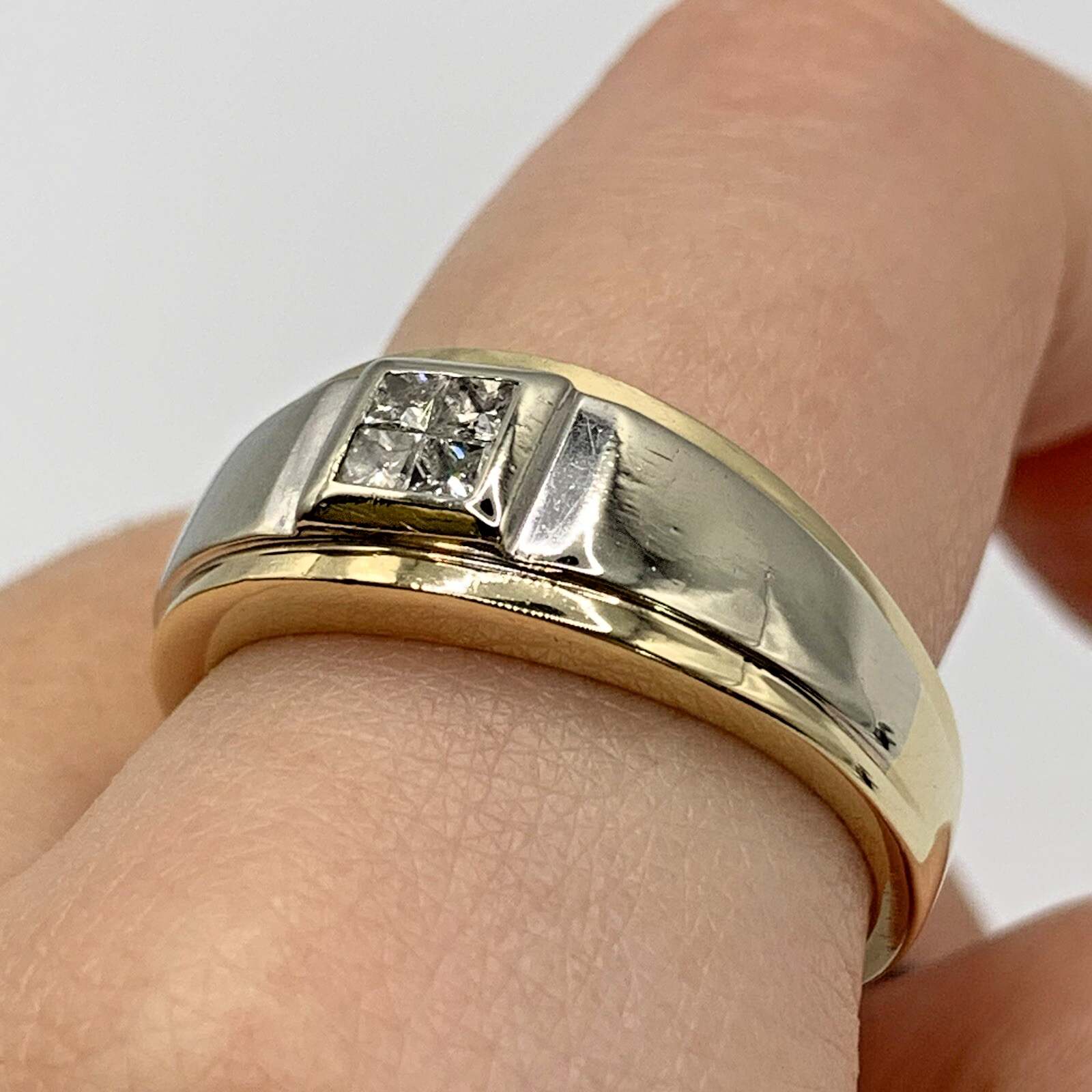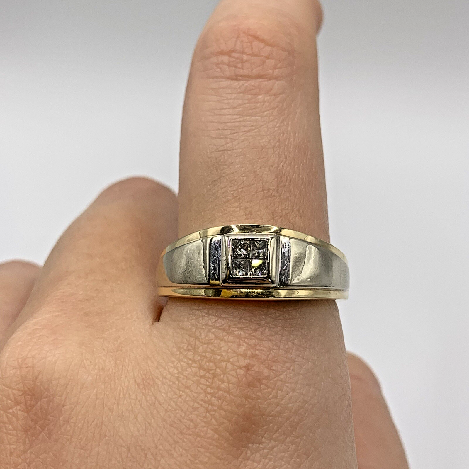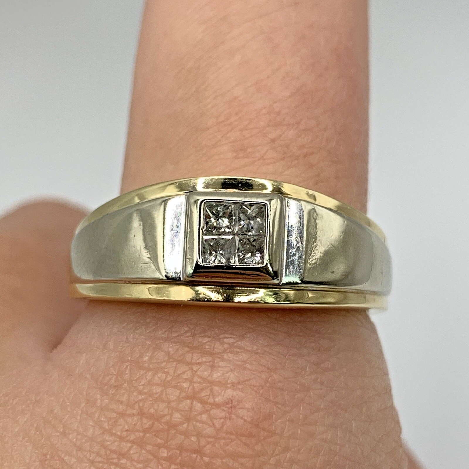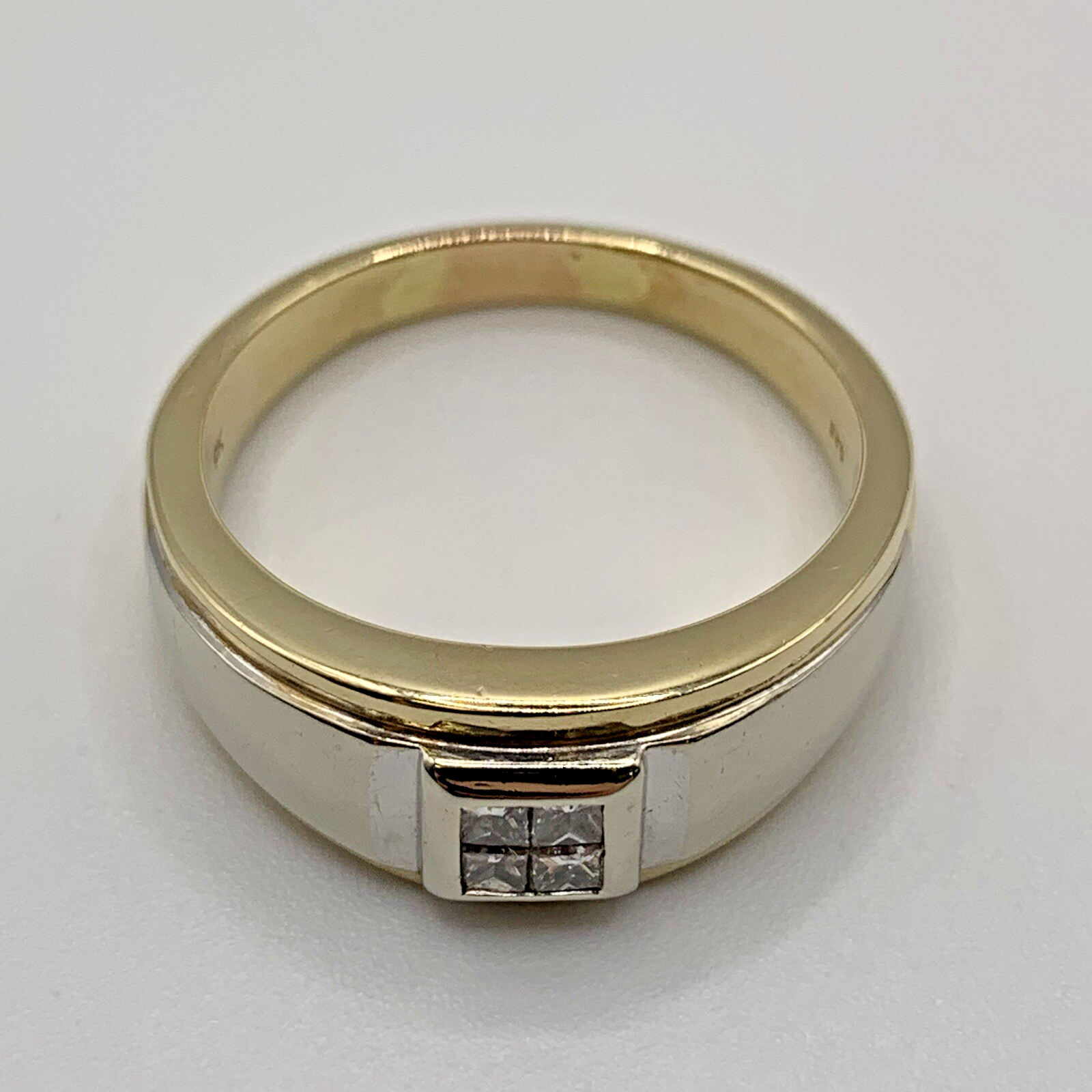 A classic band style ring with a cluster of four square cut natural diamonds set into a square flush setting, with a two tone white & yellow gold shoulder detail.