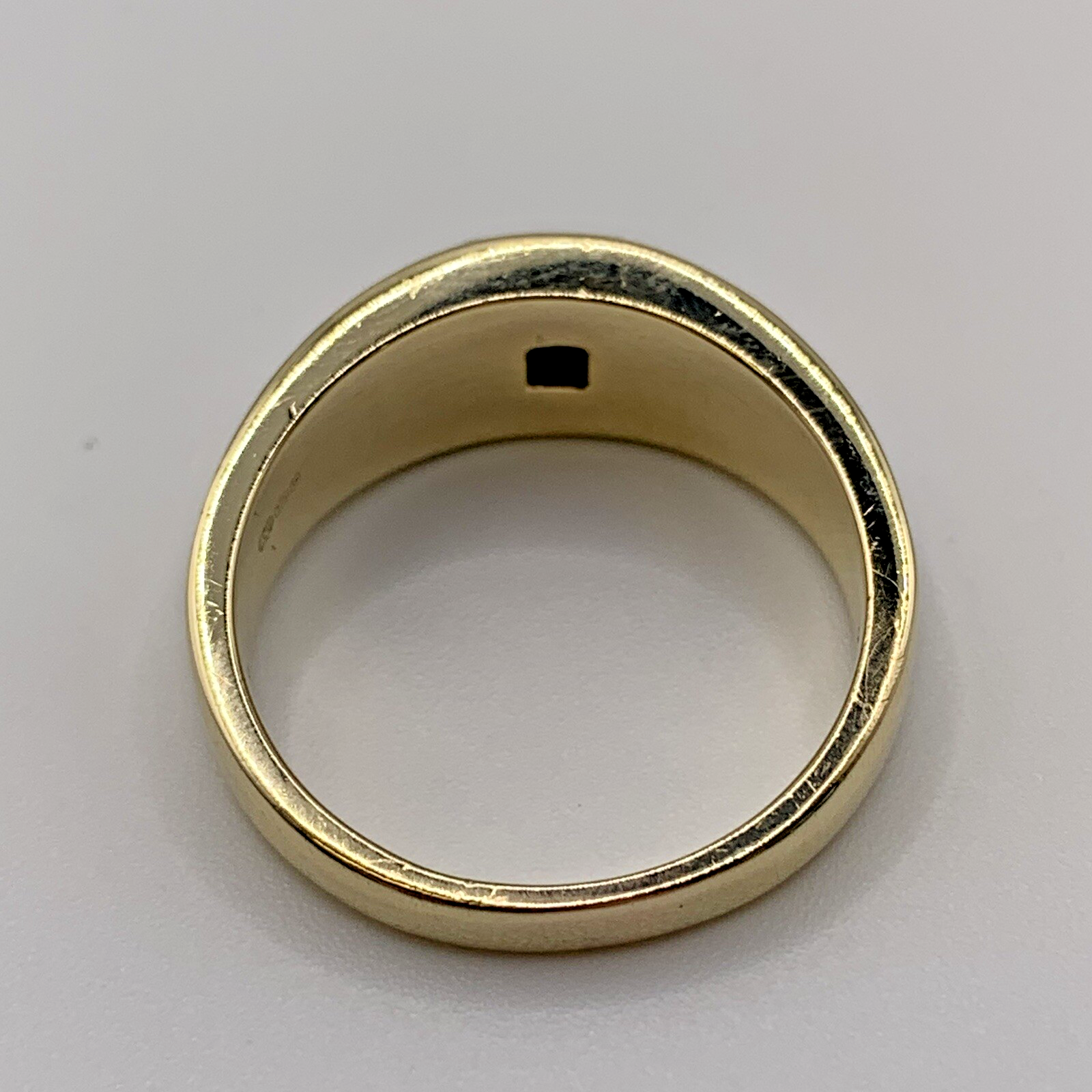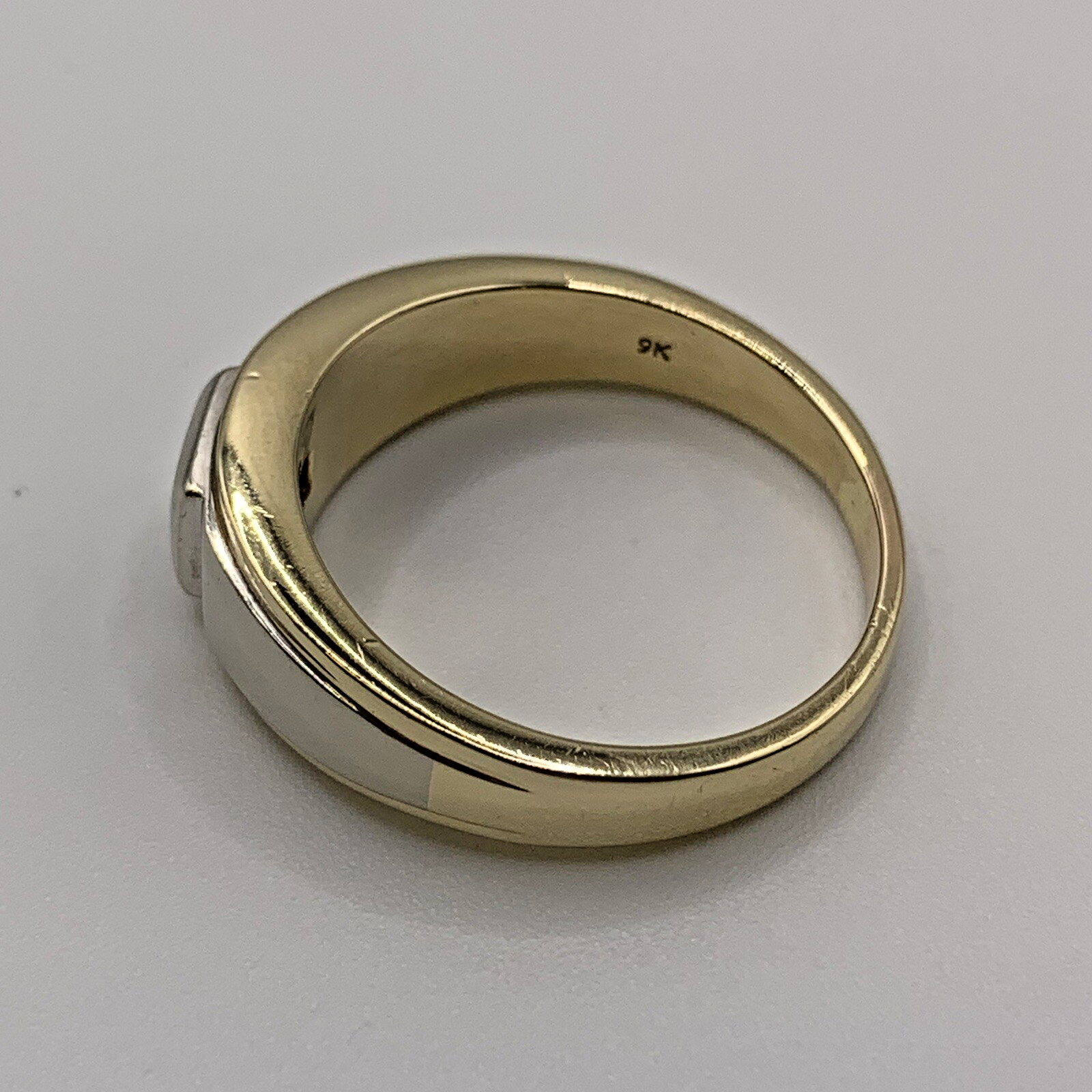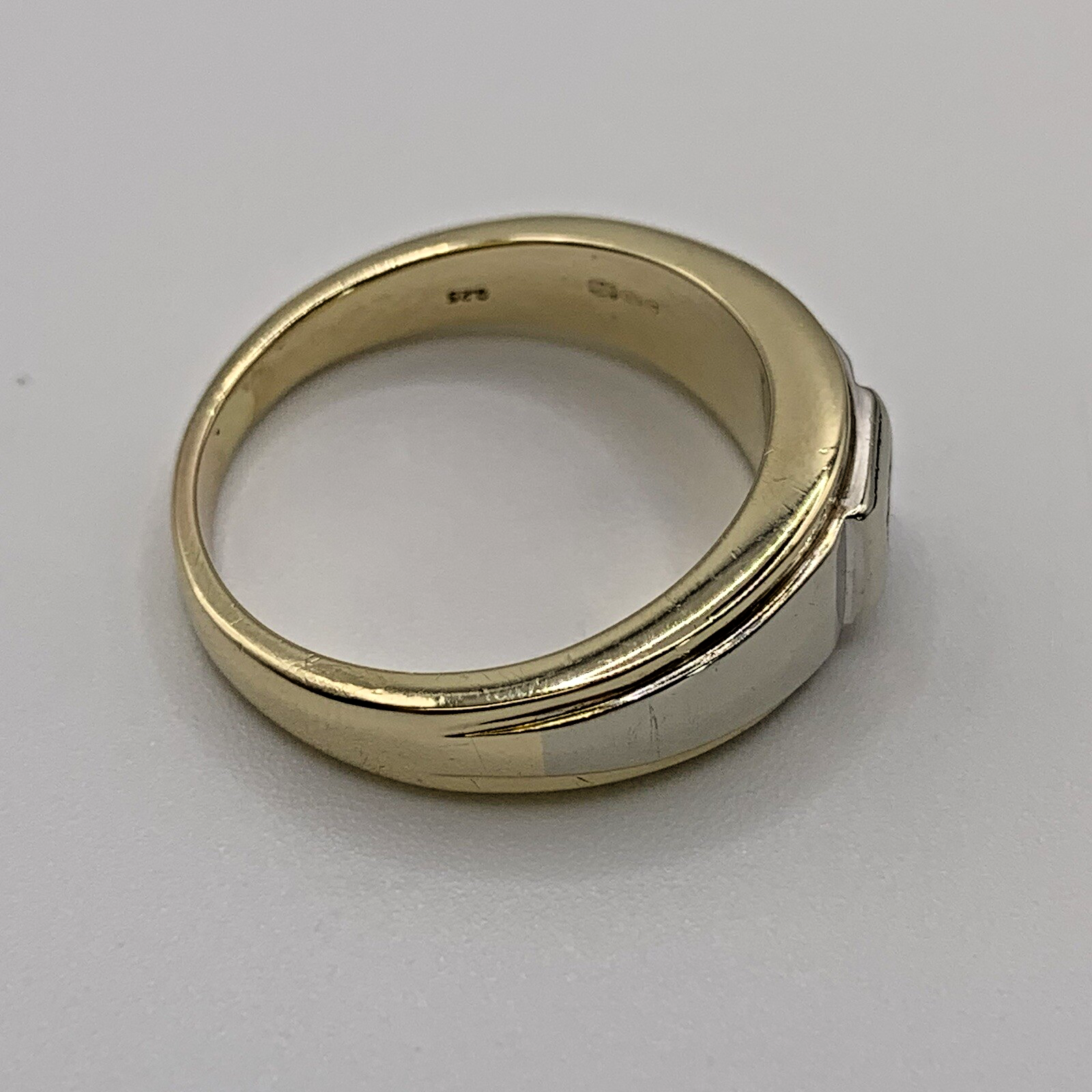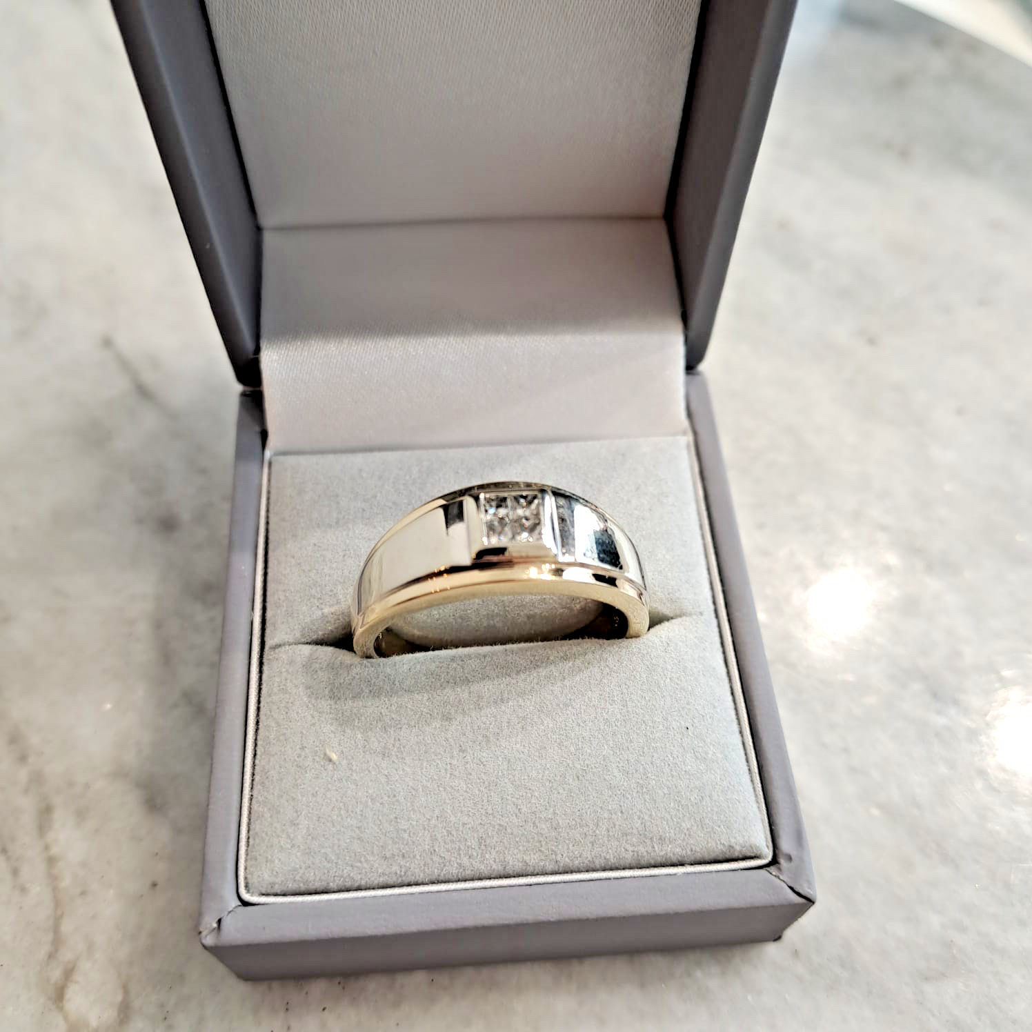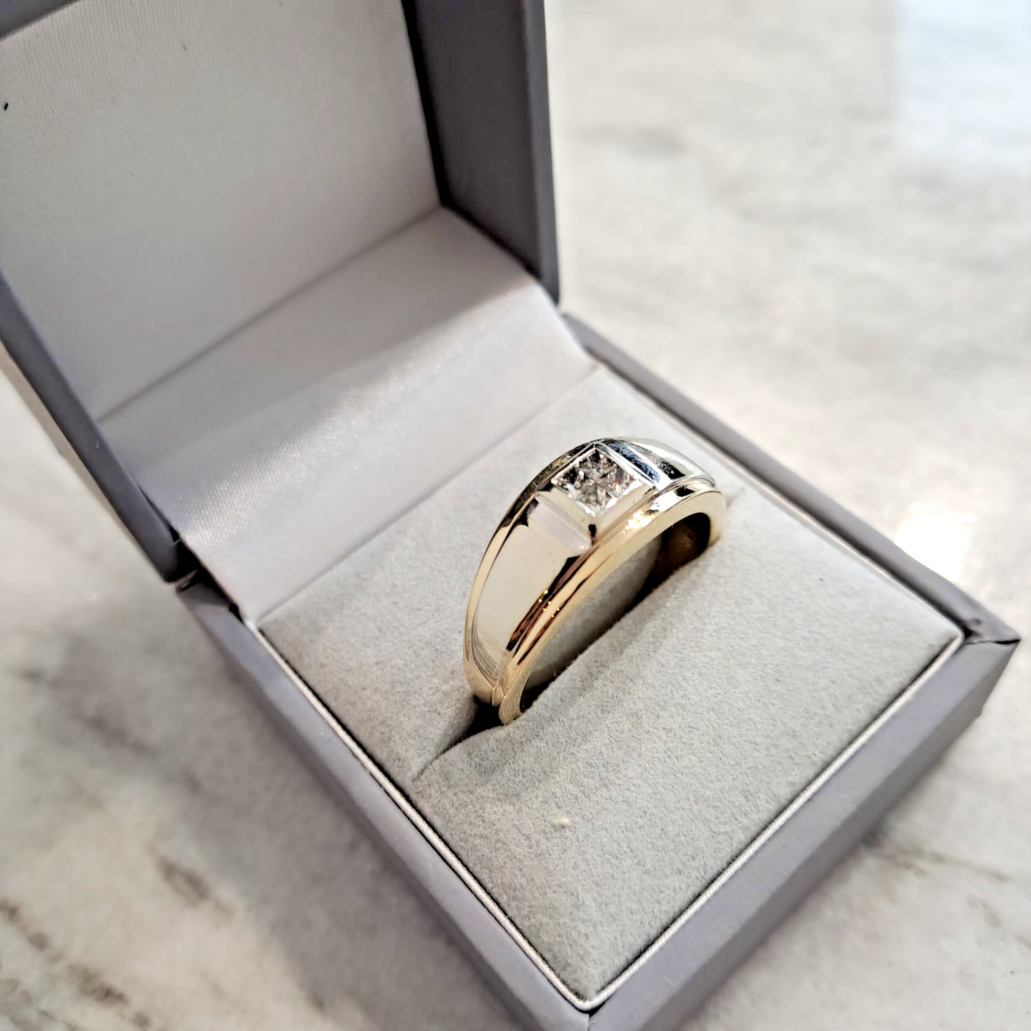 A classic band style ring with a cluster of four square cut natural diamonds set into a square flush setting, with a two tone white & yellow gold shoulder detail.