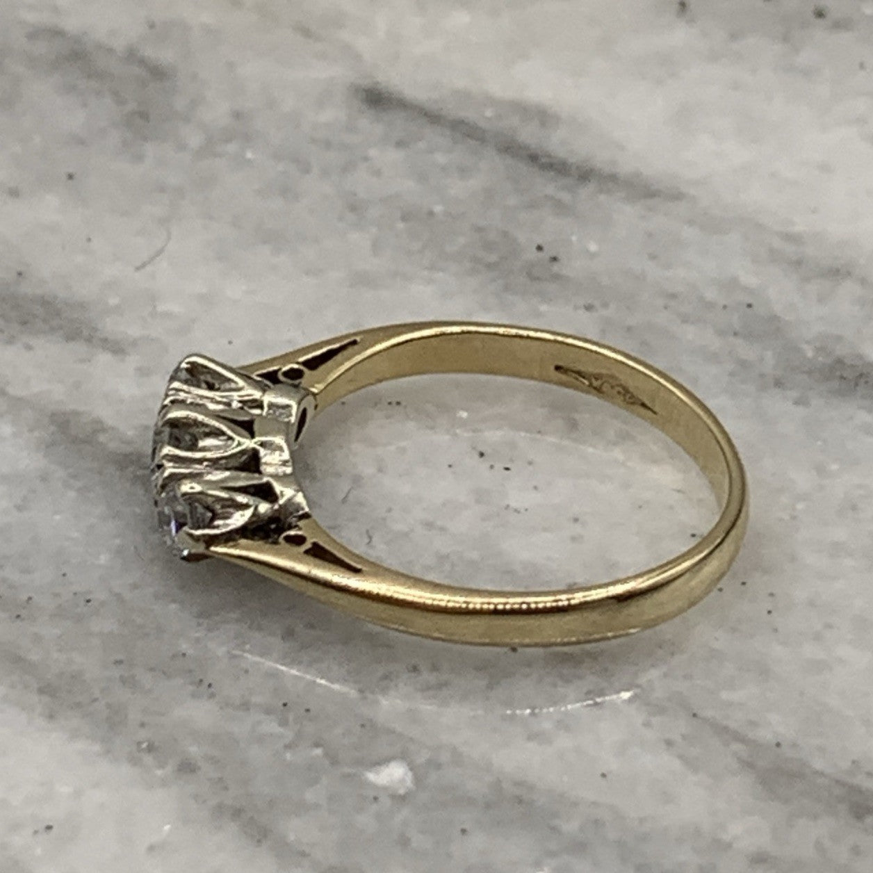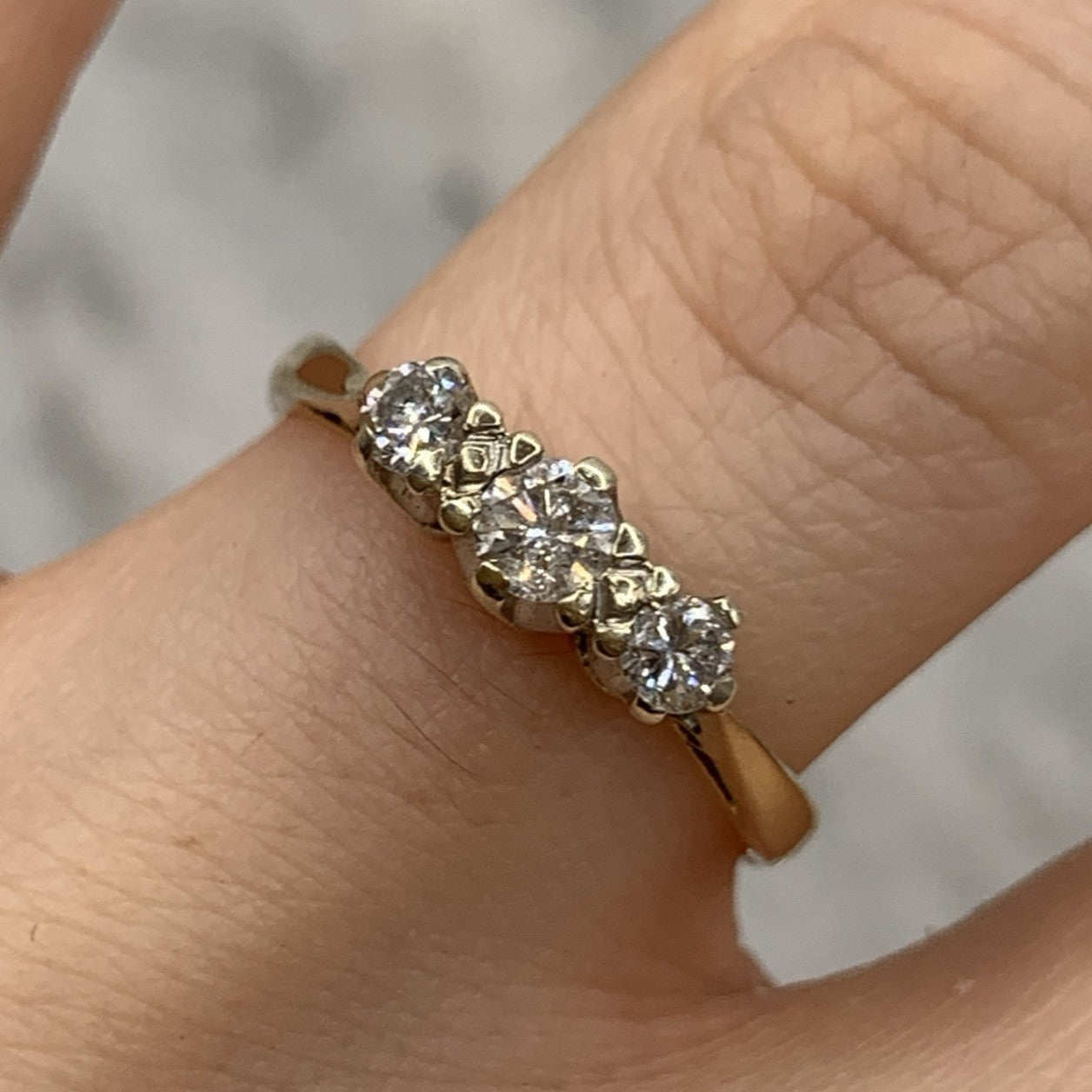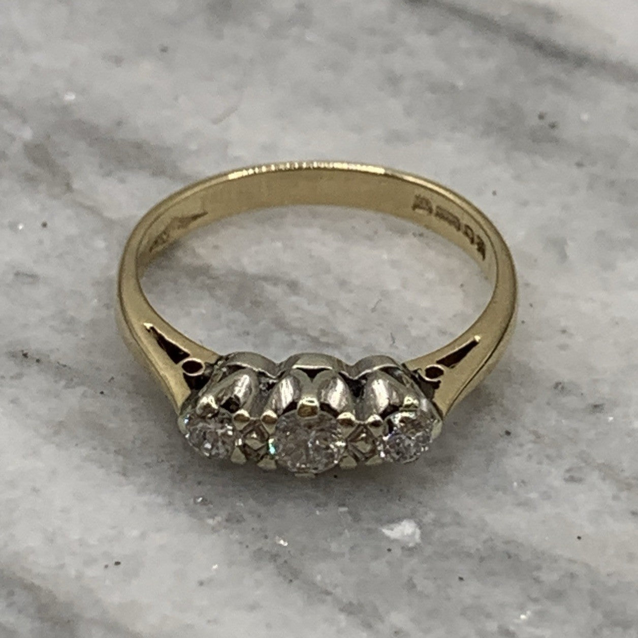 A lovely gold ring showcasing a trilogy of illusion set diamonds.