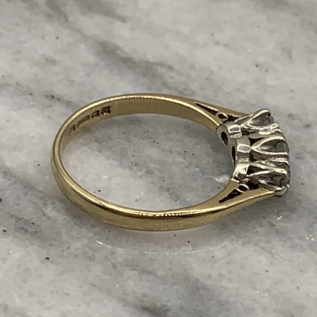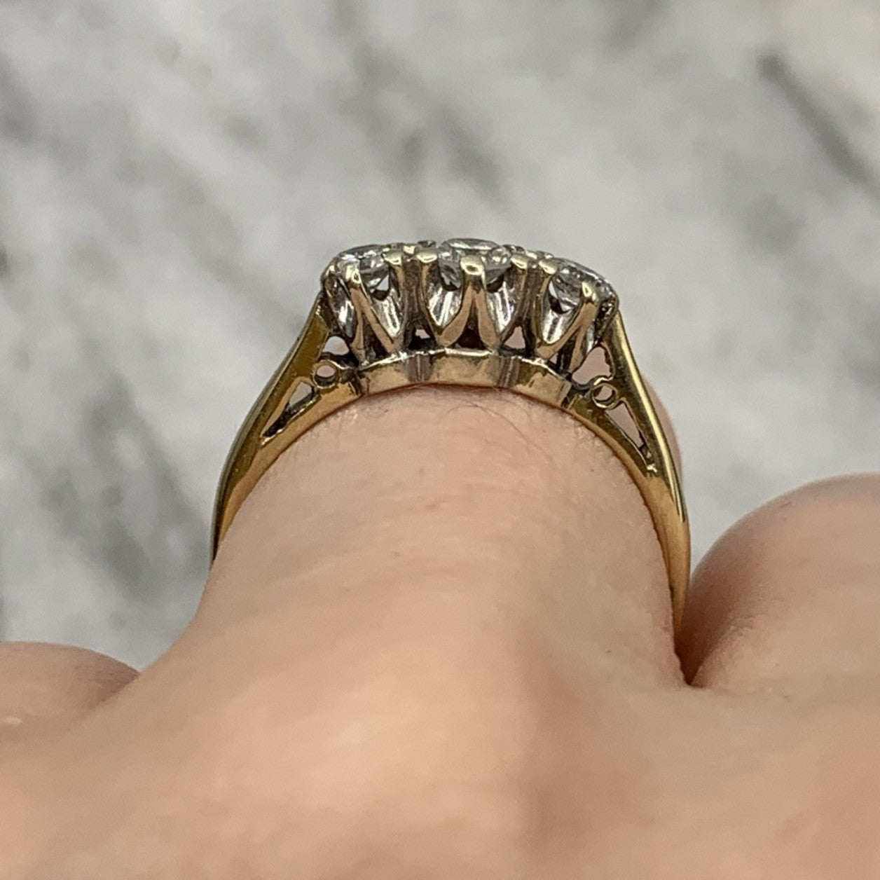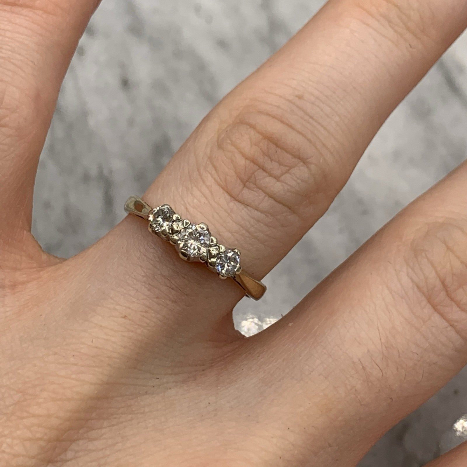 A lovely gold ring showcasing a trilogy of illusion set diamonds.
