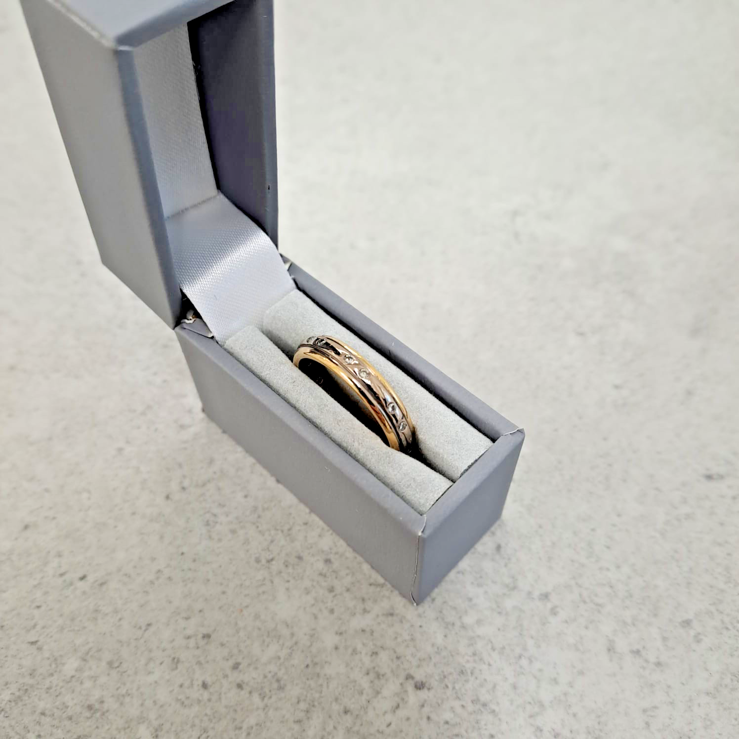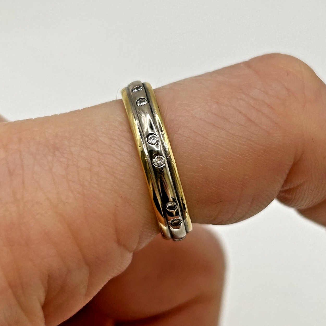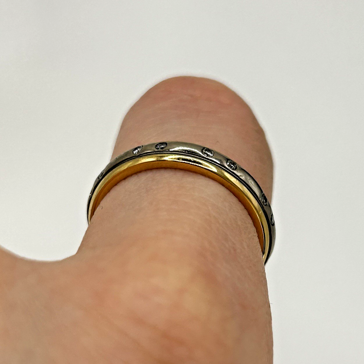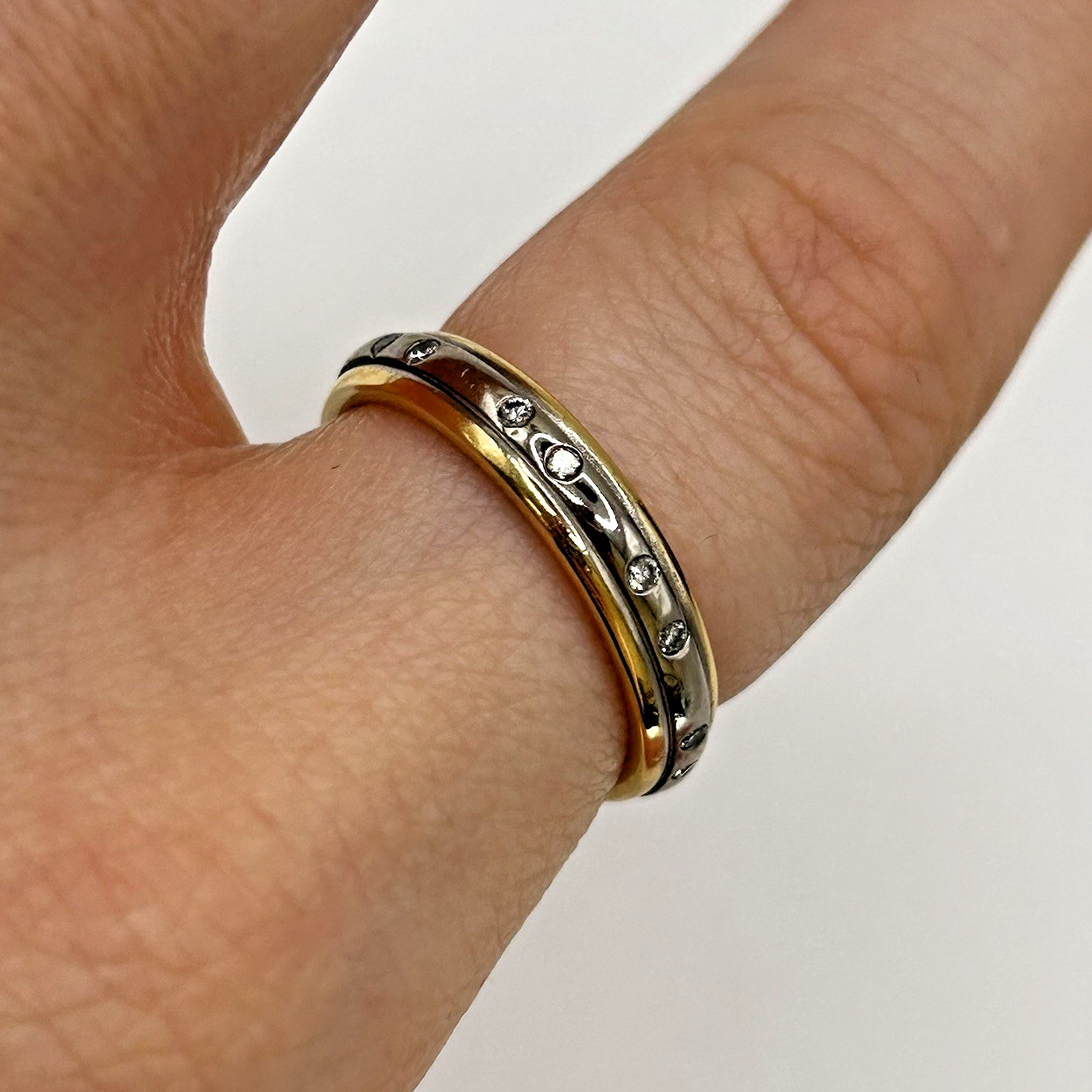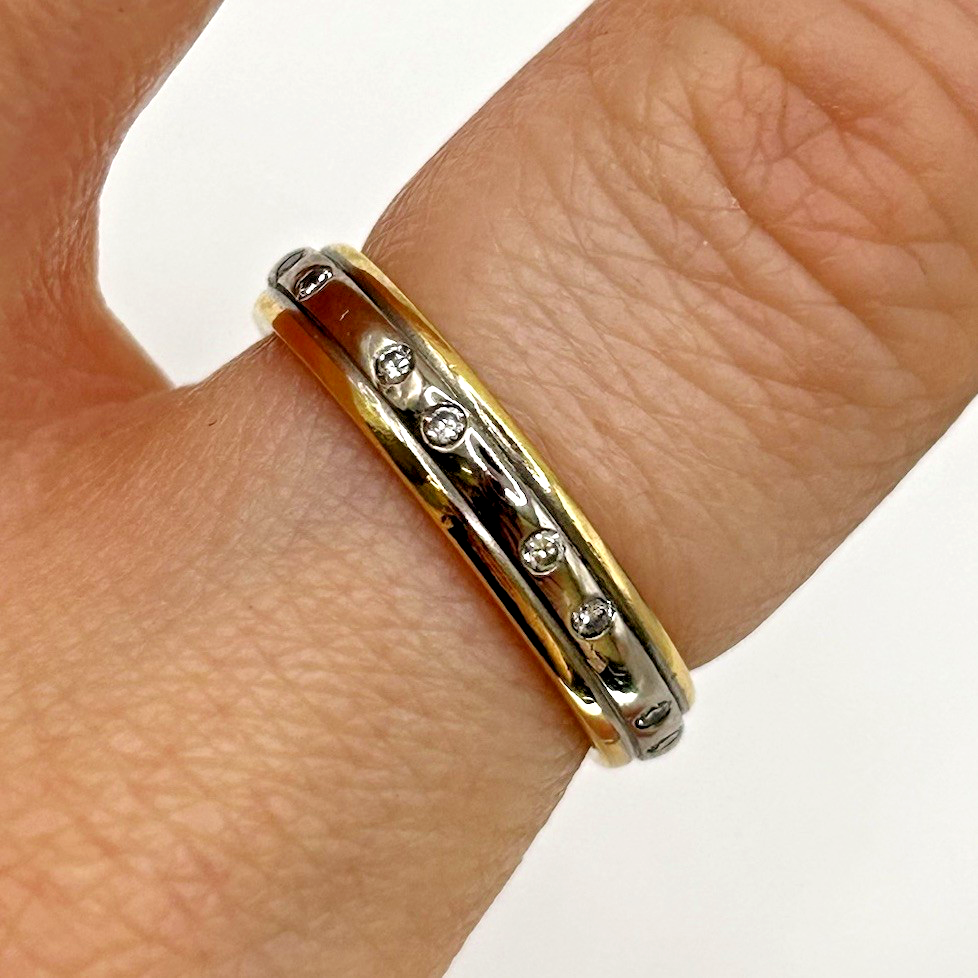 A beautiful two tone gold ring adorned with petite flush set diamonds.