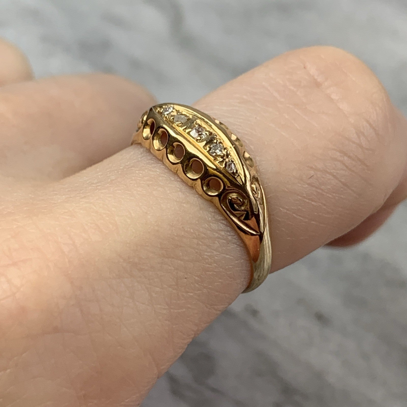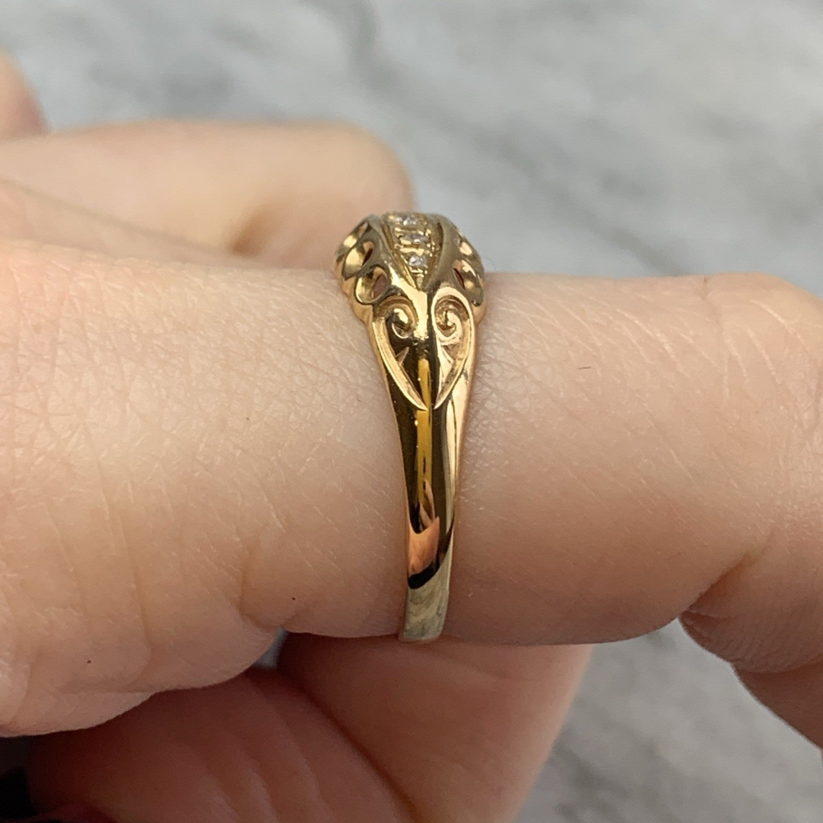 A lovely gold ring featuring five diamonds pave set into an intricately carved bed and shoulders.