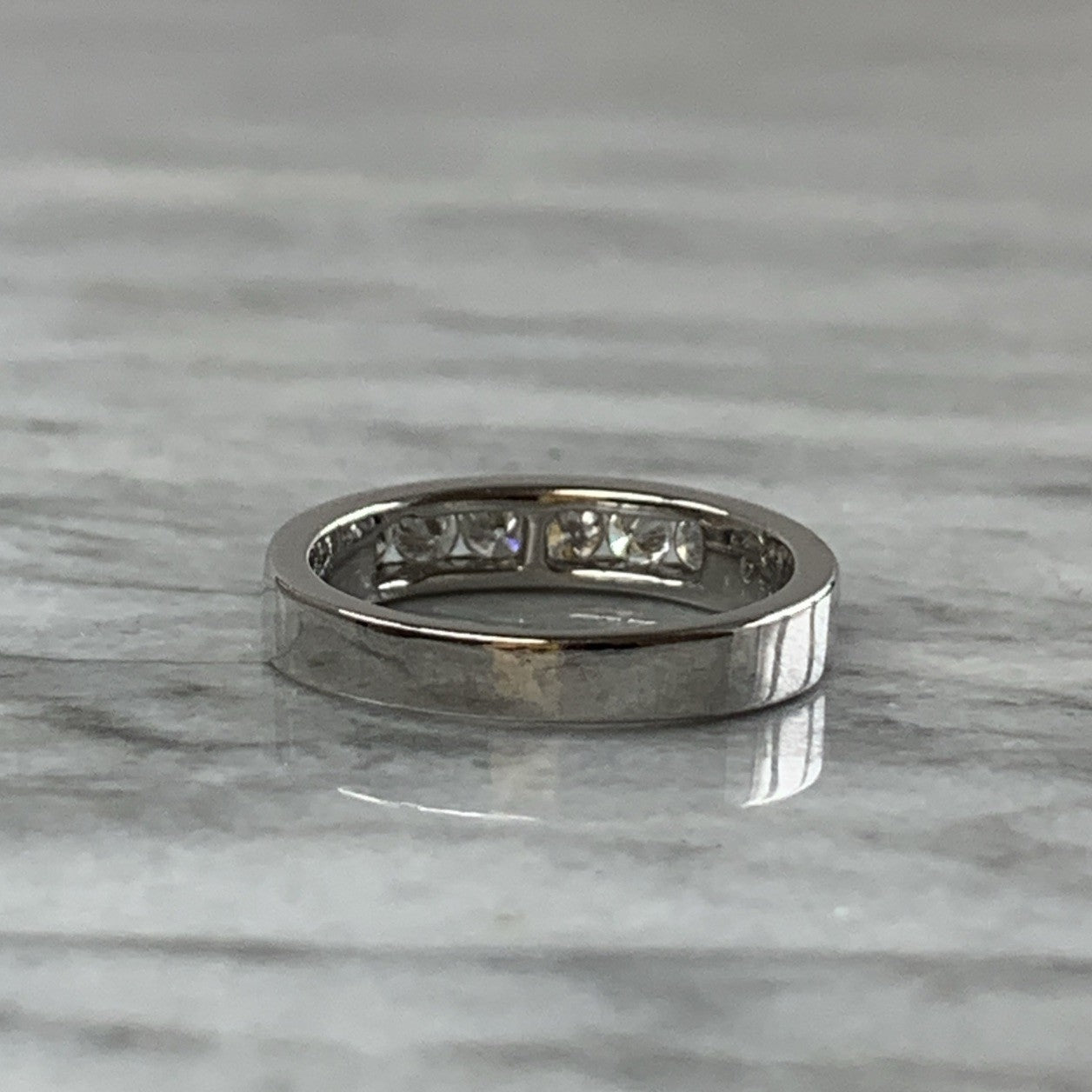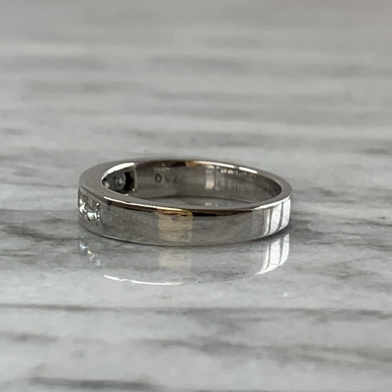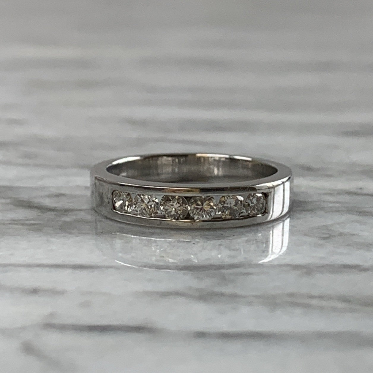 A stunning white gold band ring featuring a channel of five round cut diamonds.