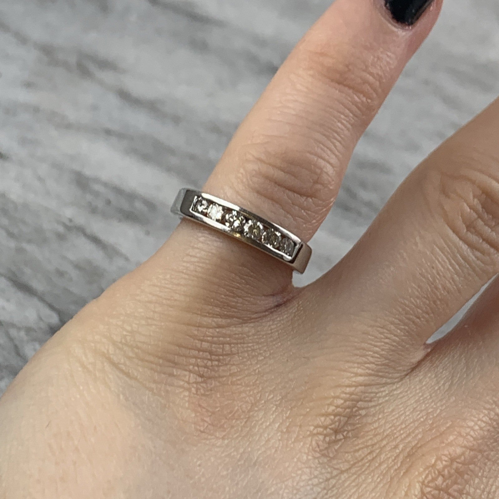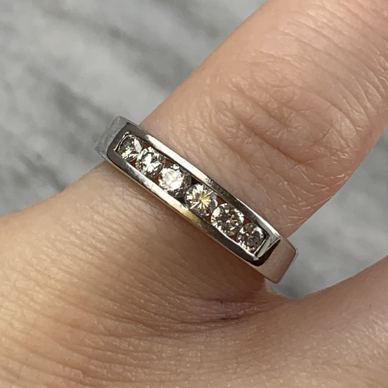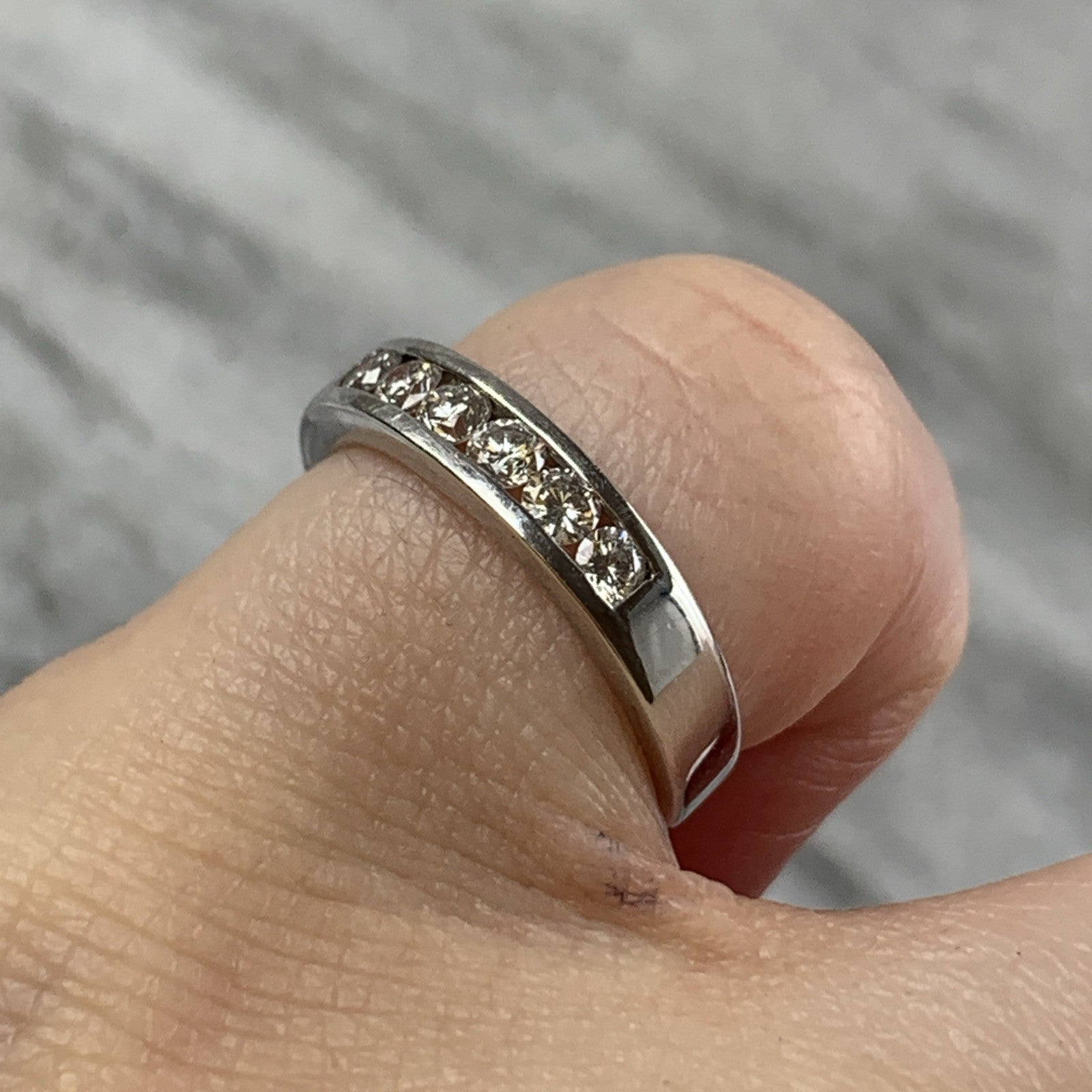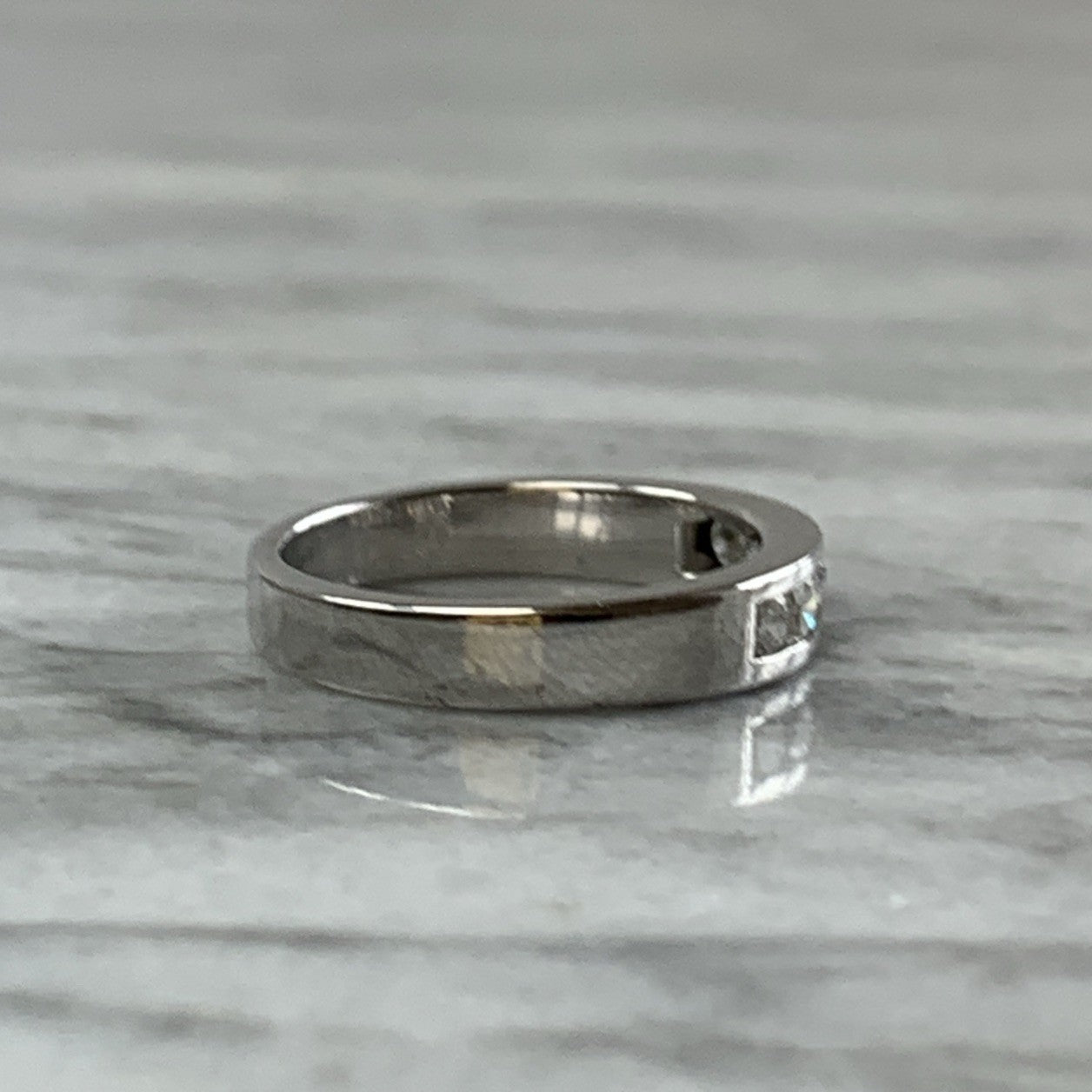 A stunning white gold band ring featuring a channel of five round cut diamonds.