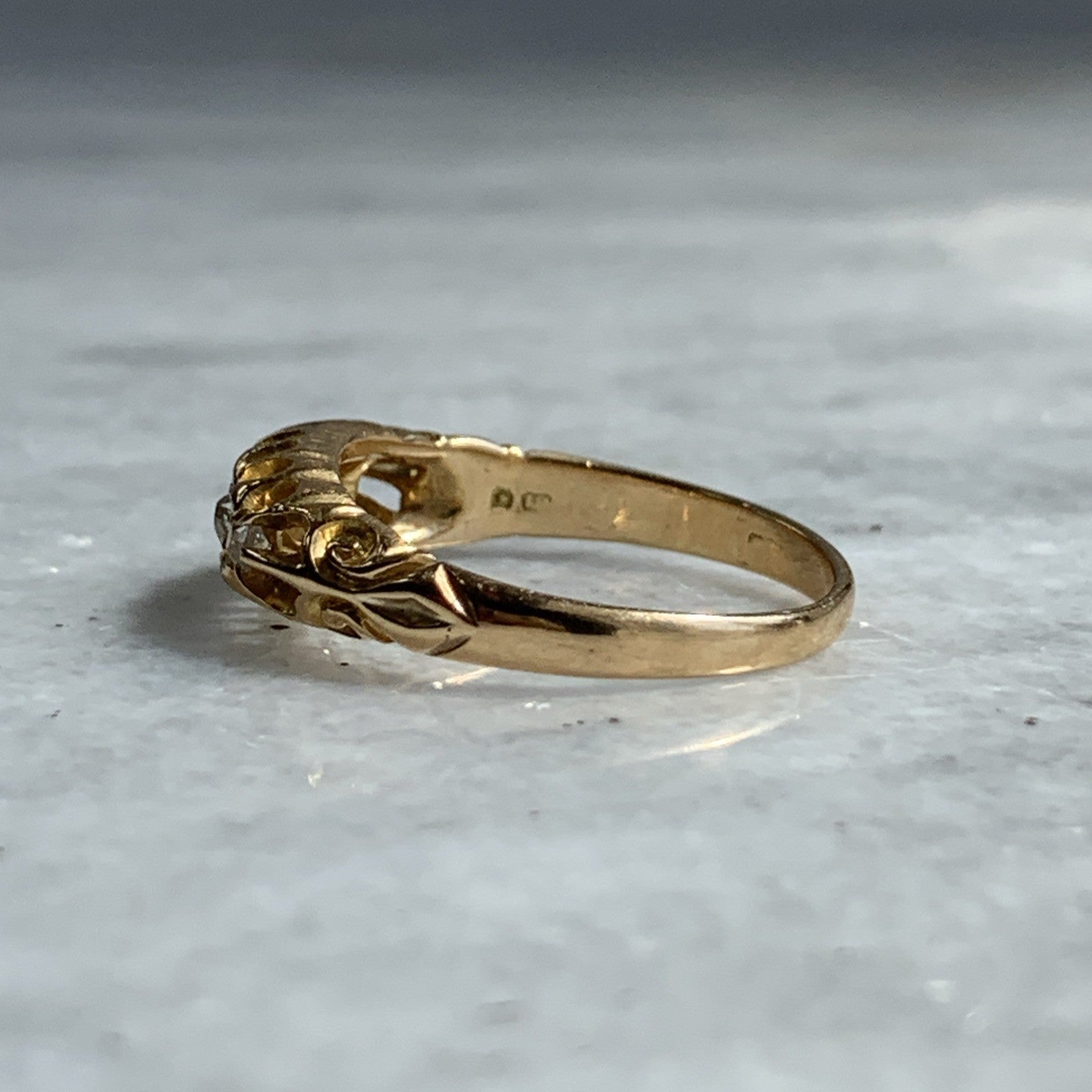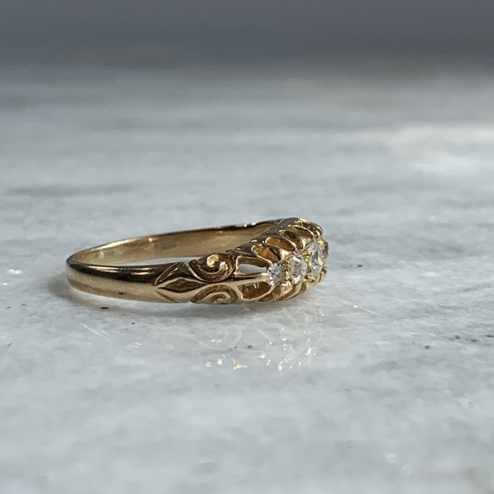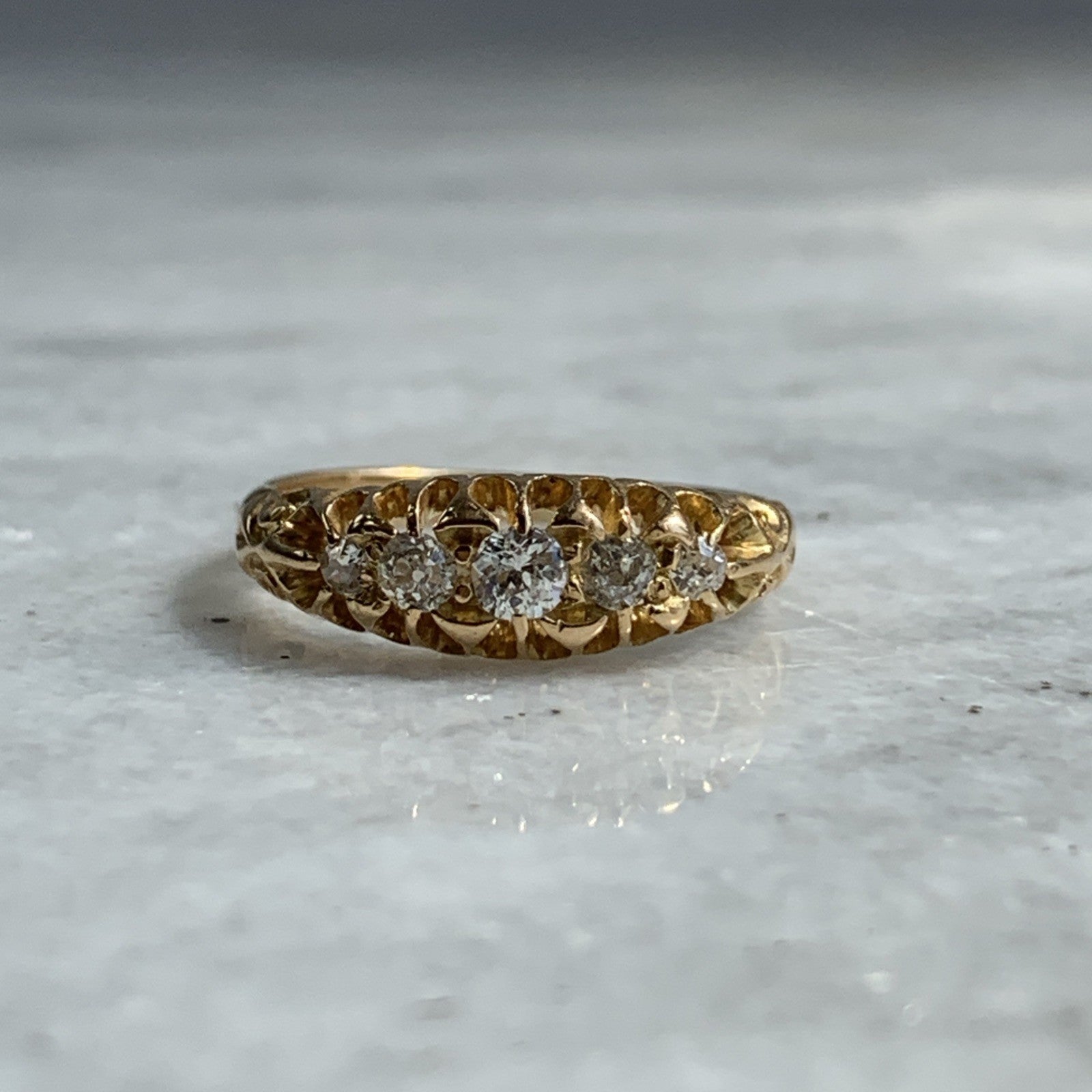 A stunning gold ring showcasing a quintet of round cut diamonds.