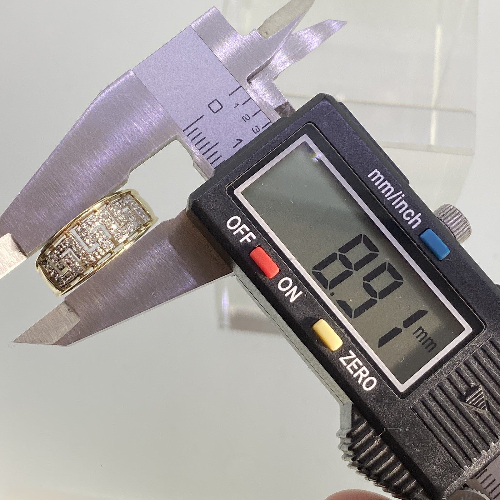 A stunning ornate gold band ring crafted in the Greek key cut out style, adorned with a collection of petite diamonds throughout.