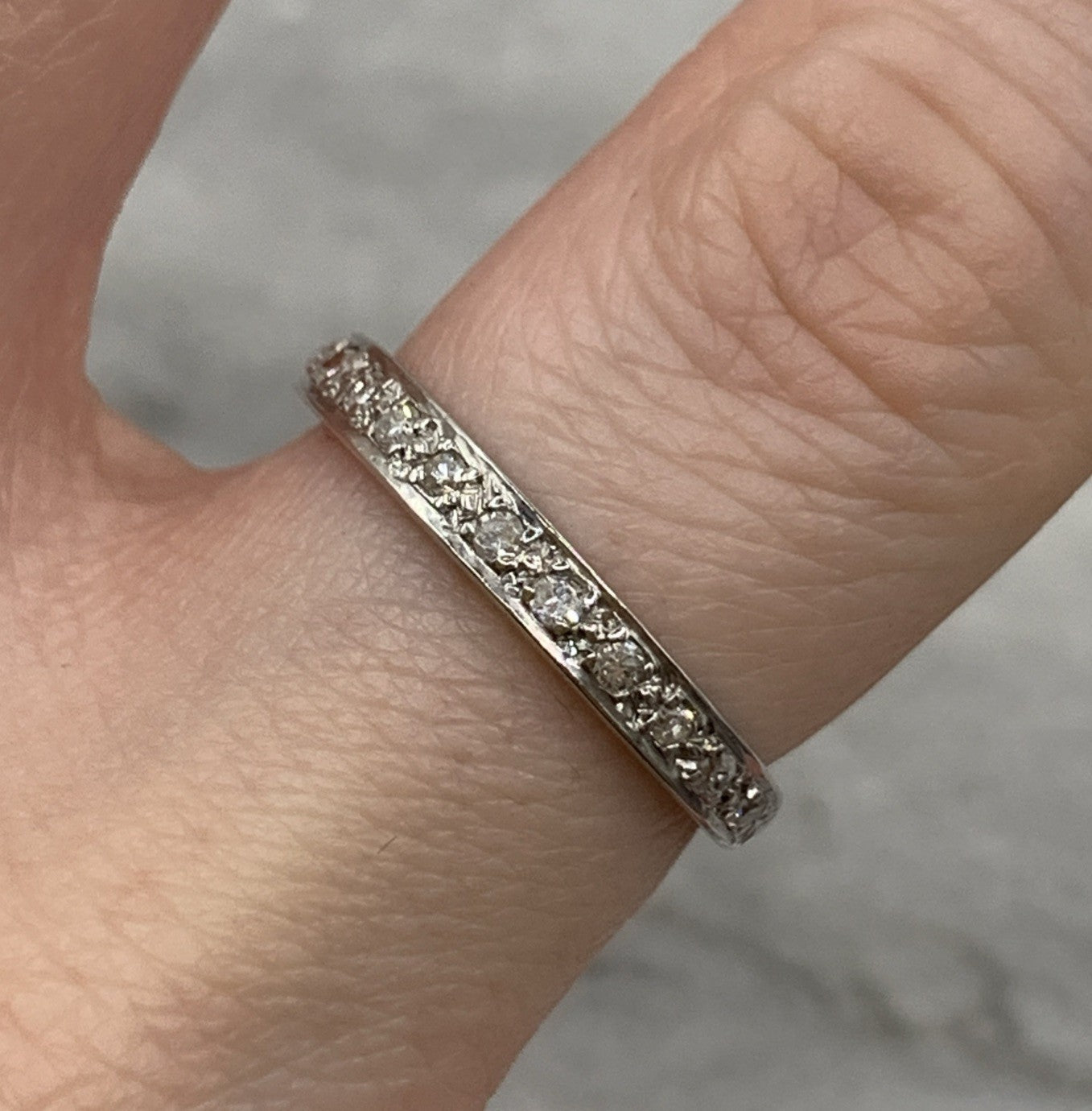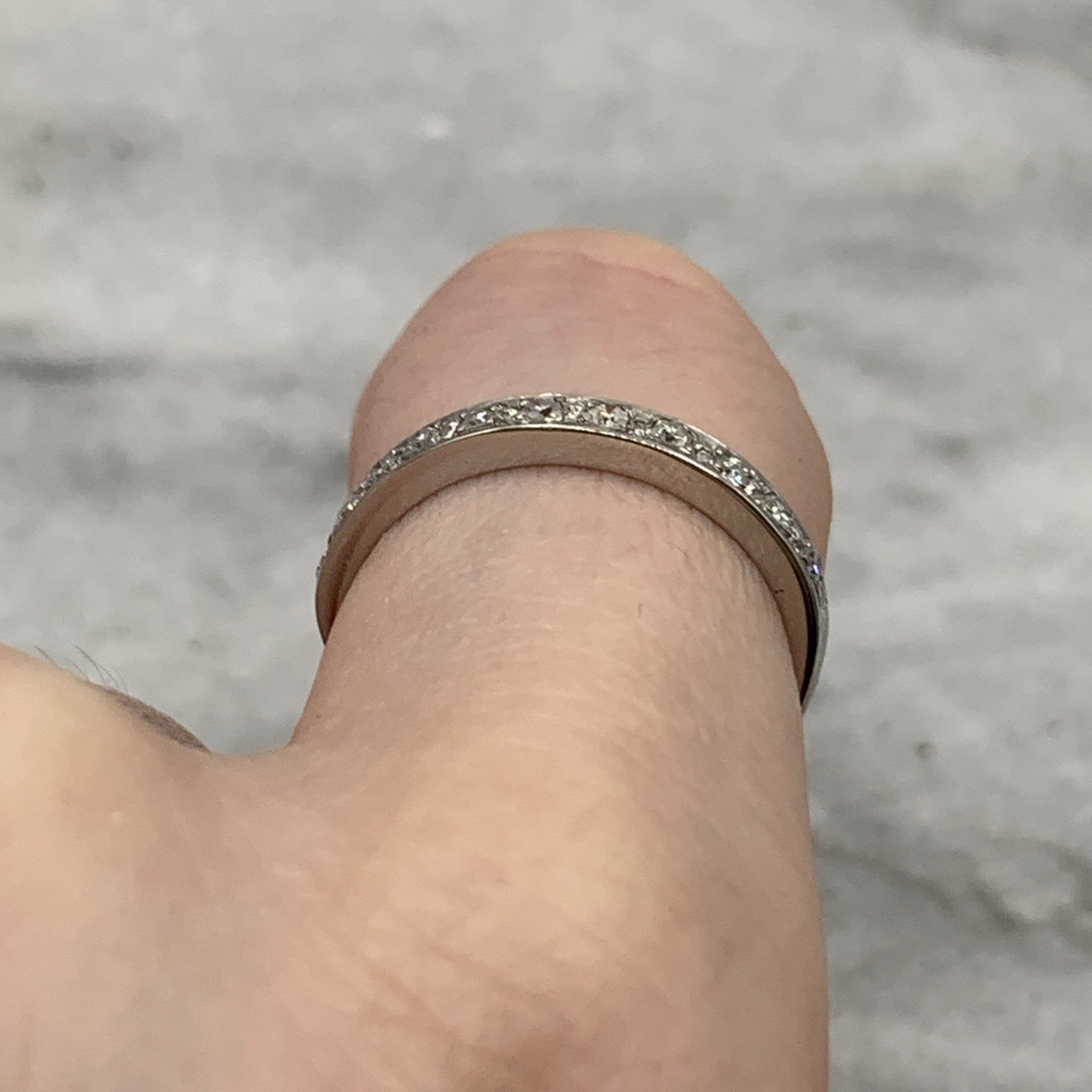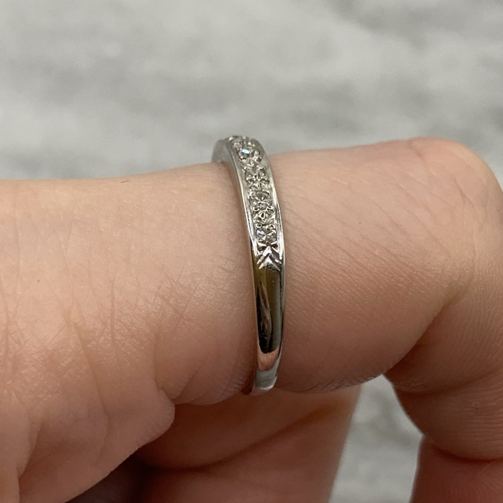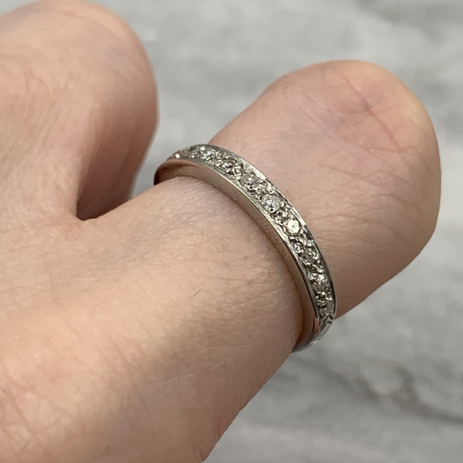 A charming white gold band ring featuring a row of pave set diamonds in the half eternity style.