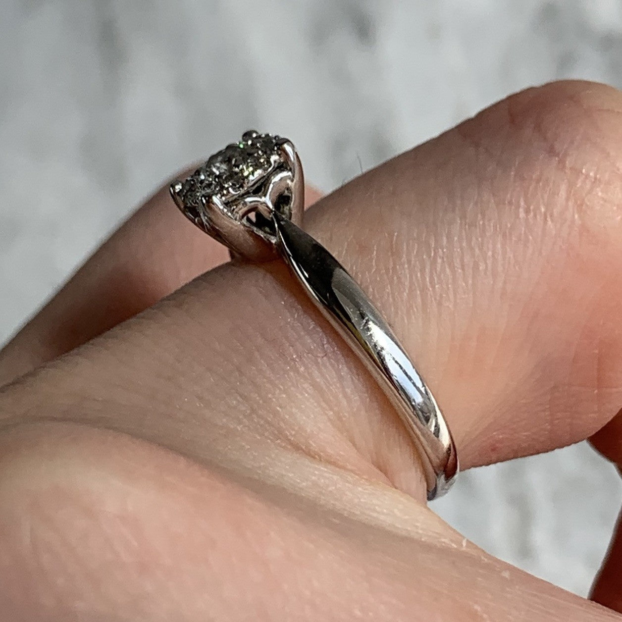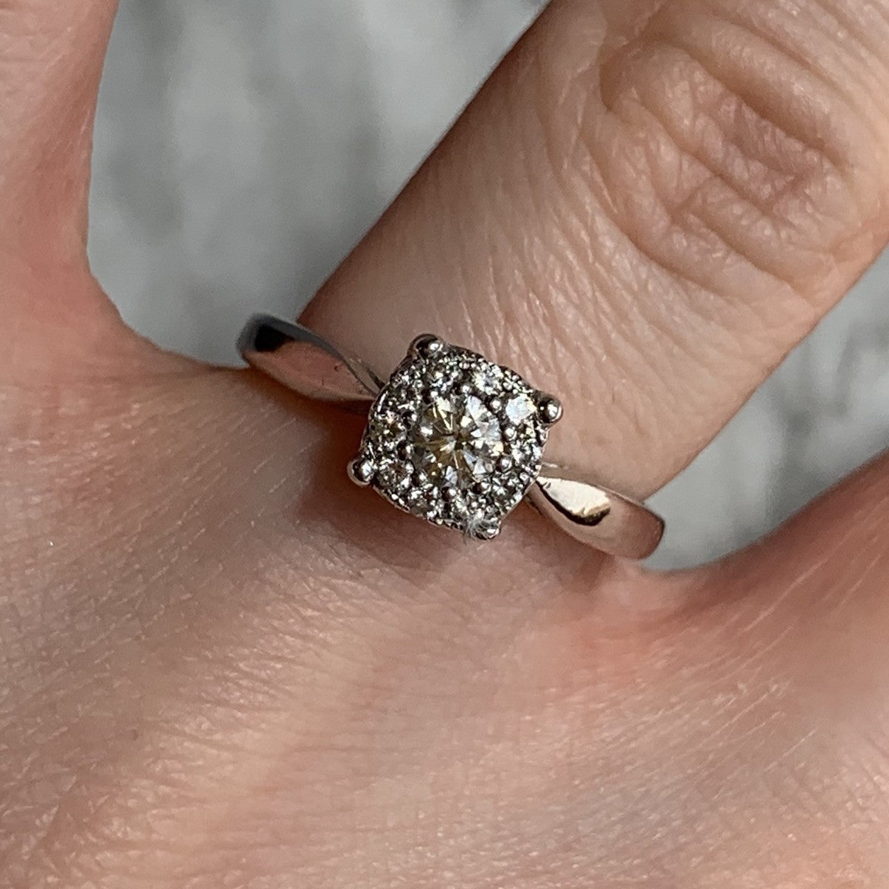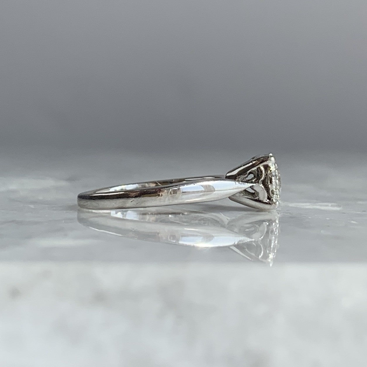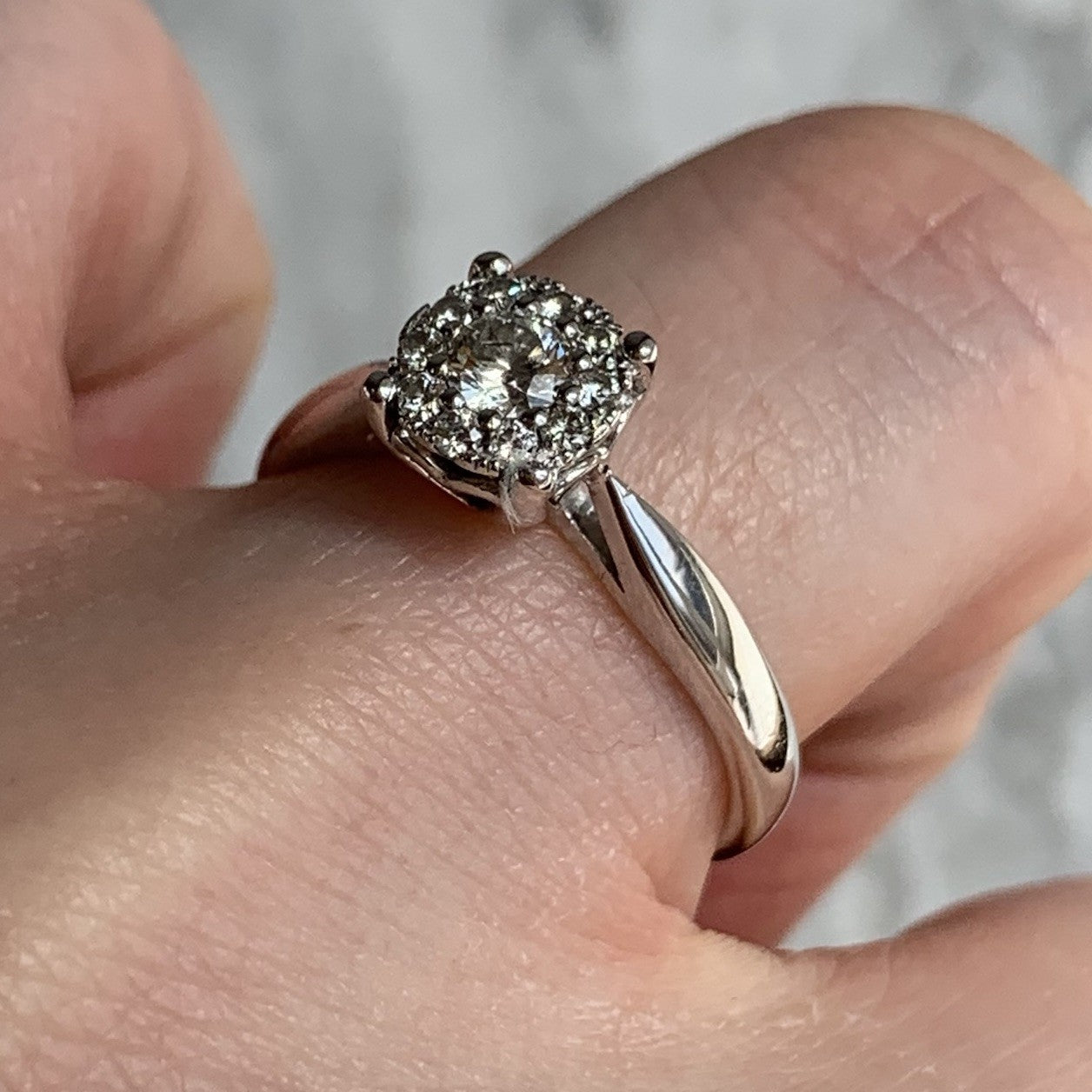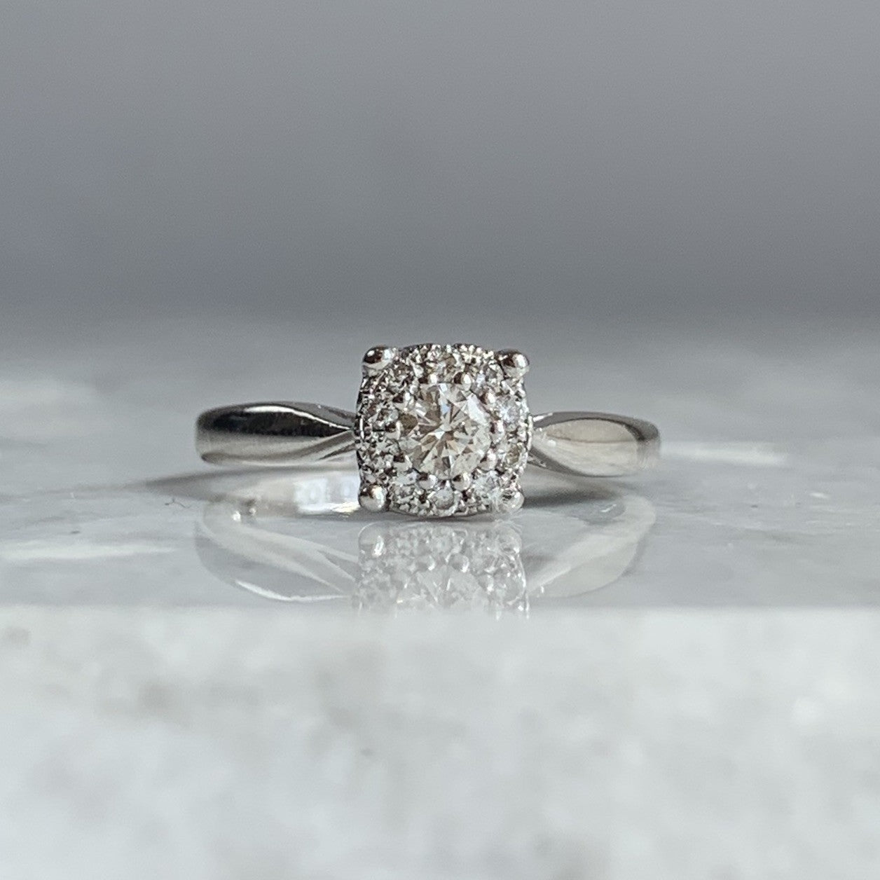 A stunning white gold ring showcasing an illusion set cluster of diamonds.