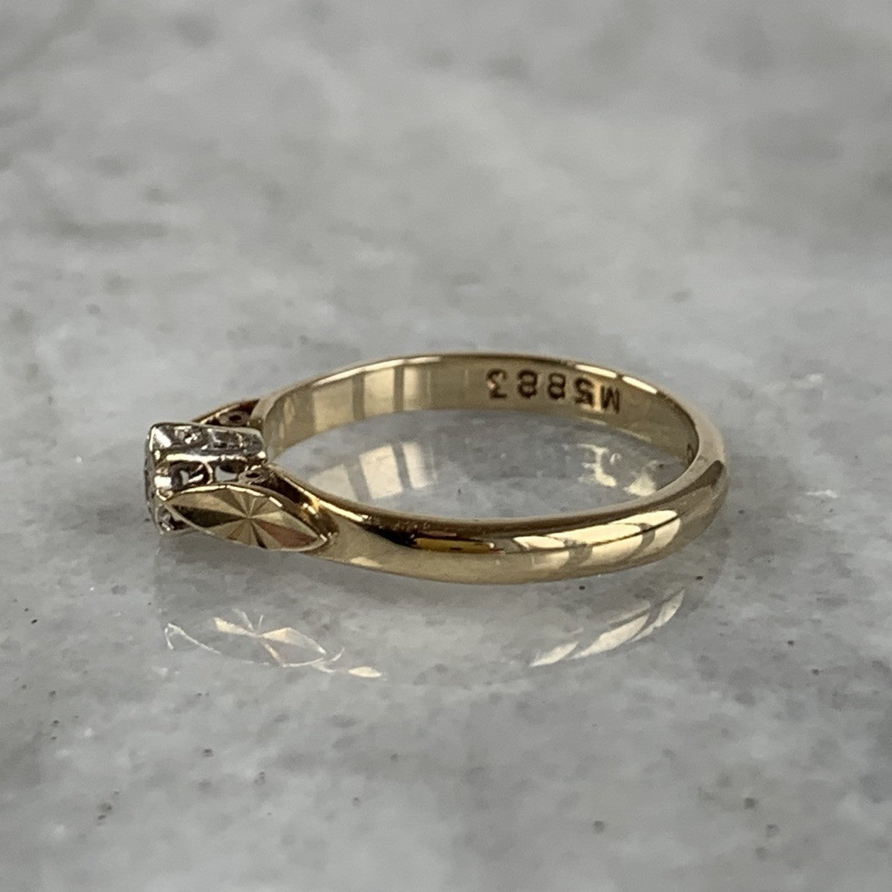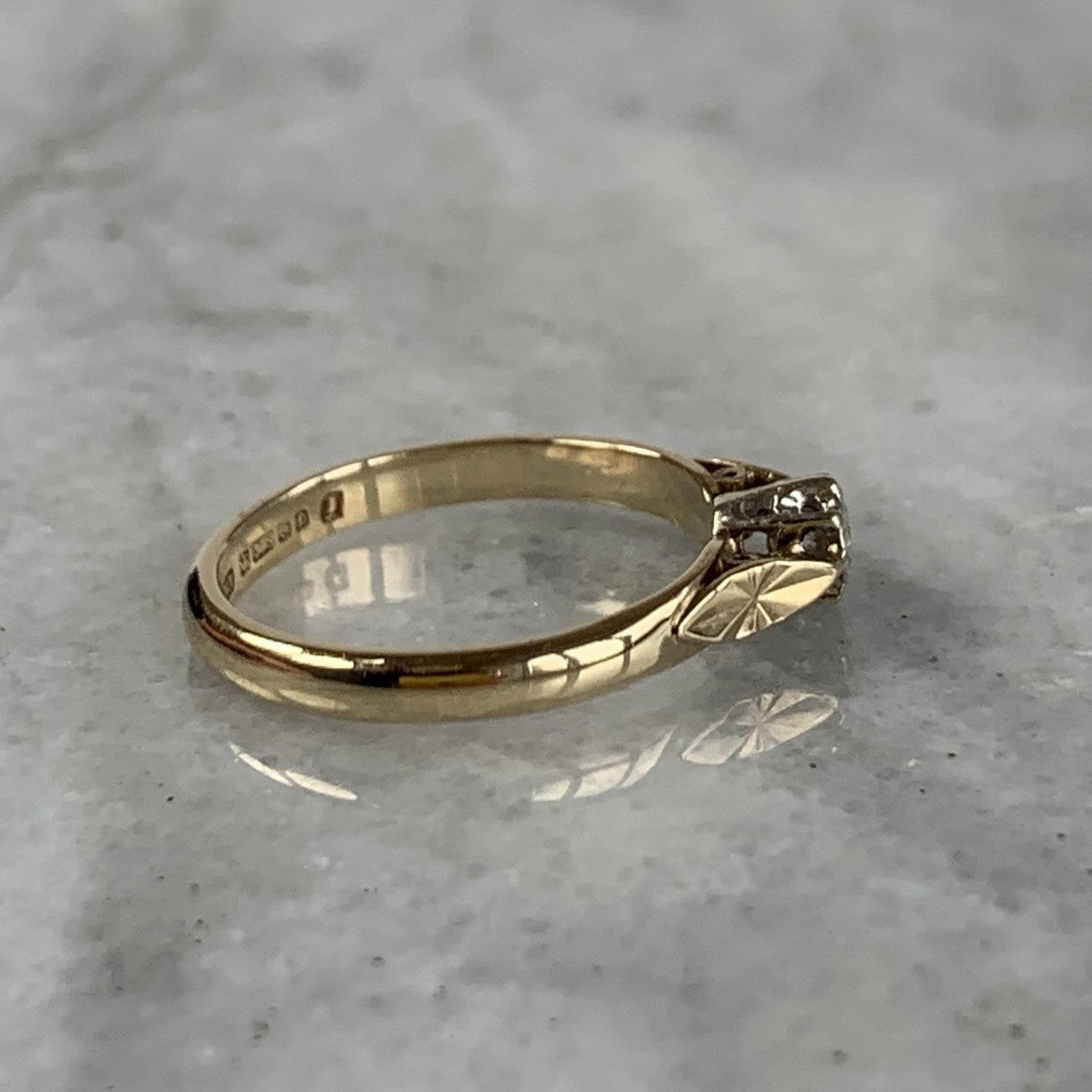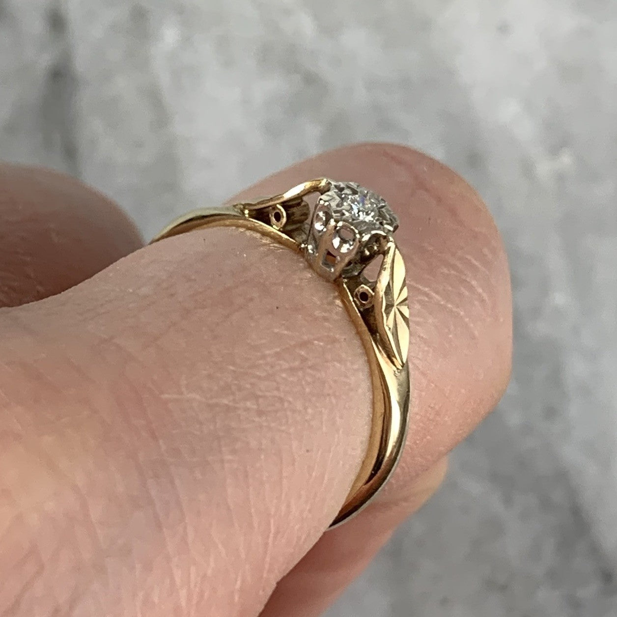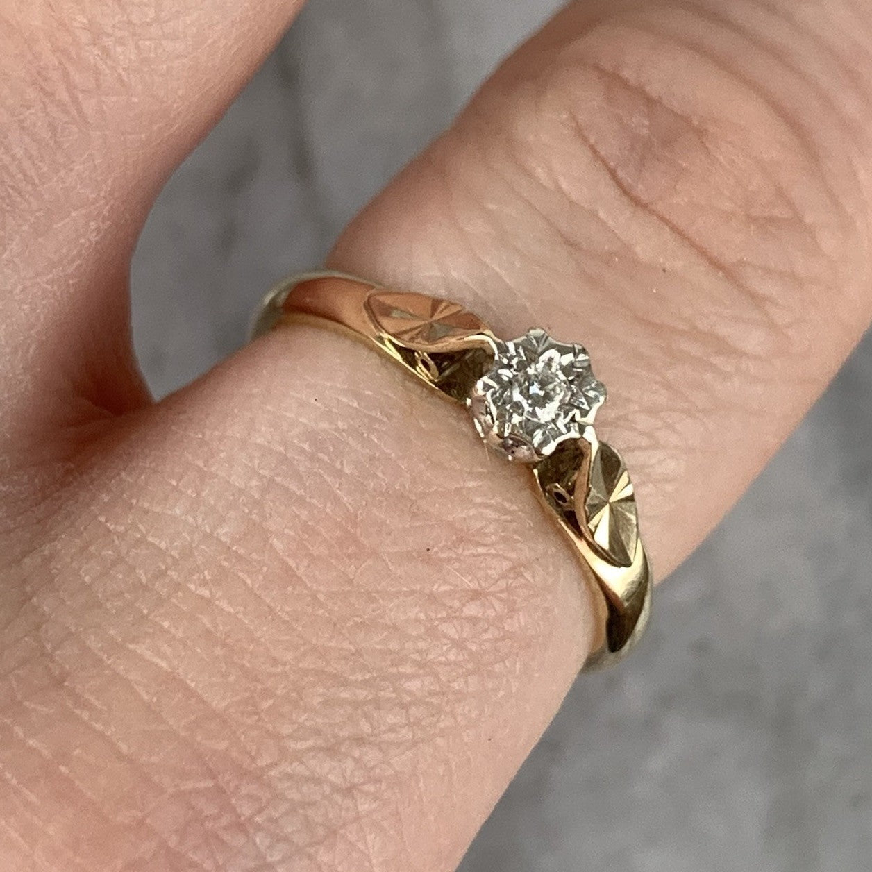 A stunning gold ring showcasing a solitaire illusion set diamond upon cathedral style embossed shoulders.