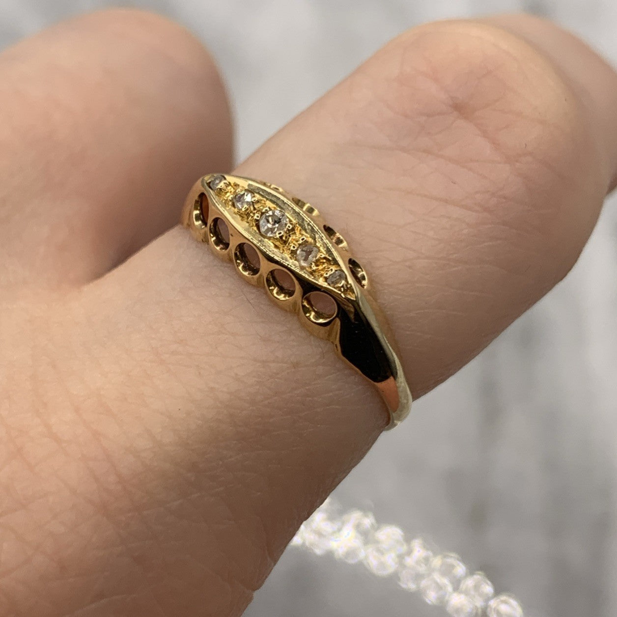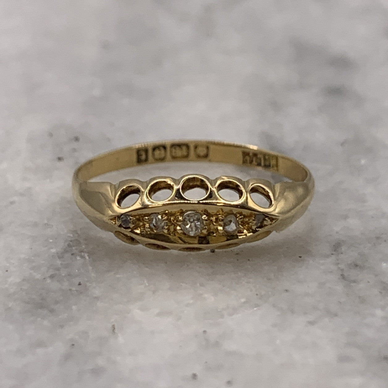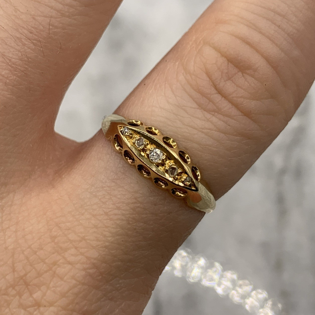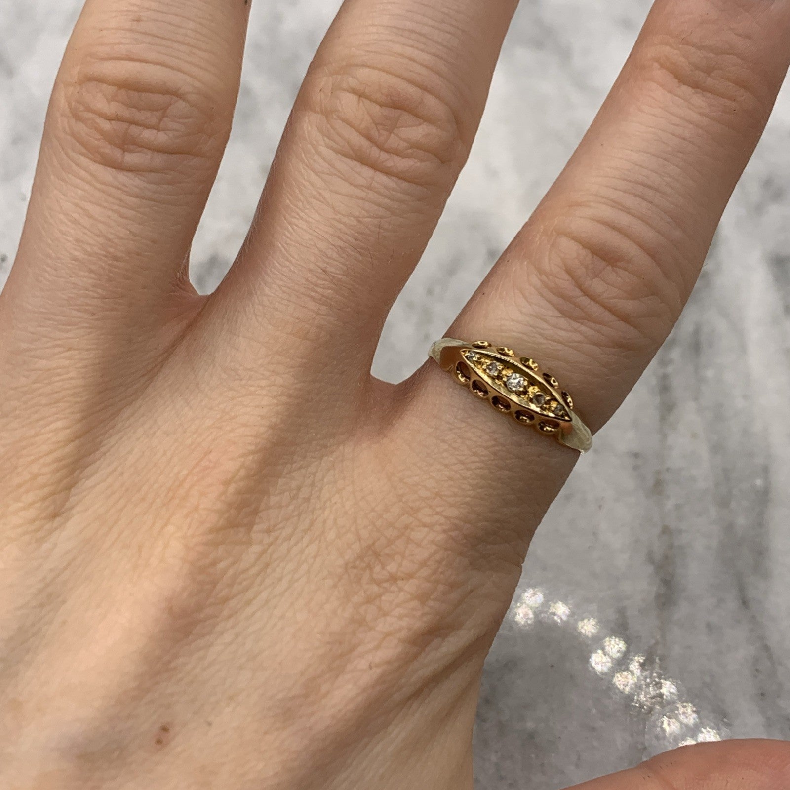 A stunning gold boat style ring showcasing five old cut diamonds.