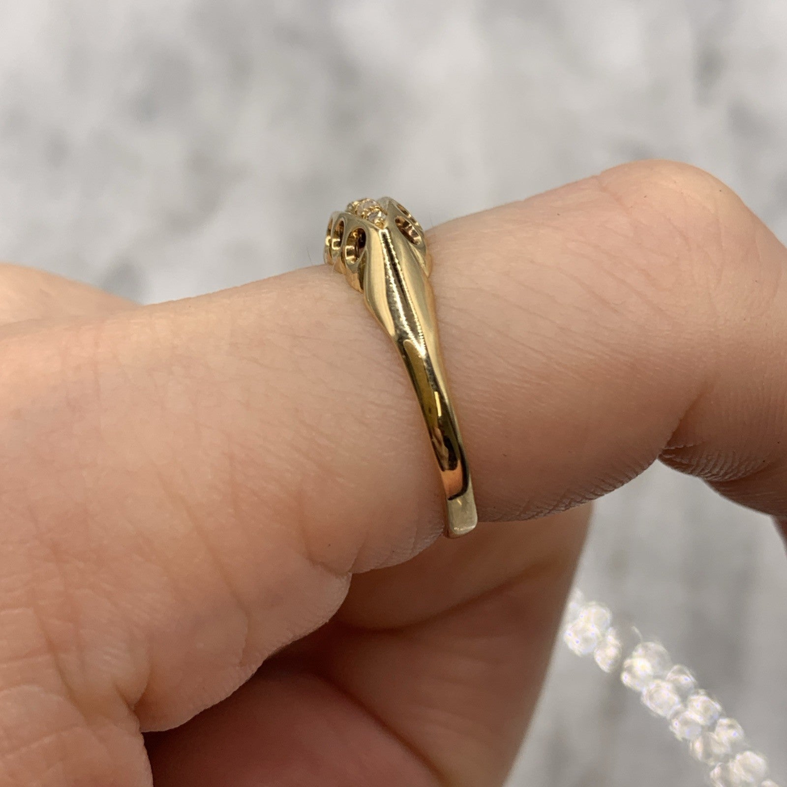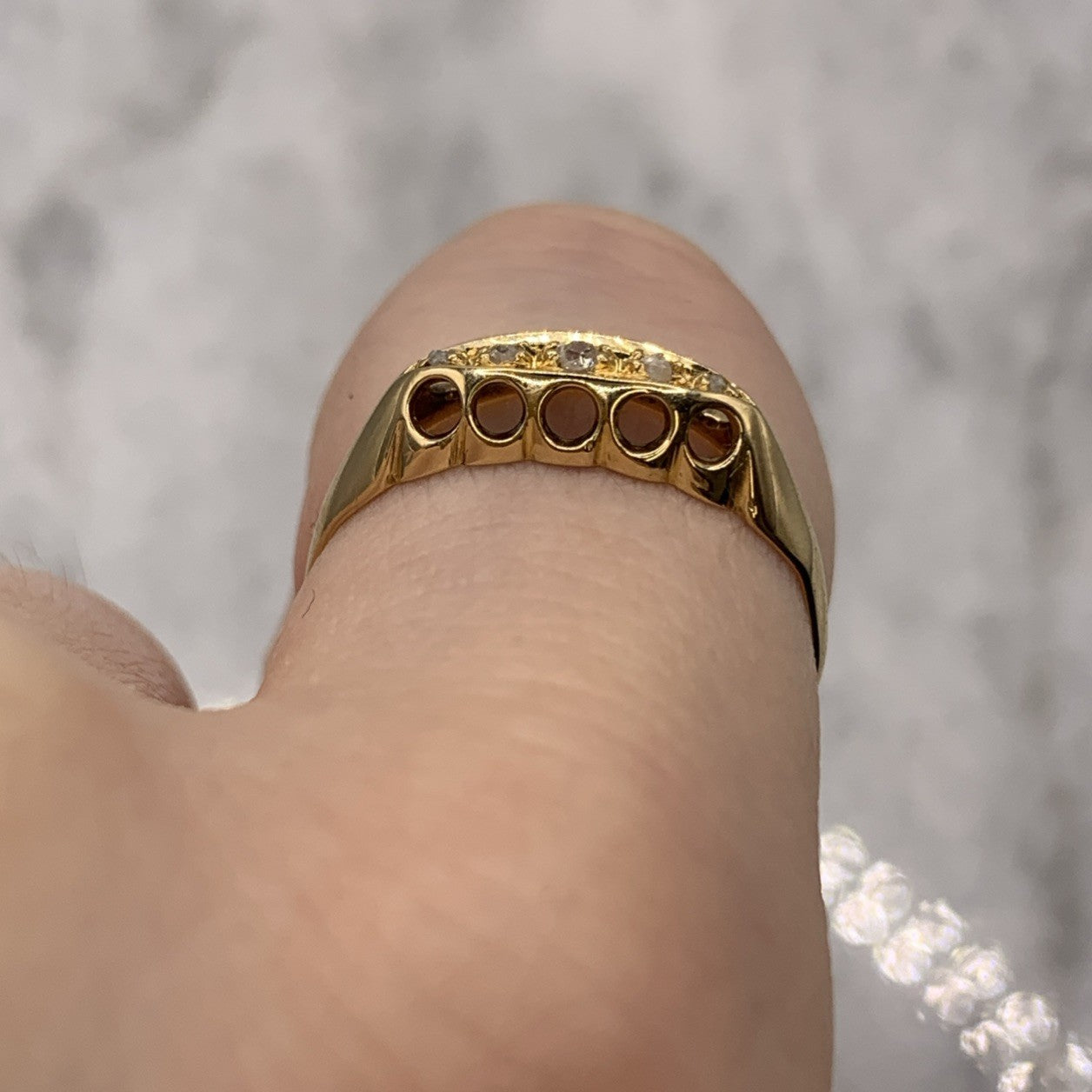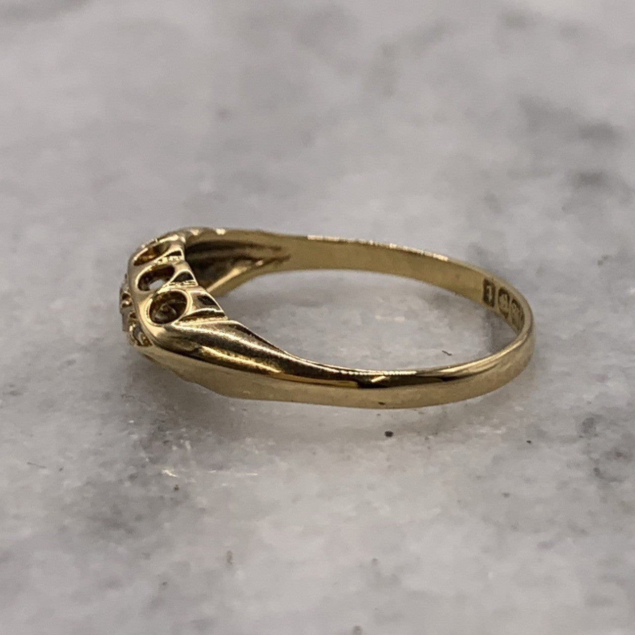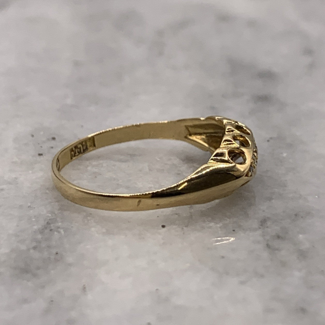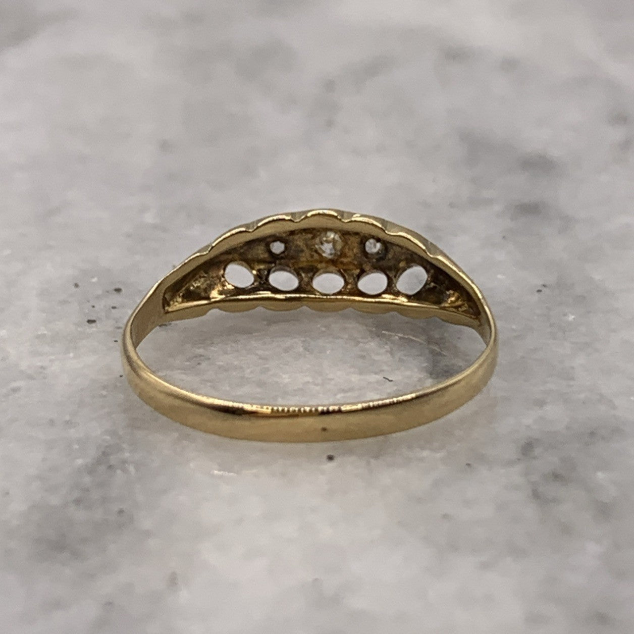 A stunning gold boat style ring showcasing five old cut diamonds.