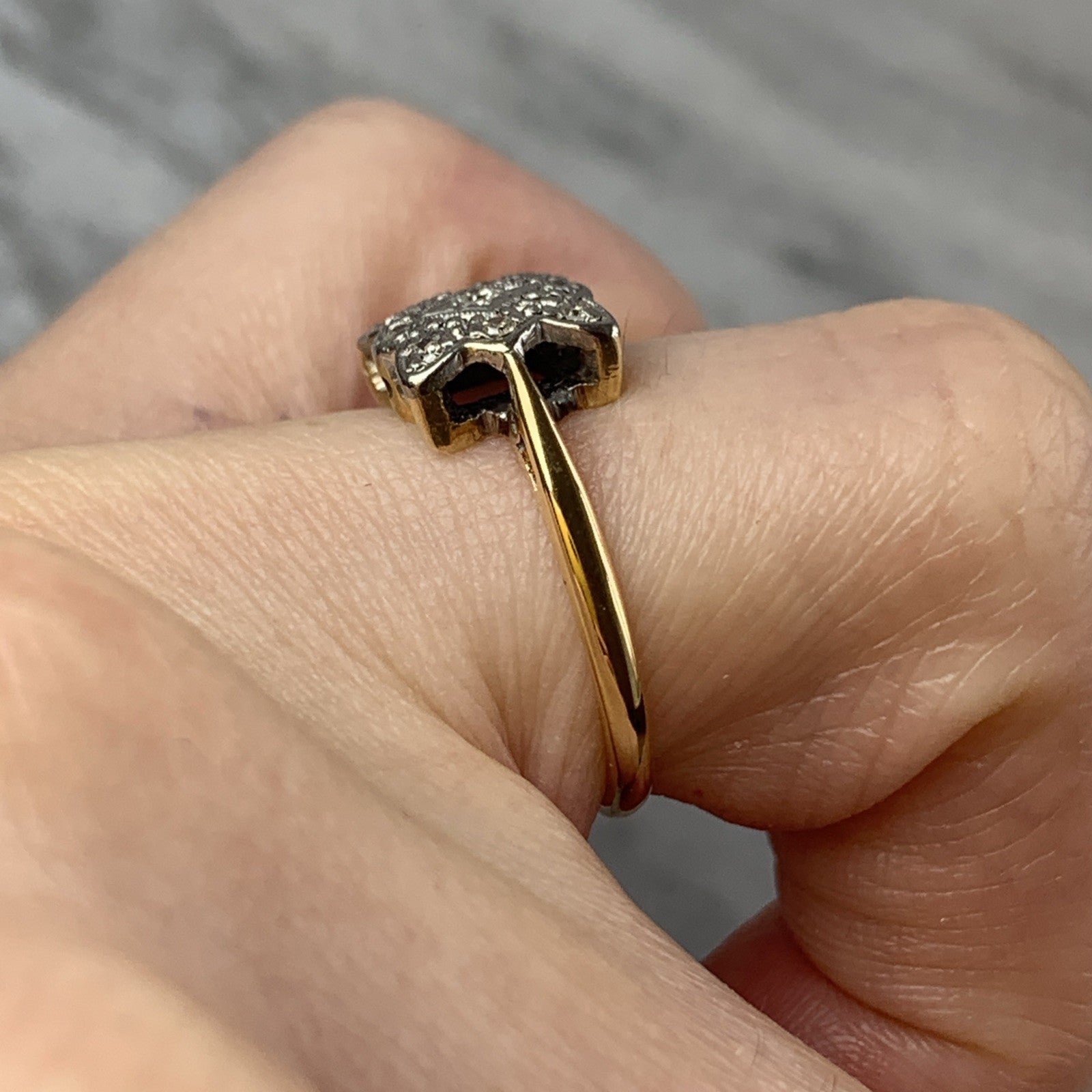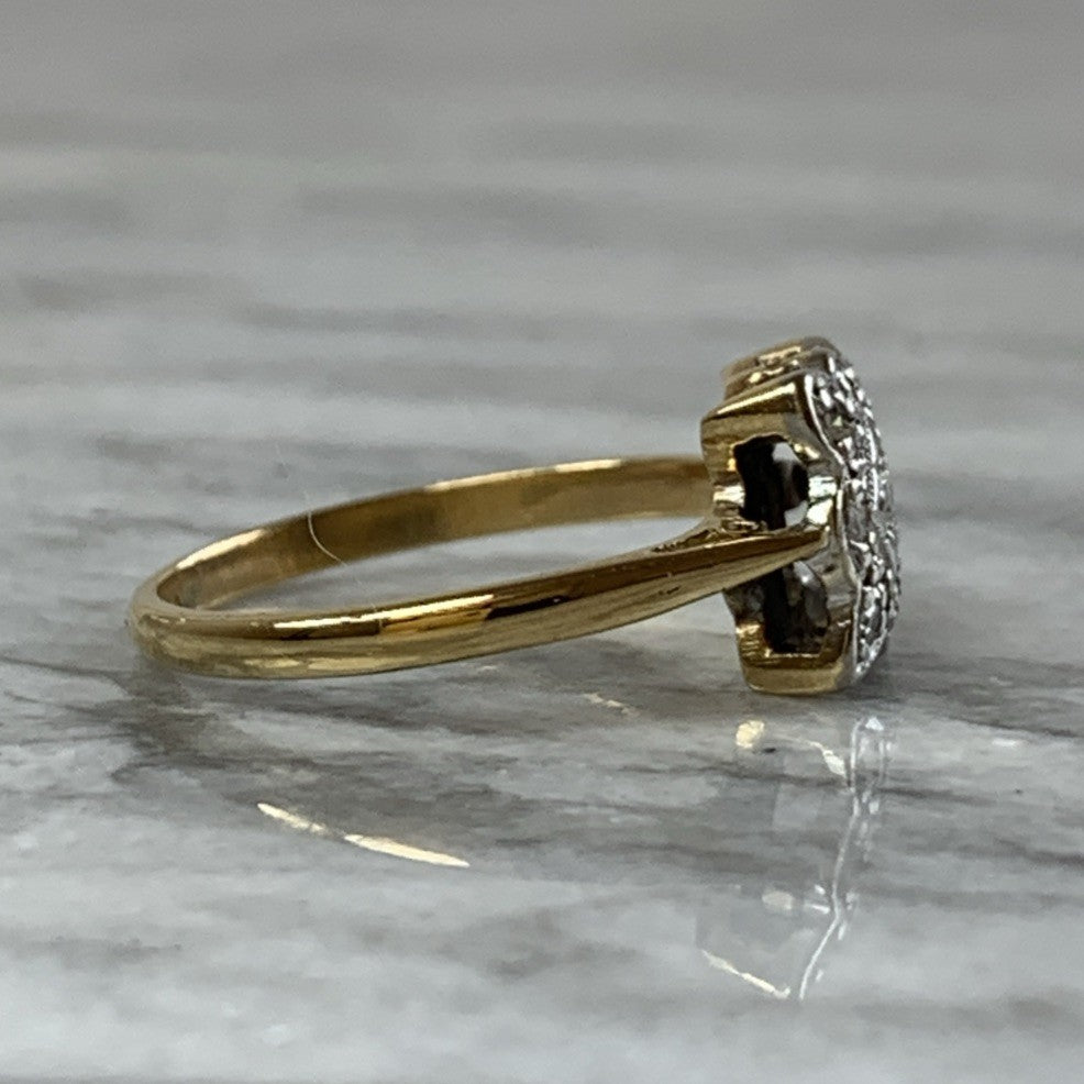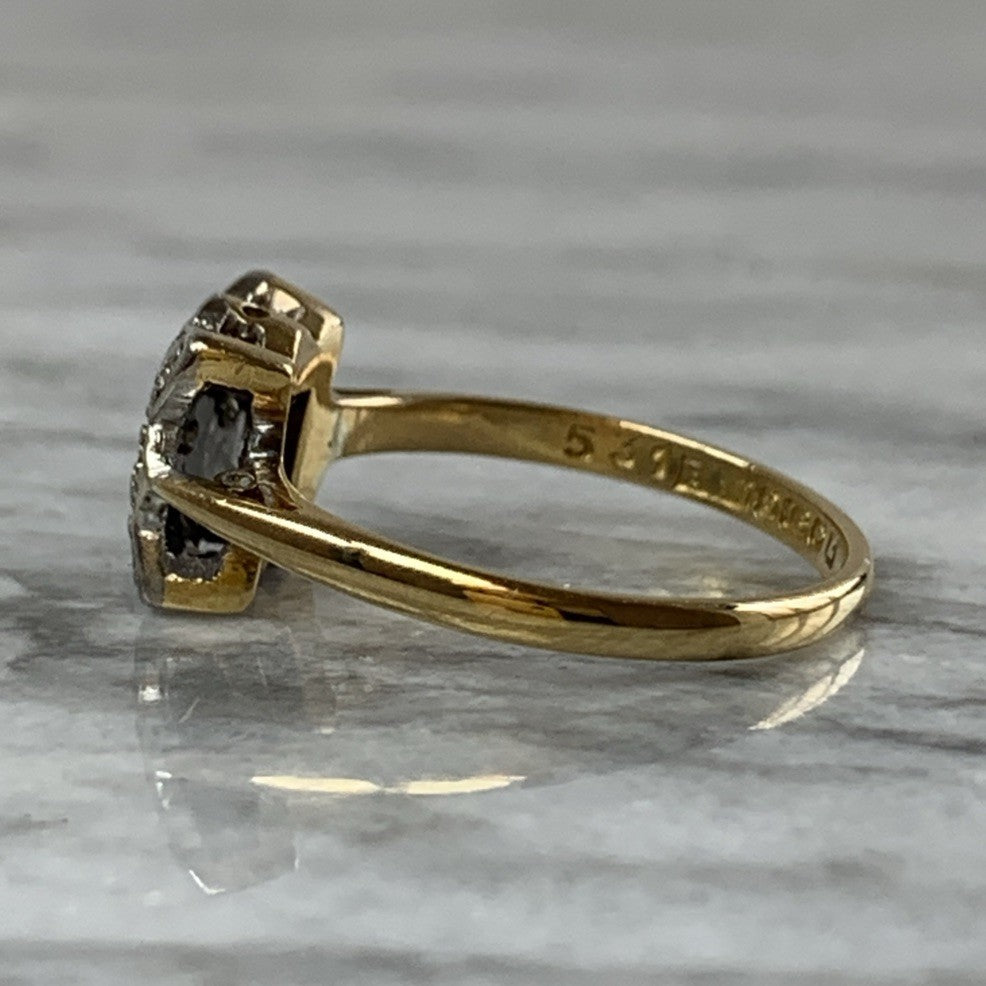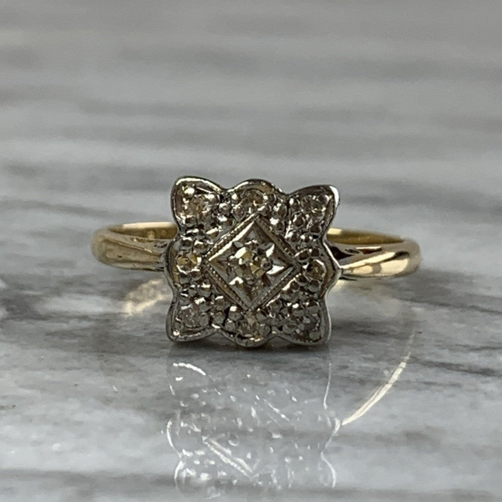 A stunning gold ring featuring a collection of diamonds in a floral platinum setting.