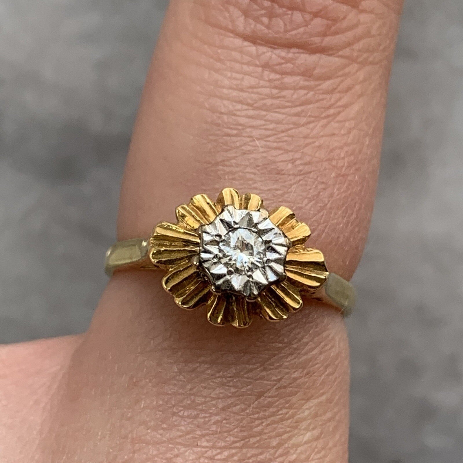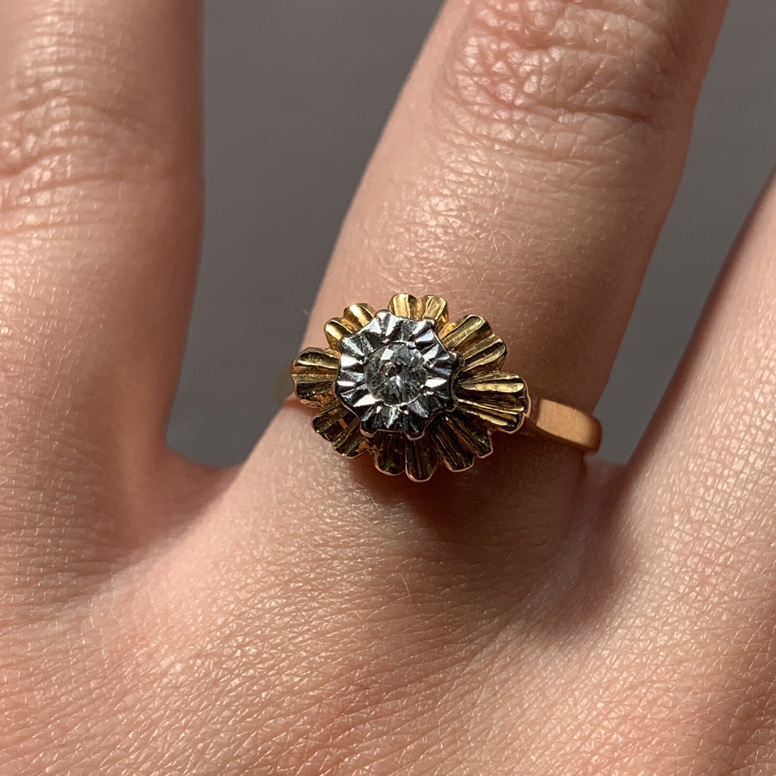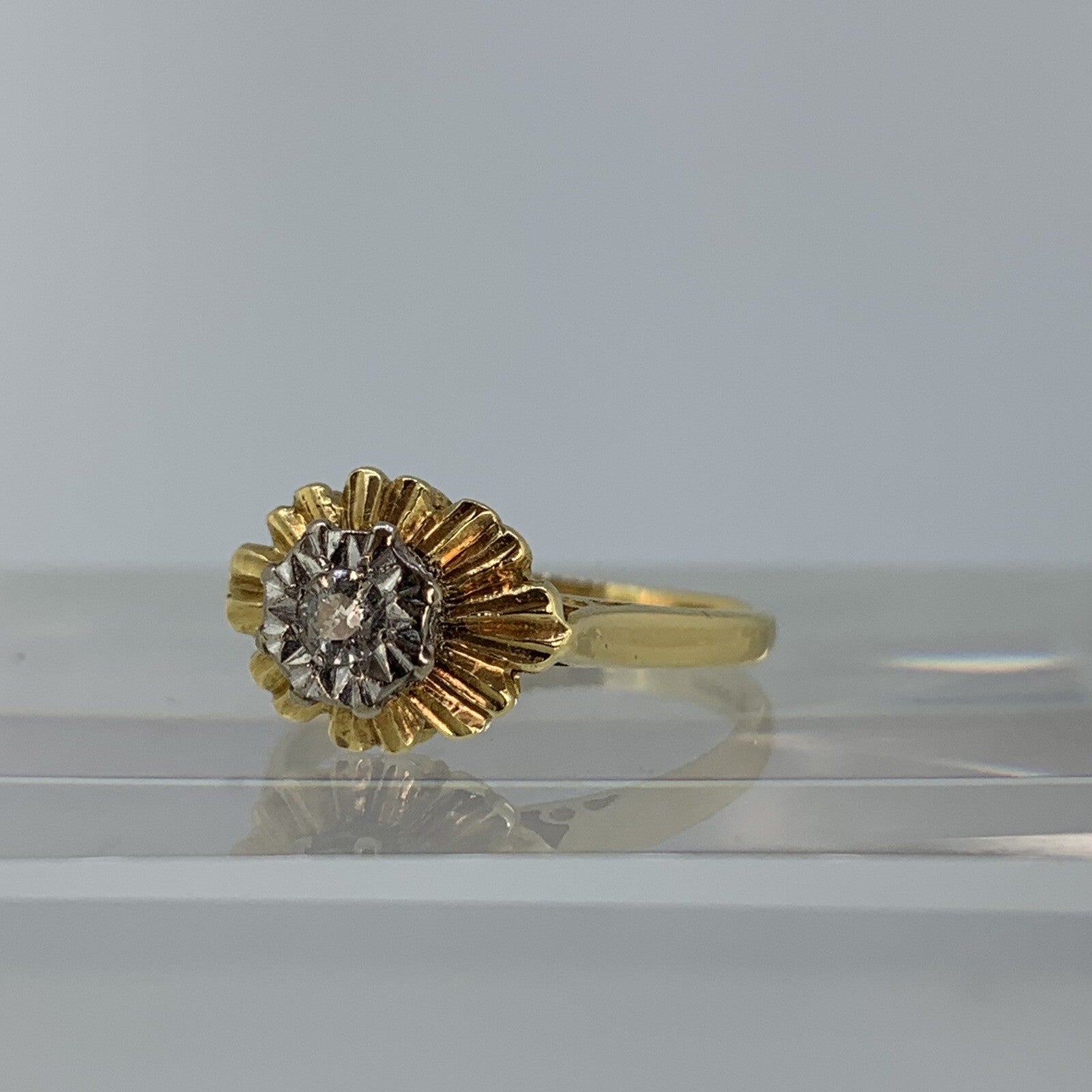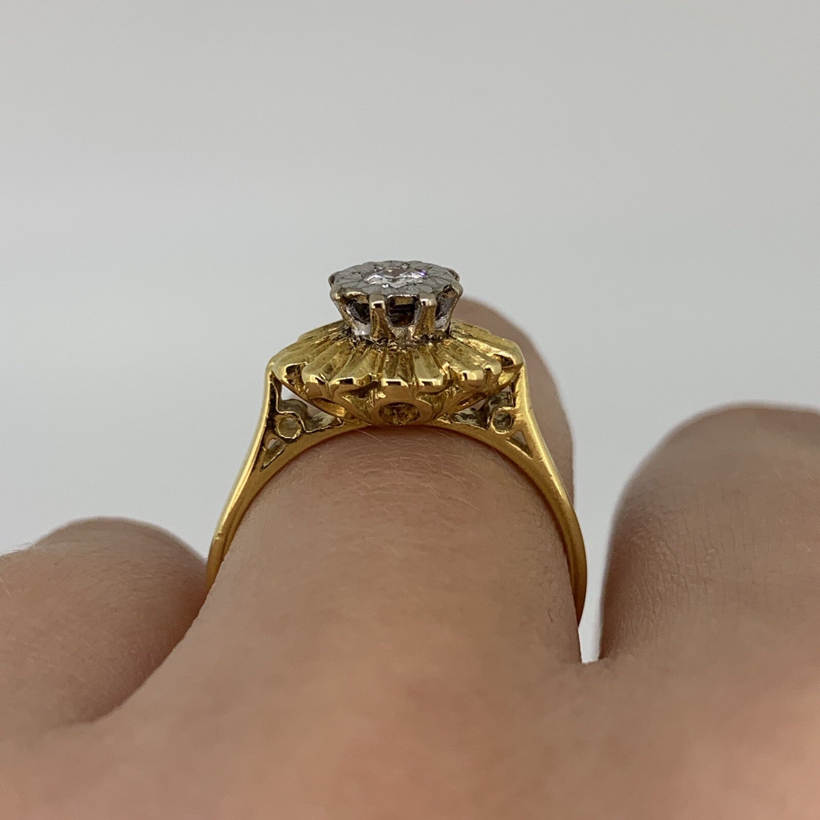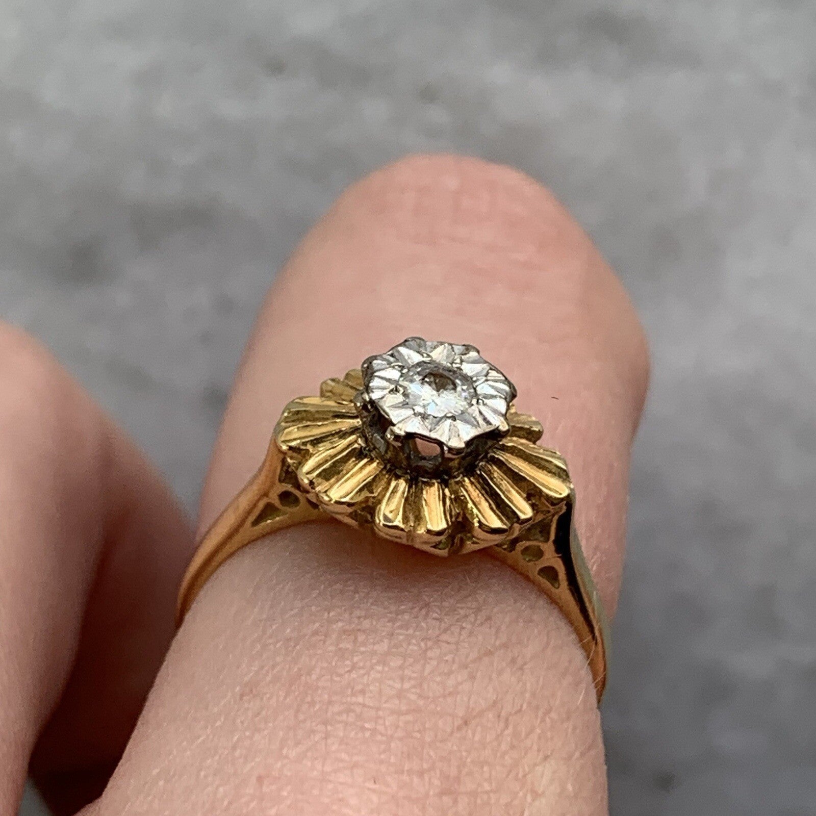 Diamond Ring 18ct Gold Retro Sunburst Unique Yellow Gold & Platinum - Size M