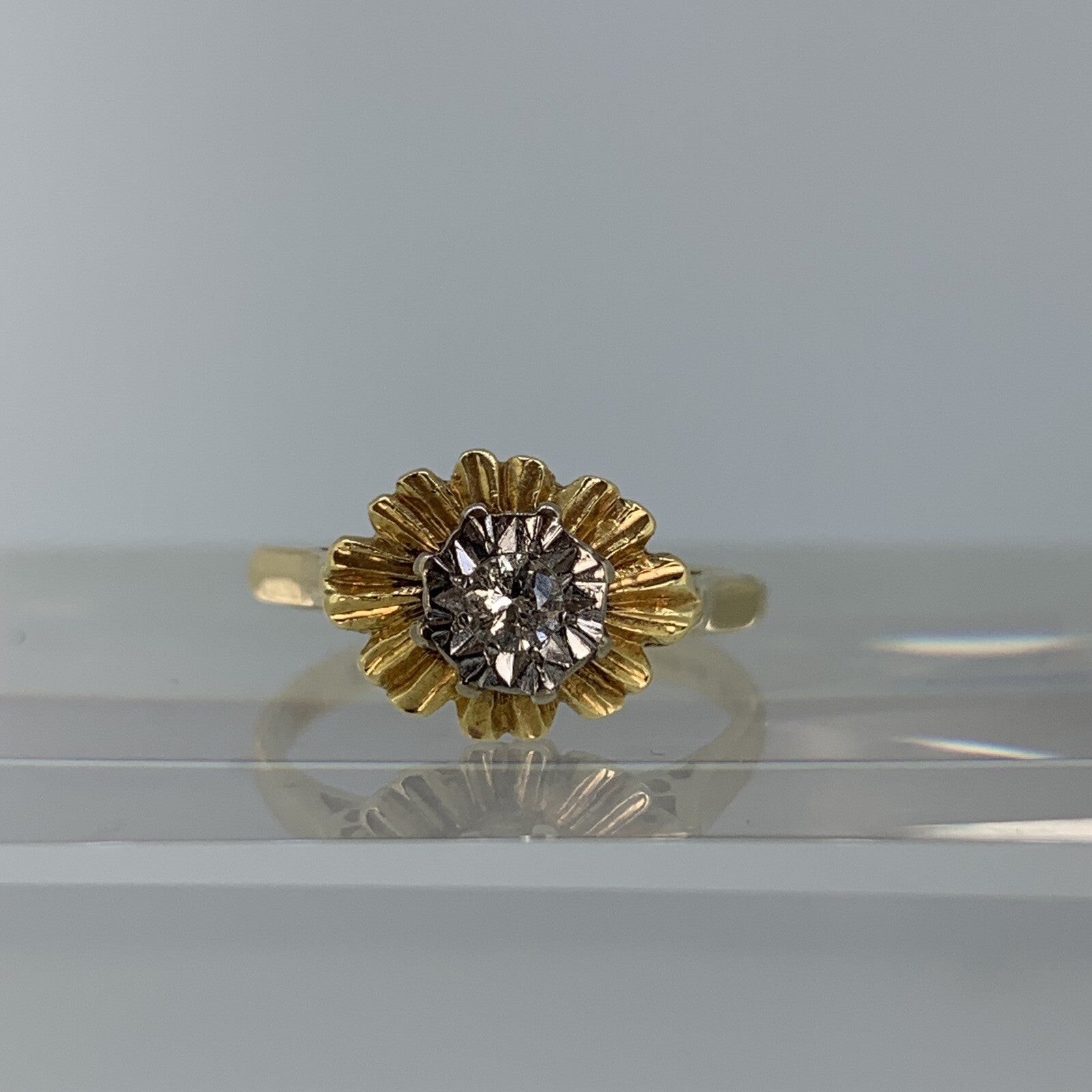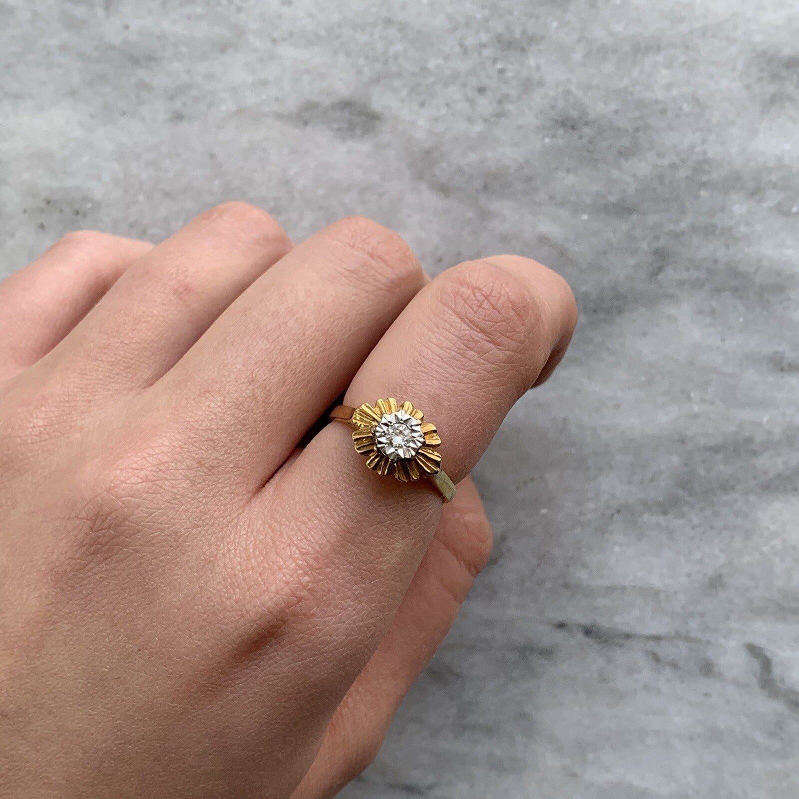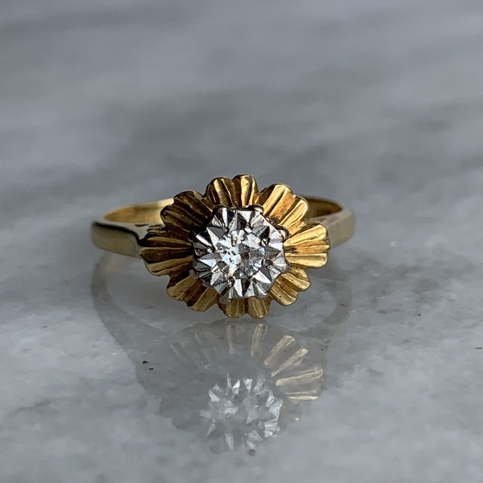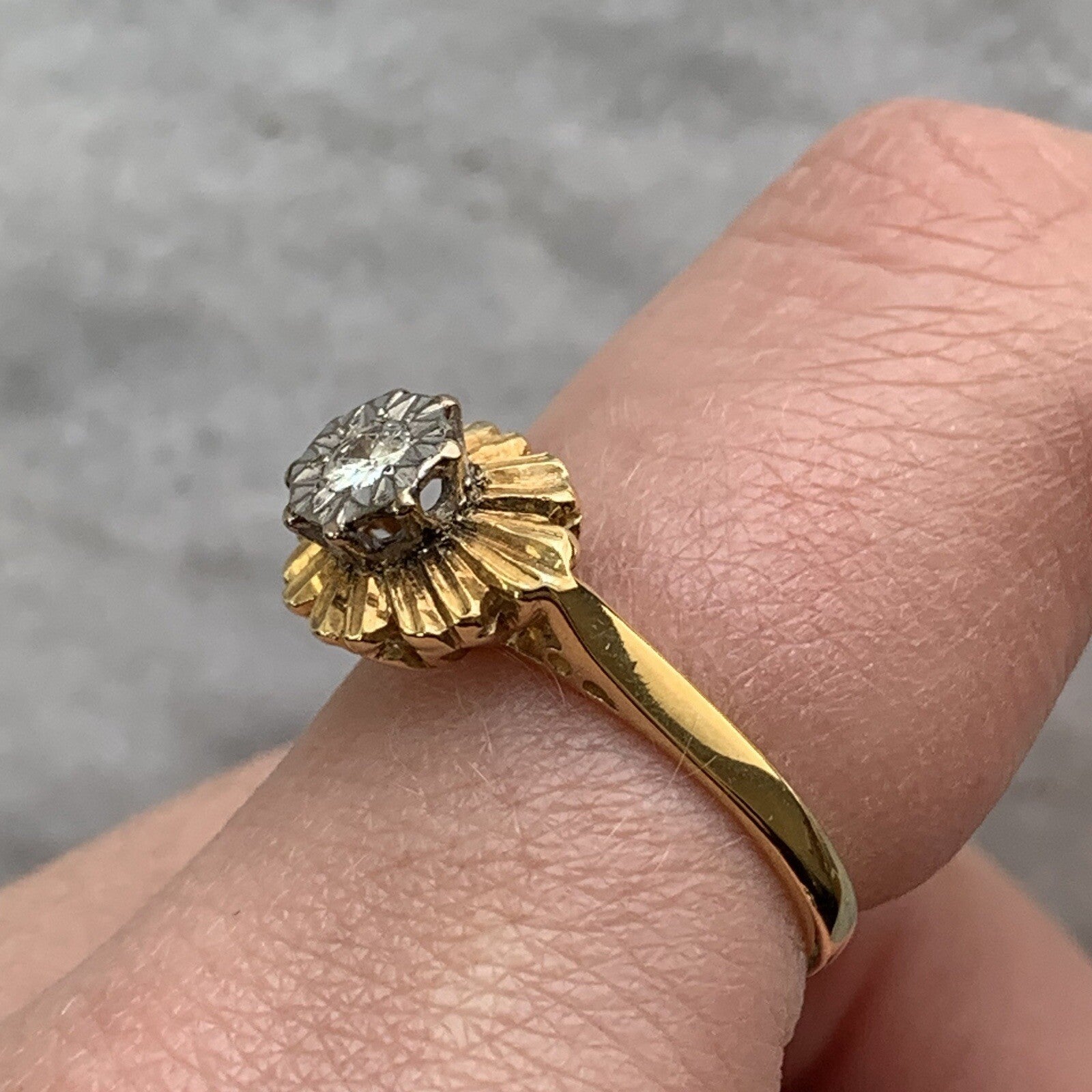 Diamond Ring 18ct Gold Retro Sunburst Unique Yellow Gold & Platinum - Size M