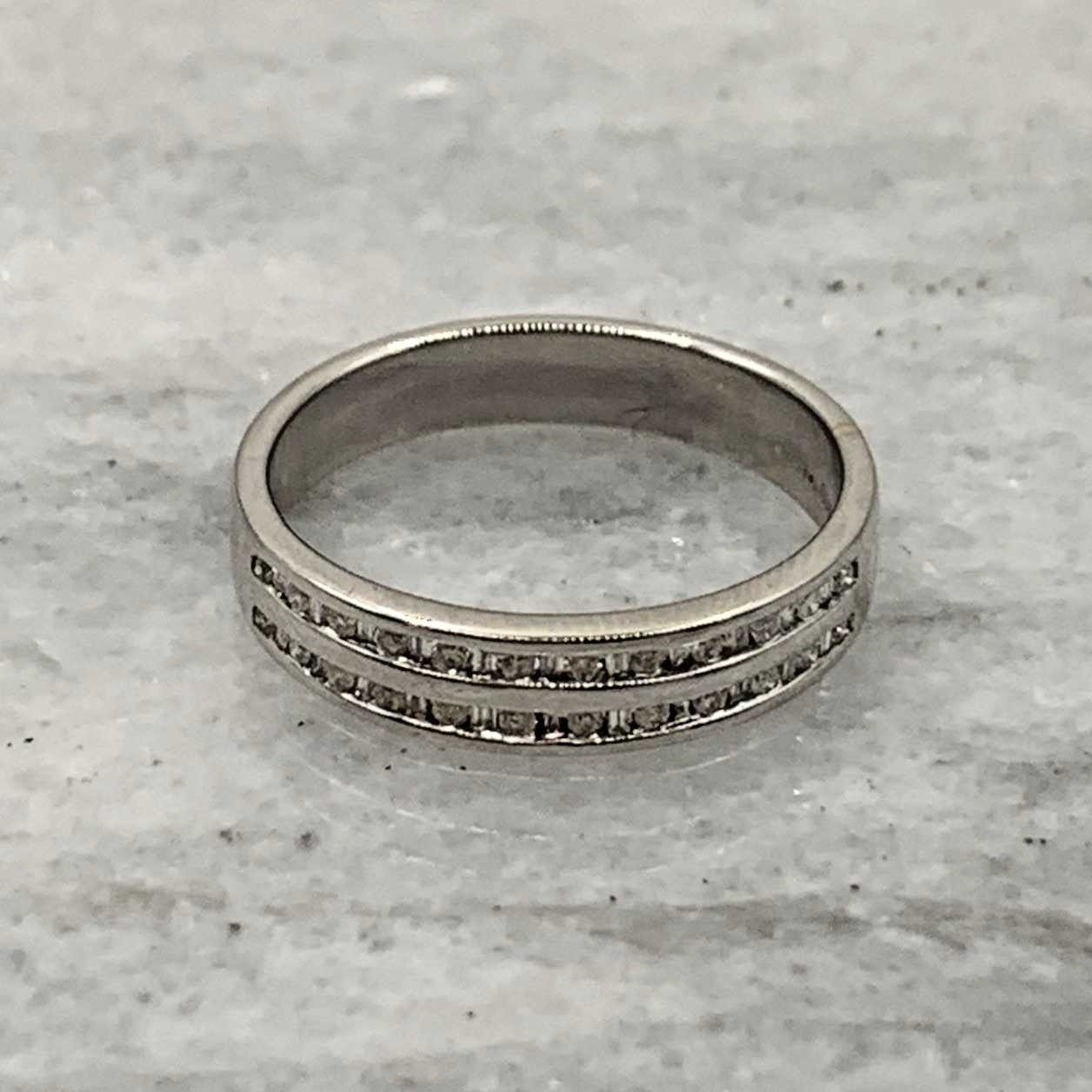 A classy white gold band ring featuring parallel channels of alternating round and baguette cut diamonds.